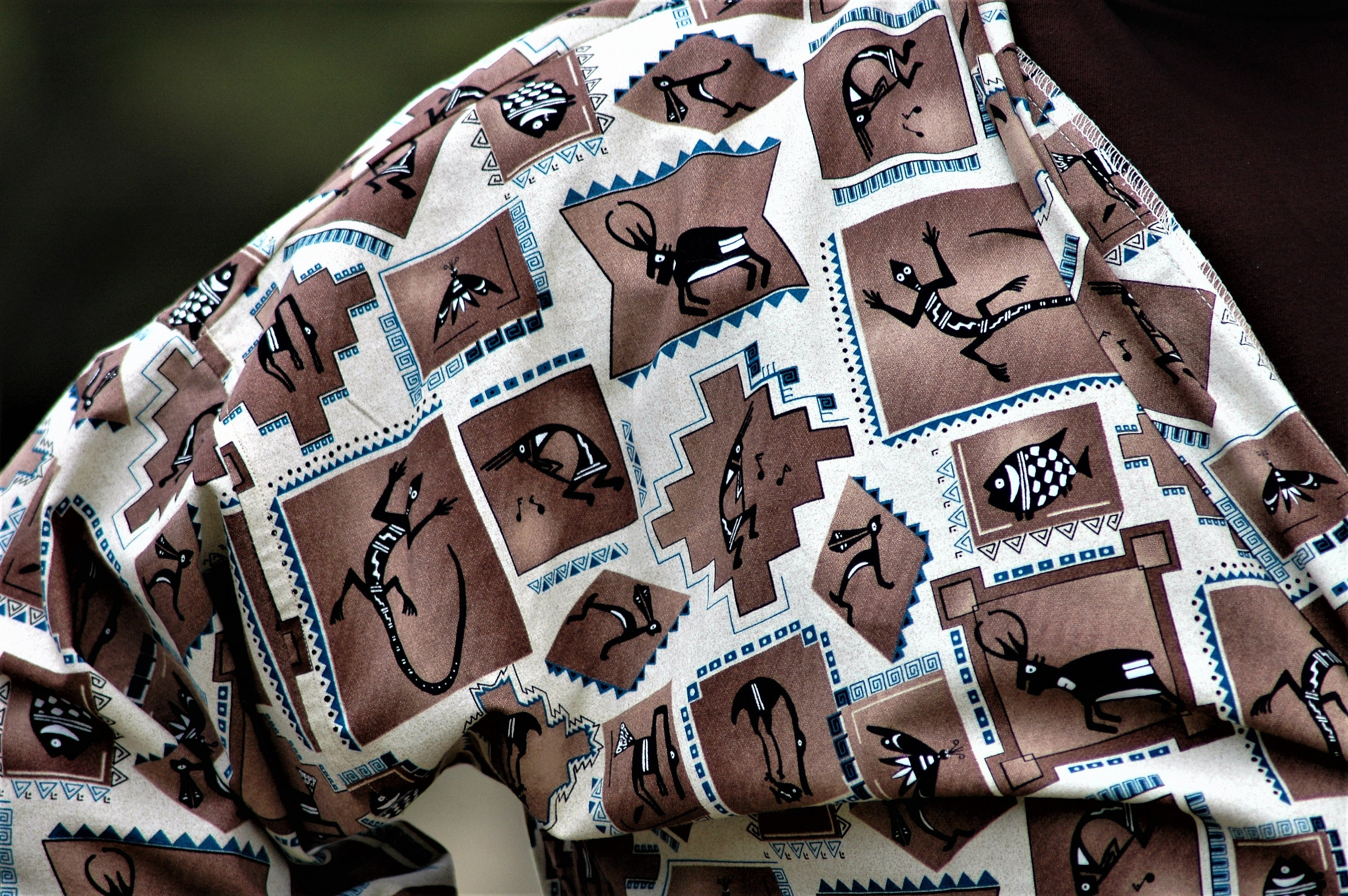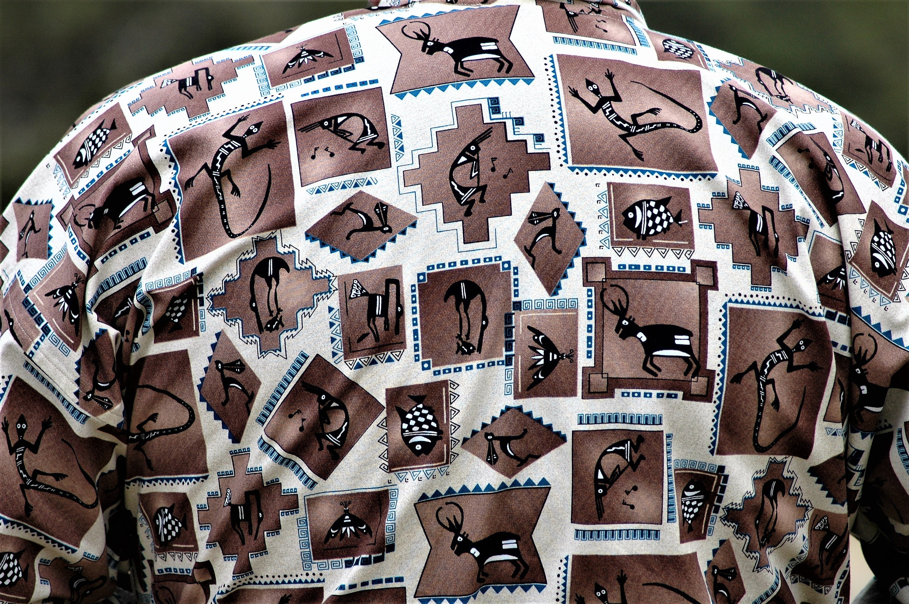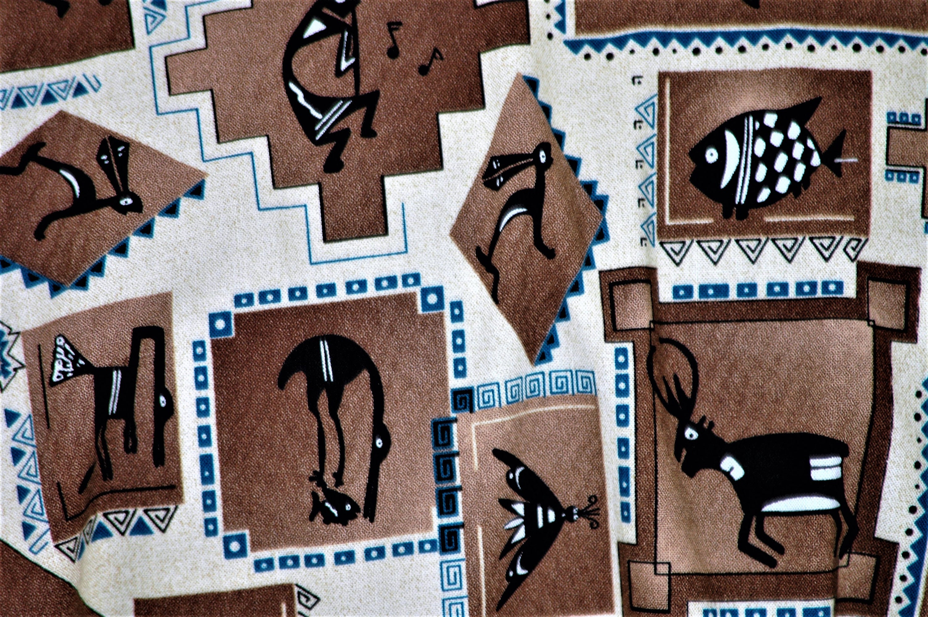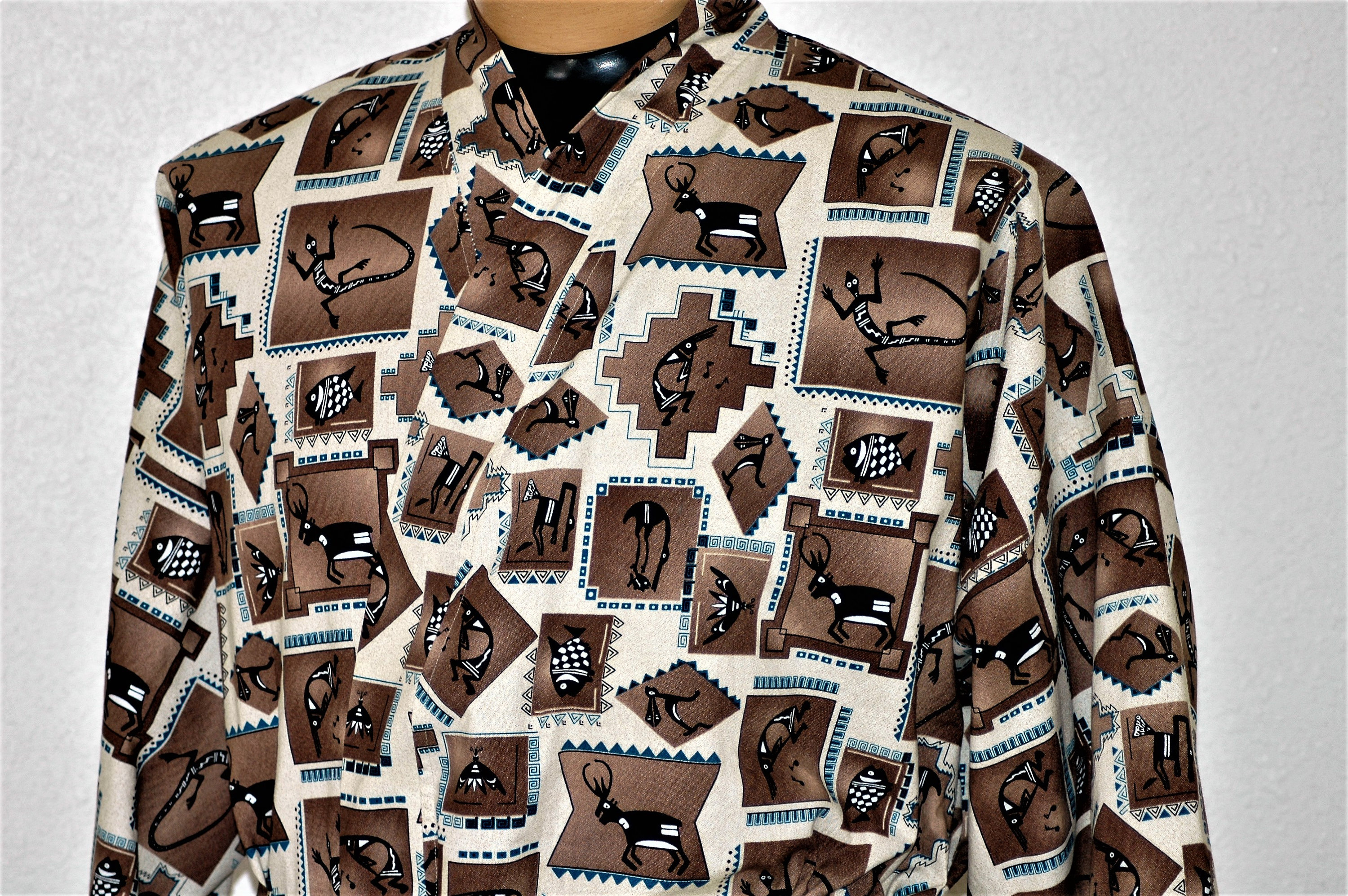 Native American totem animals are screen printed on this robe with all the powers they offer, though not all tribes held all these beliefs as an example