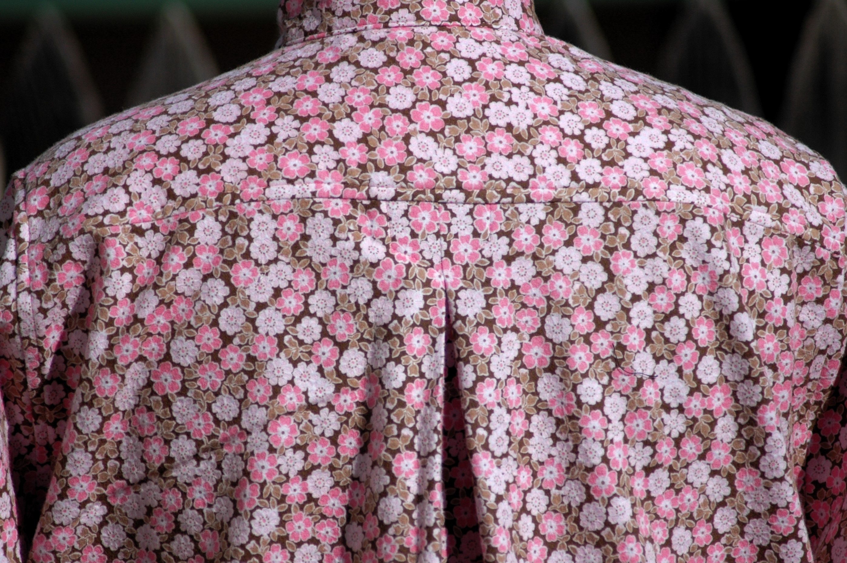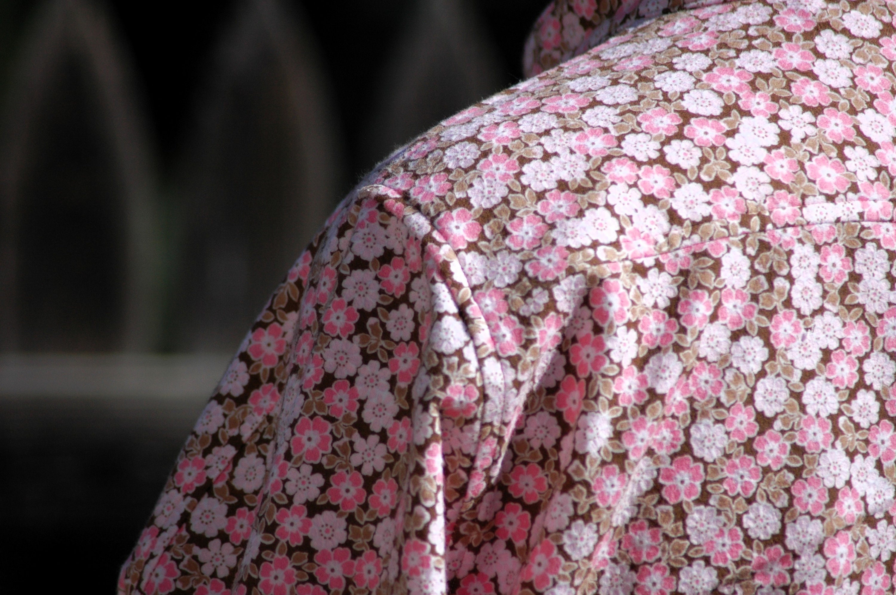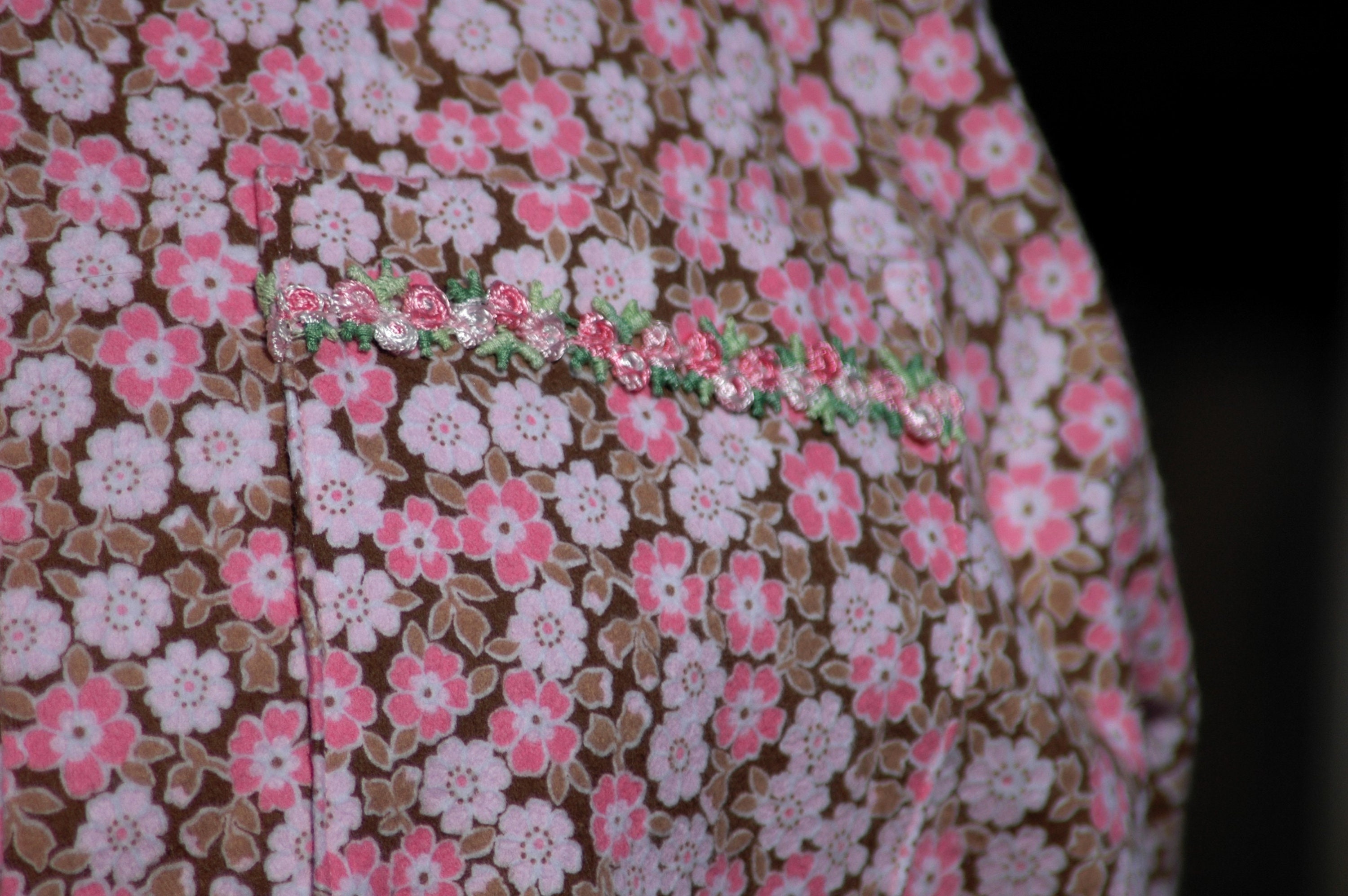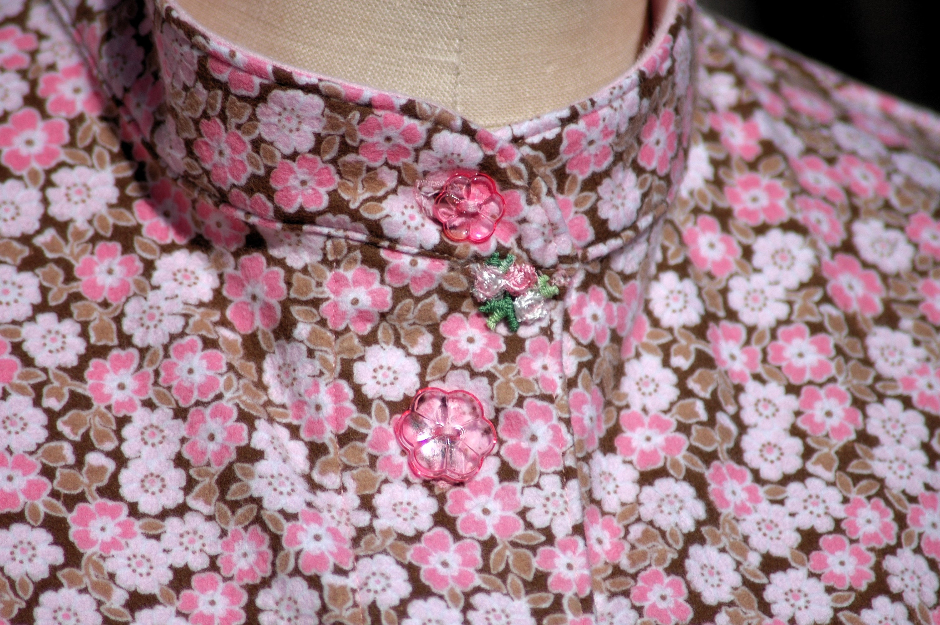 2: Rayon rosette trim on breast pocket, 3 flowers at bottom of the collar