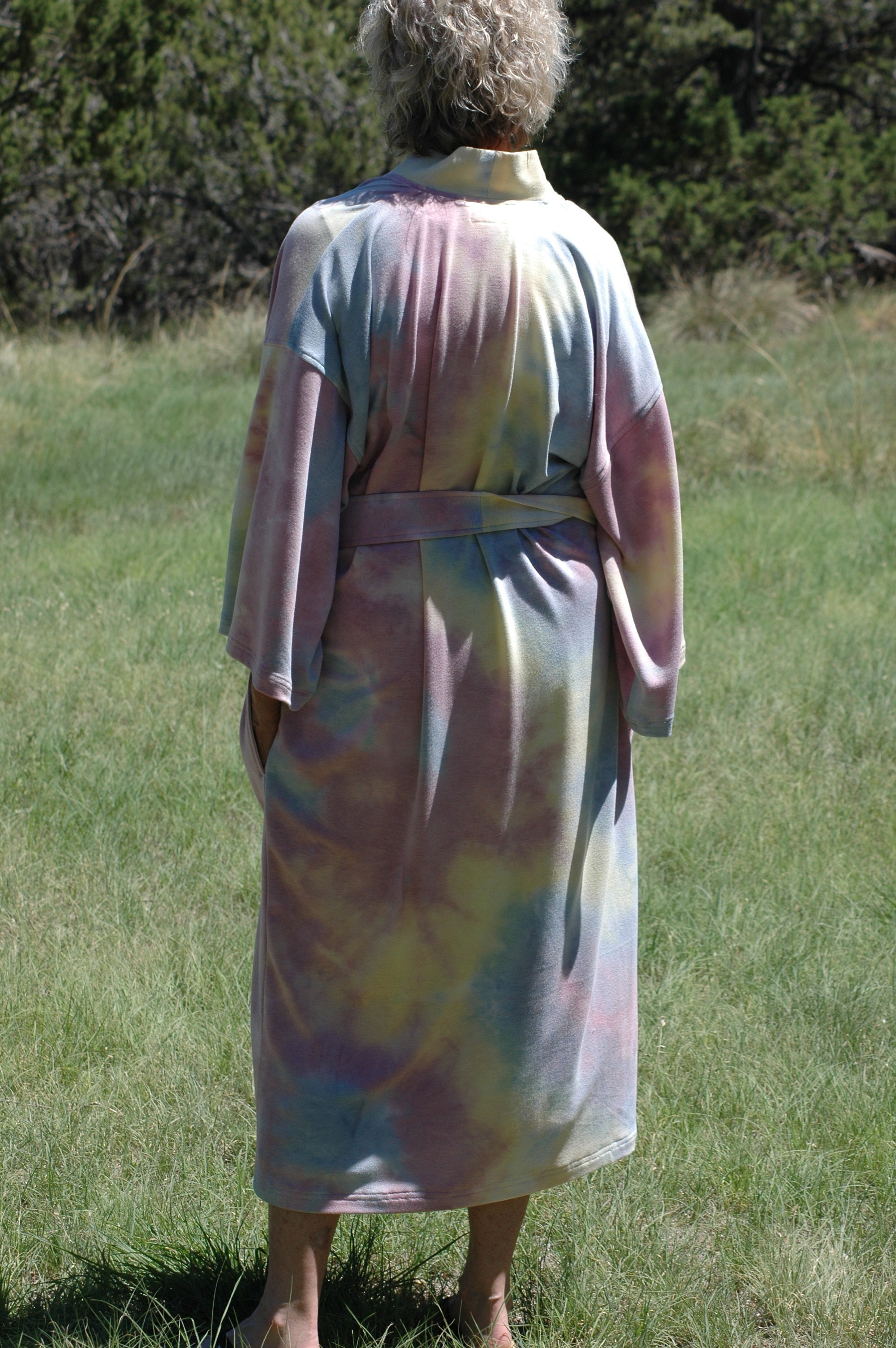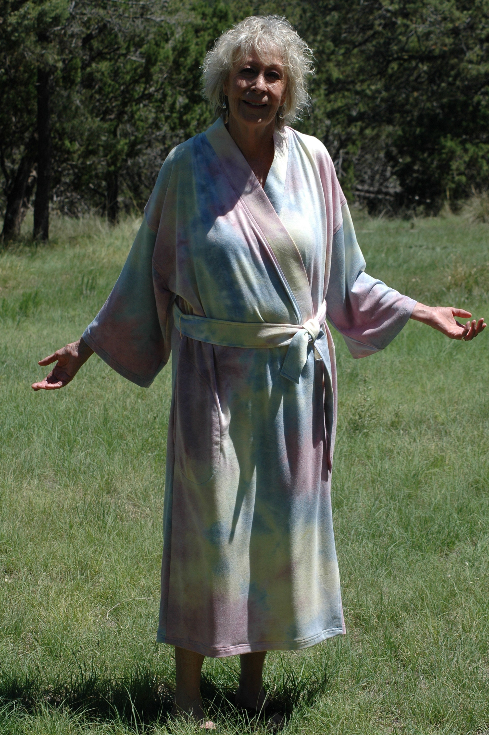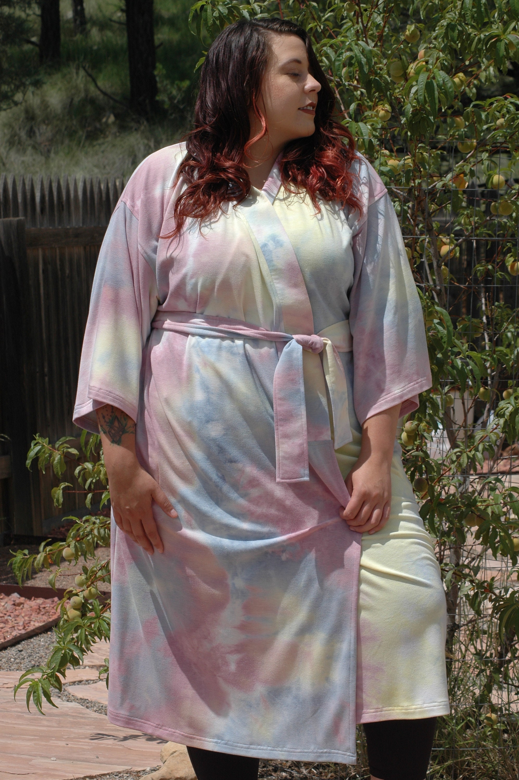 Plus Sizes Tie dye wrap kimono robe in sun set hues in mid calf length.