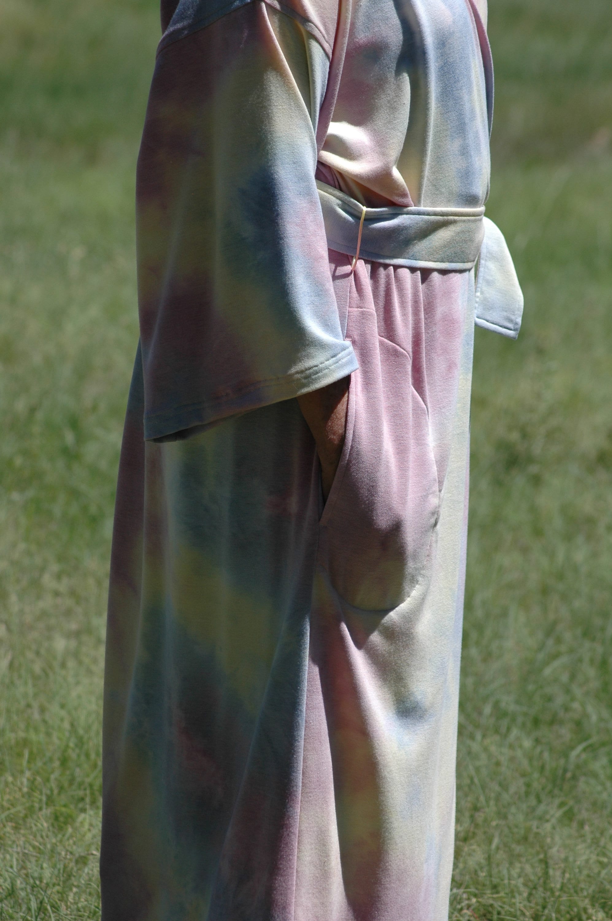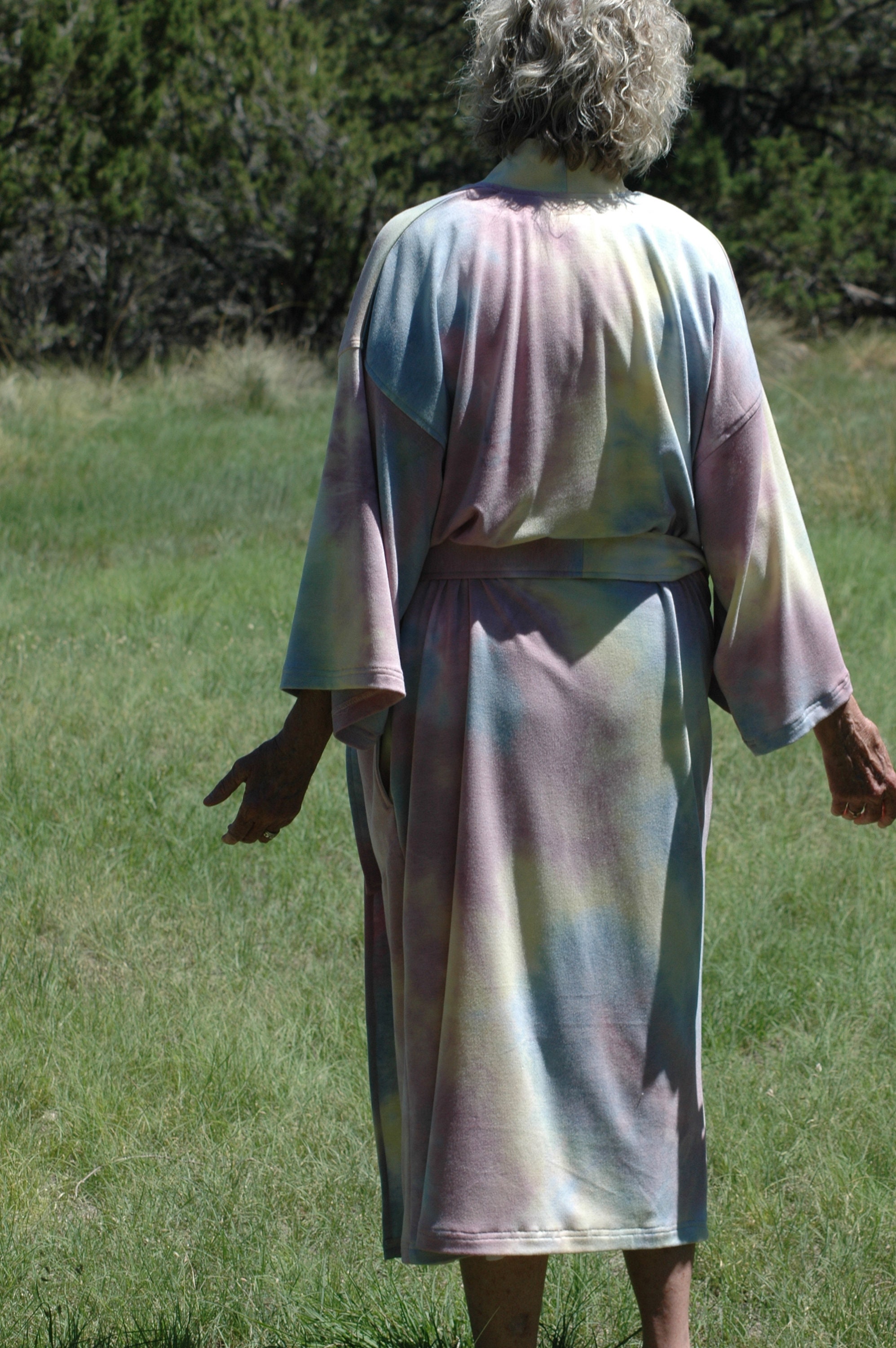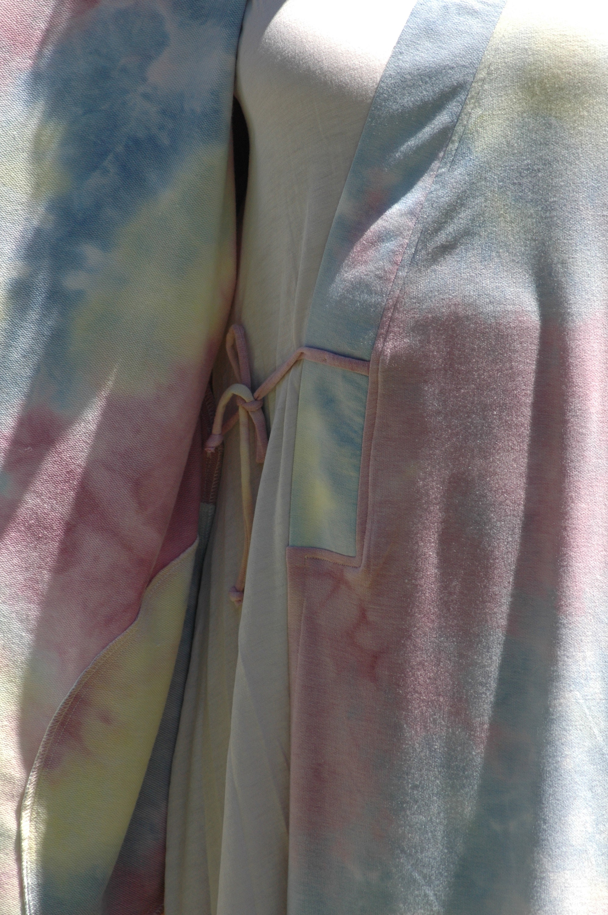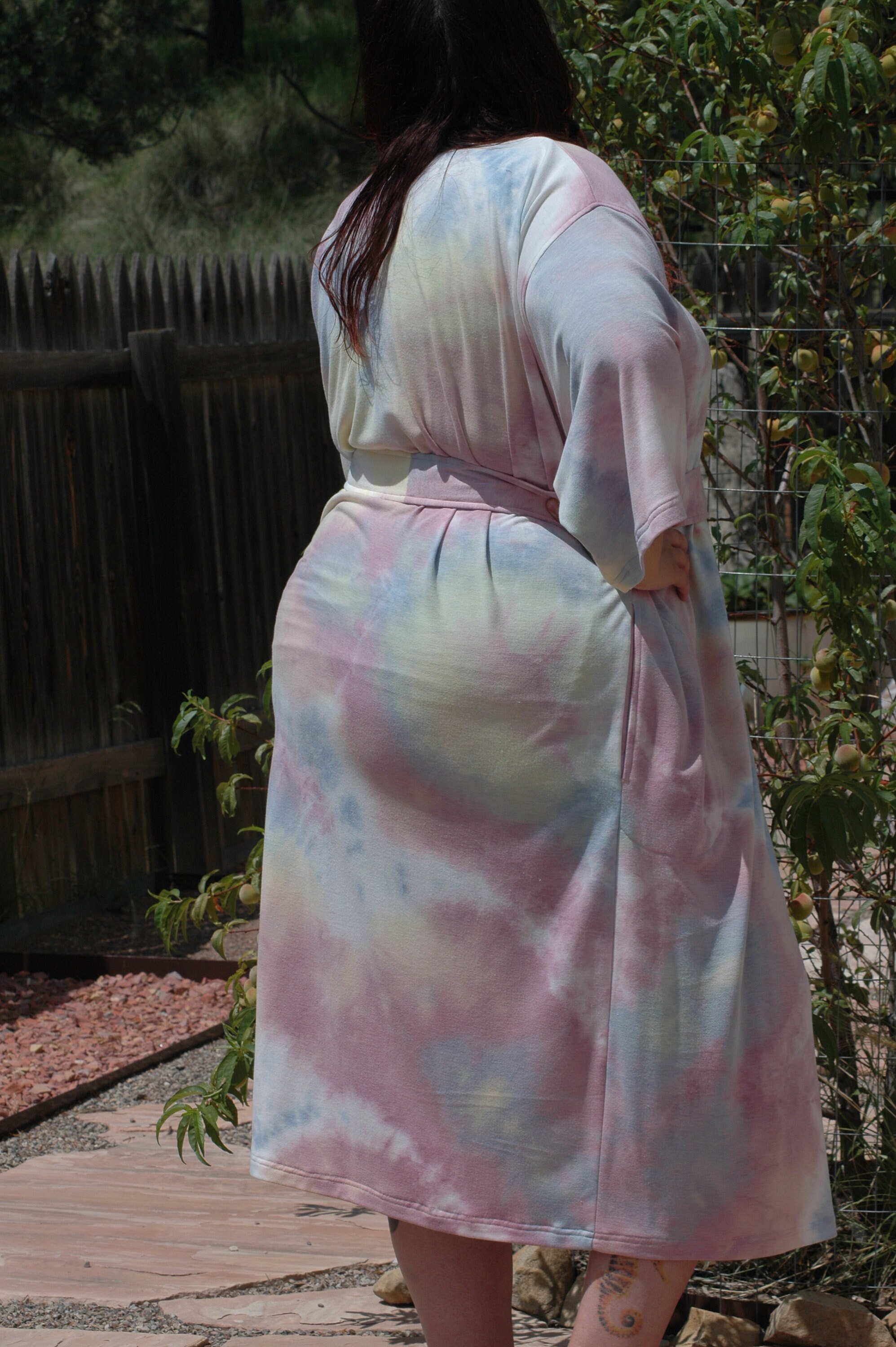 Plus Sizes Tie dye wrap kimono robe in sun set hues in mid calf length.
