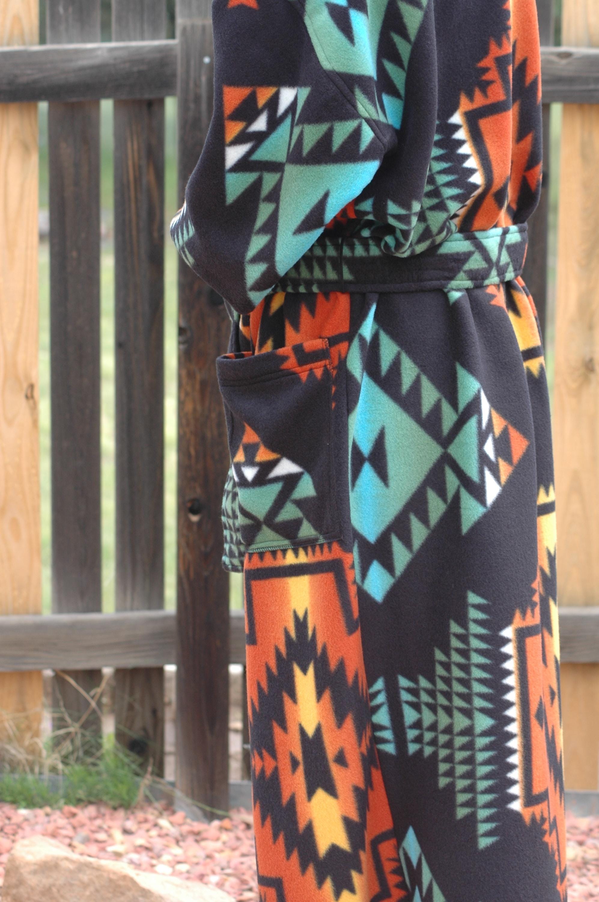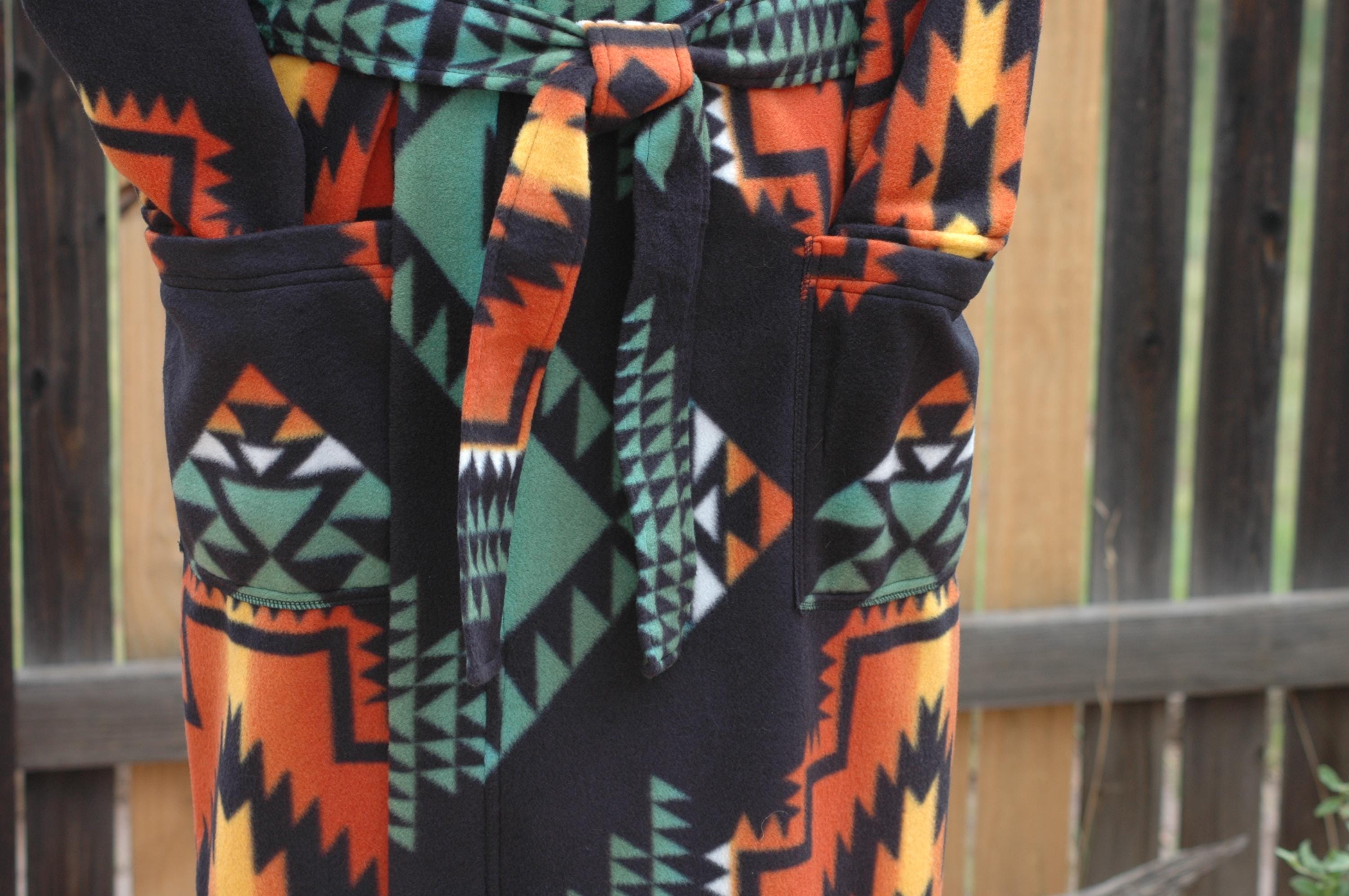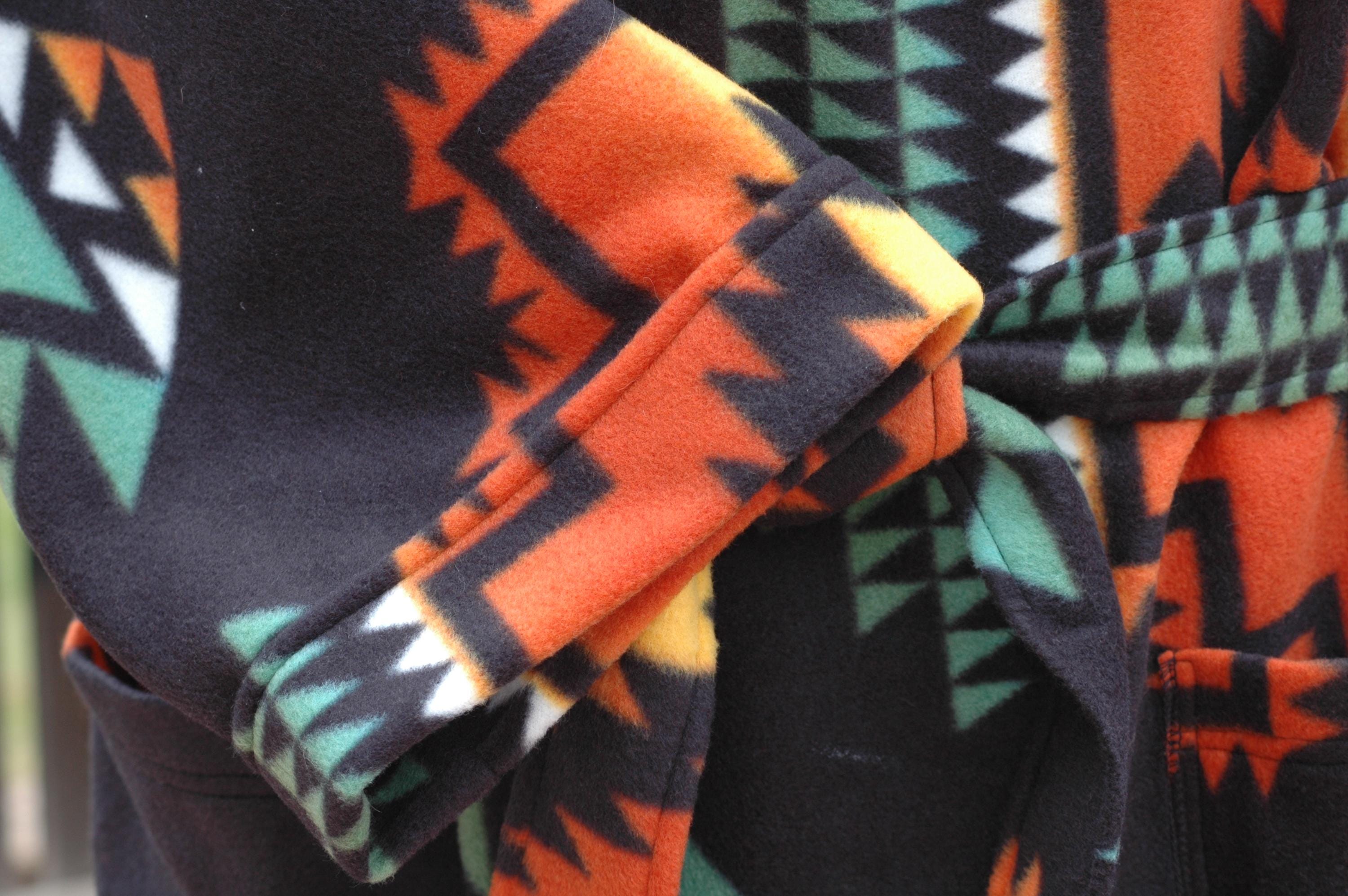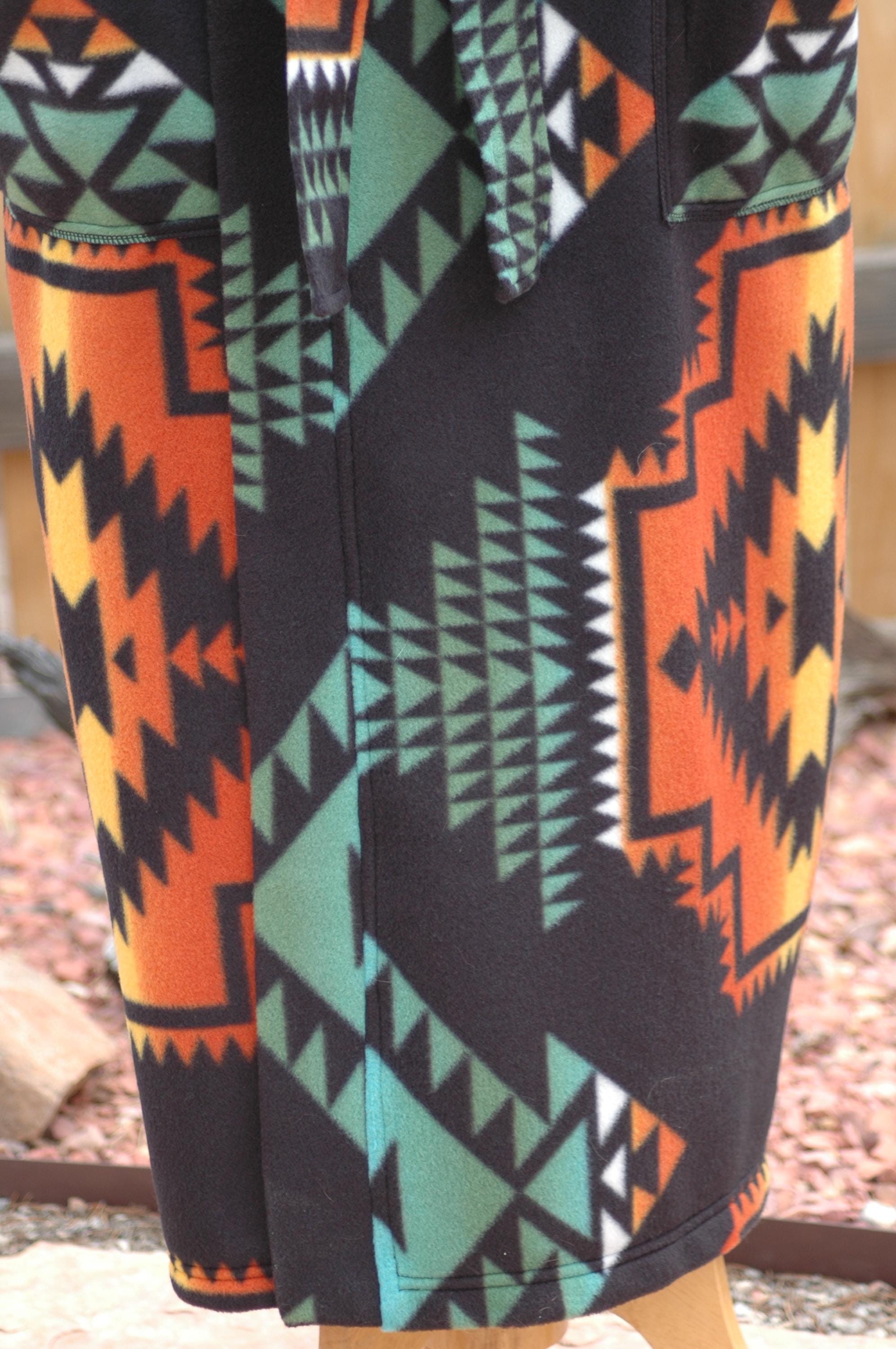 Native print on a soft, thick anti-pill winter fleece in a long, mid-calf wrap robe.