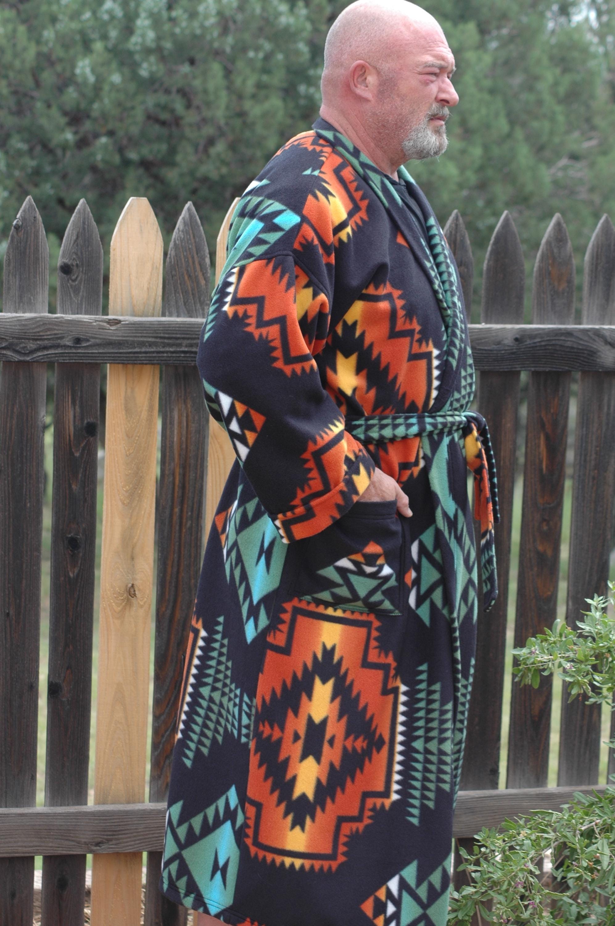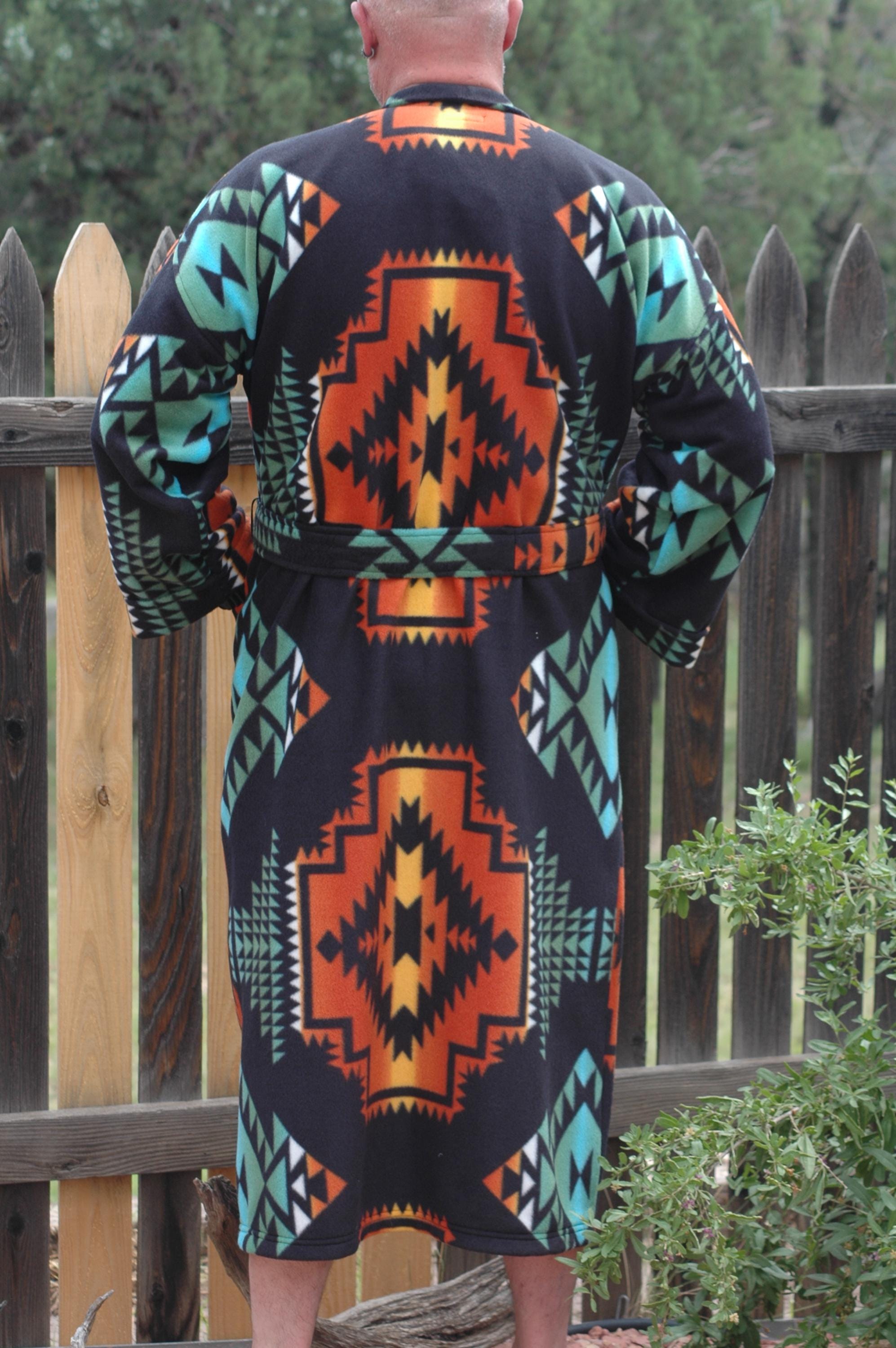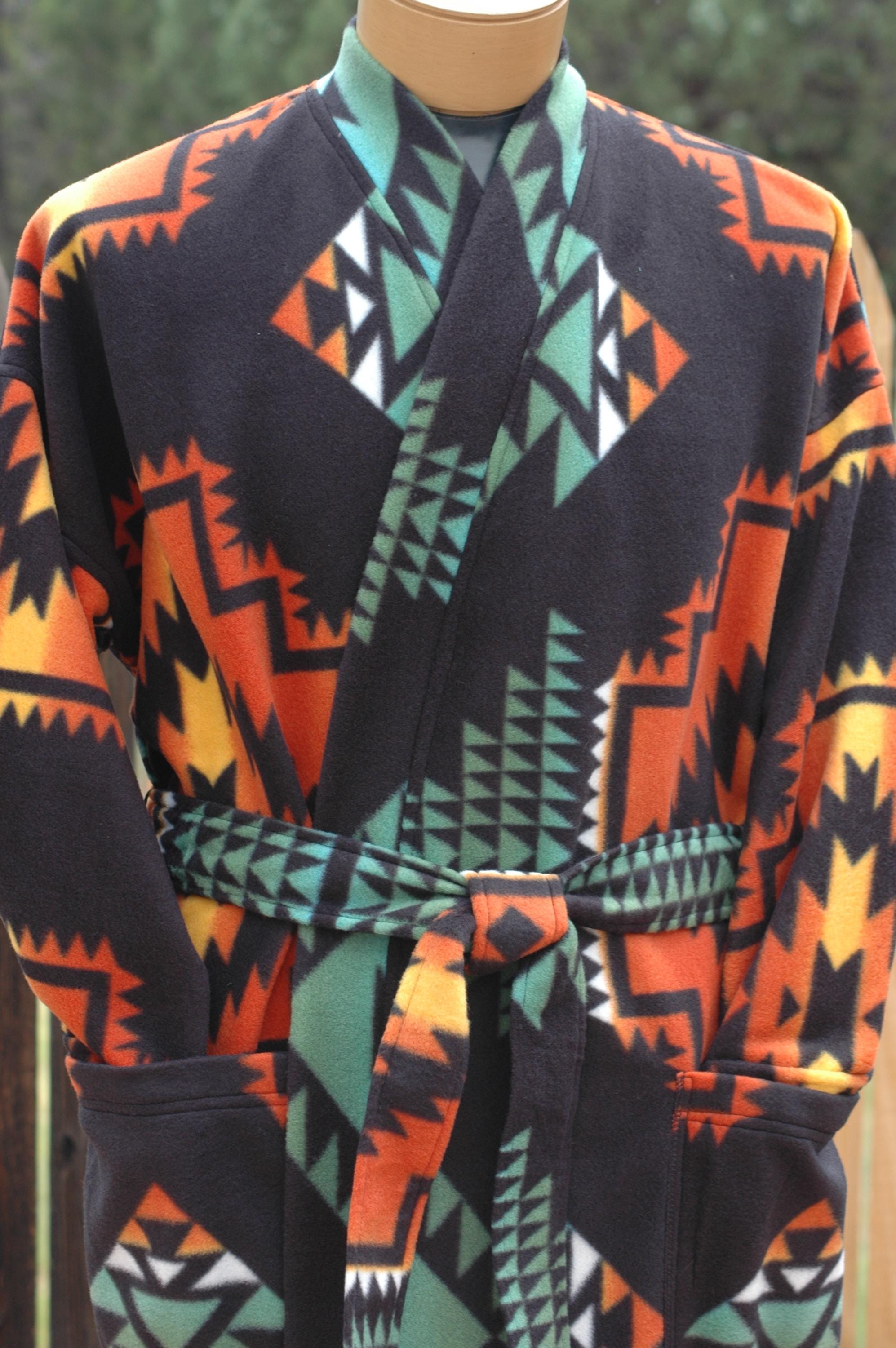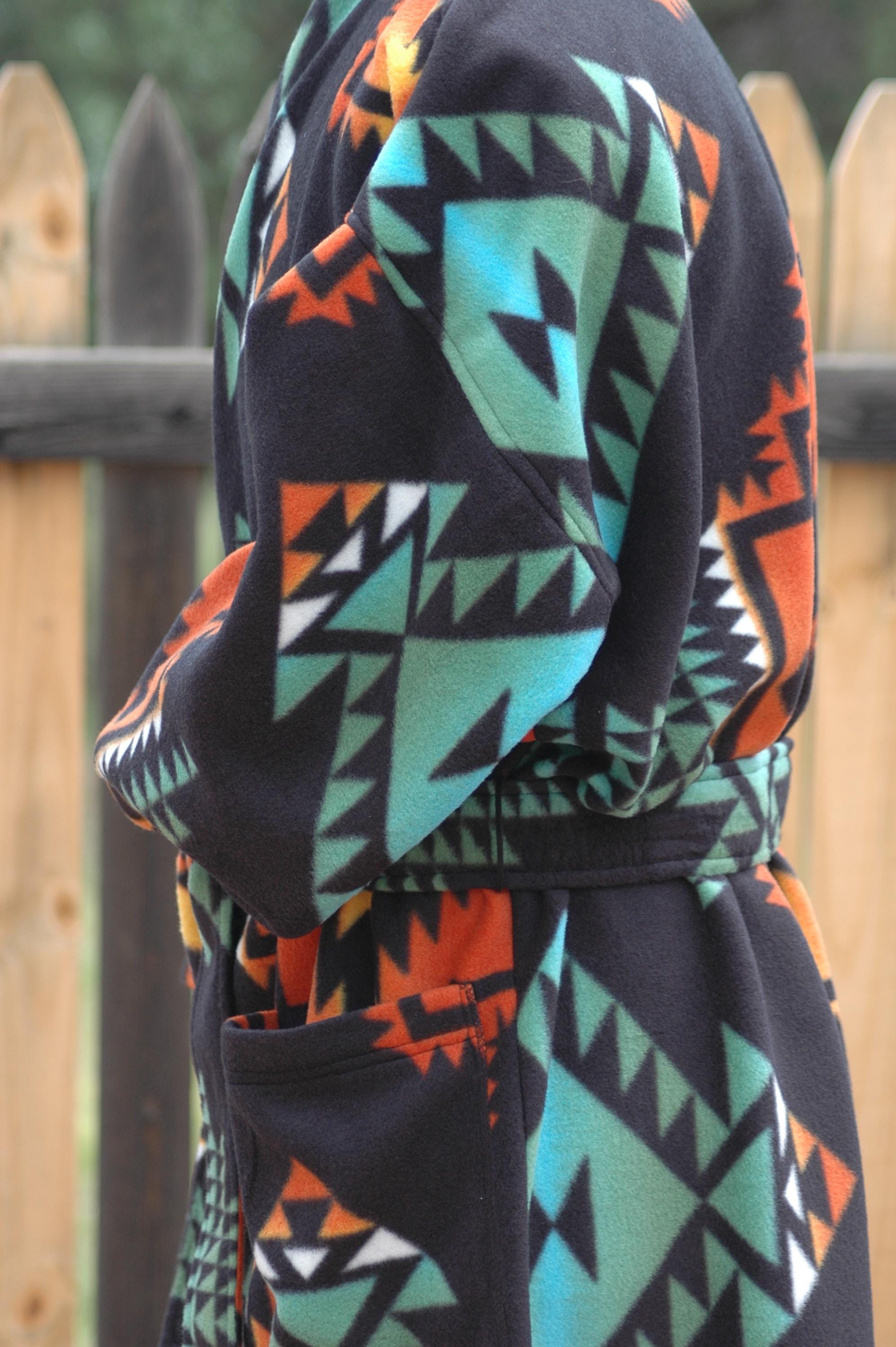 Native print on a soft, thick anti-pill winter fleece in a long, mid-calf wrap robe.