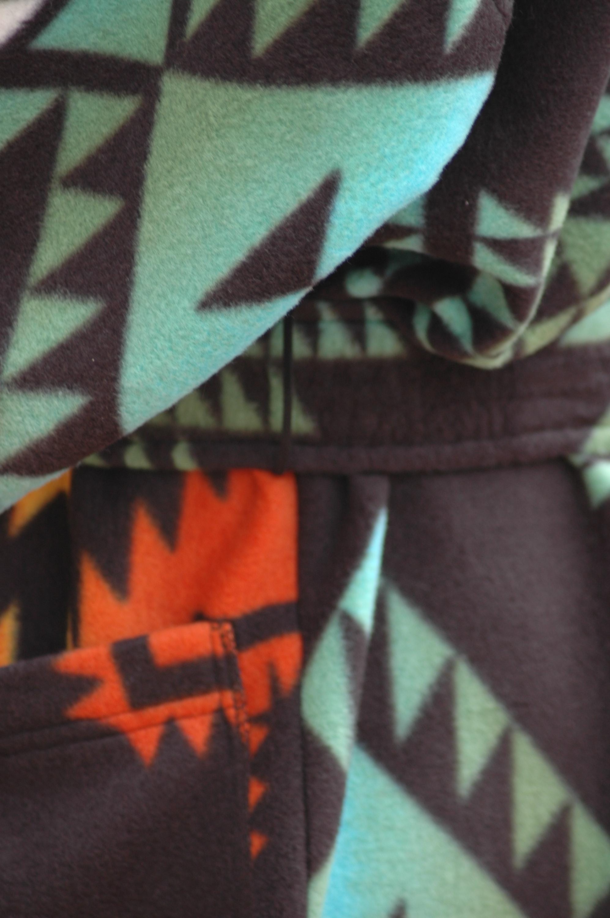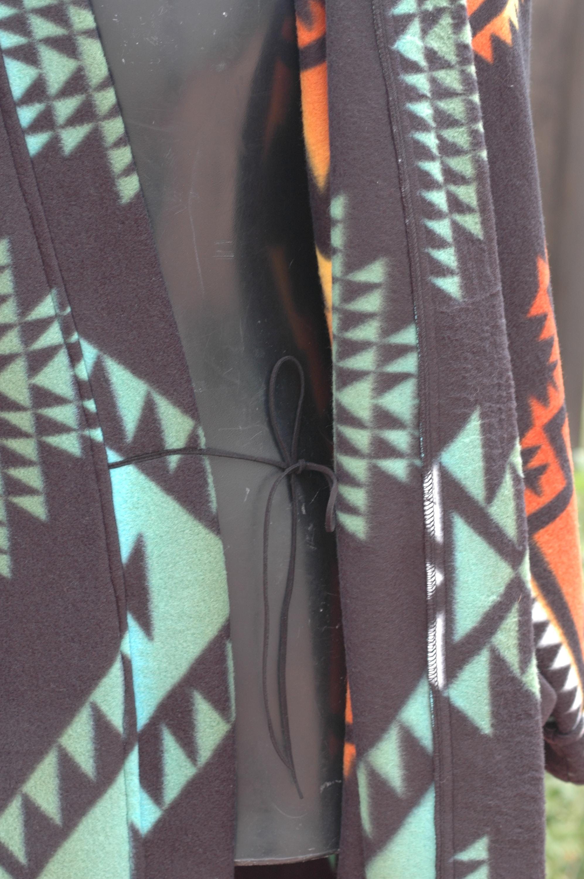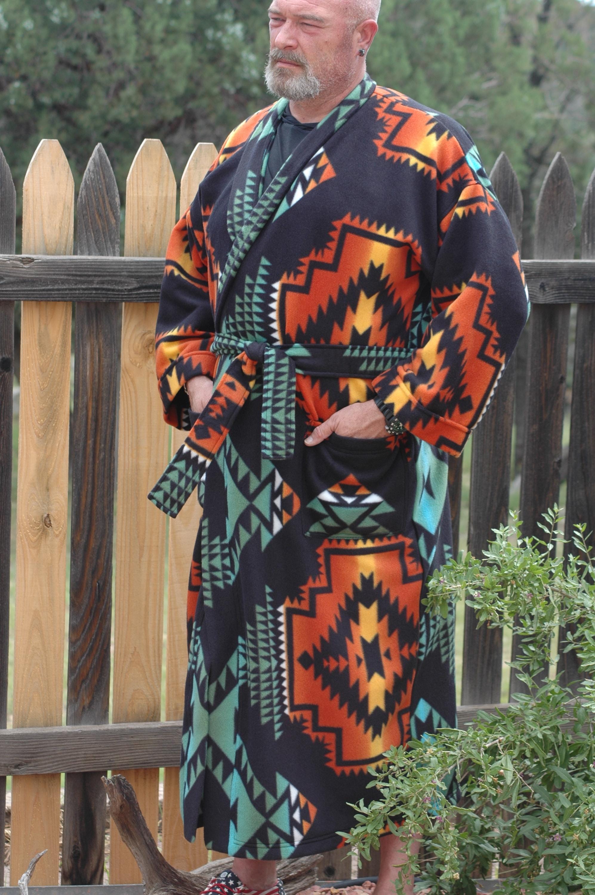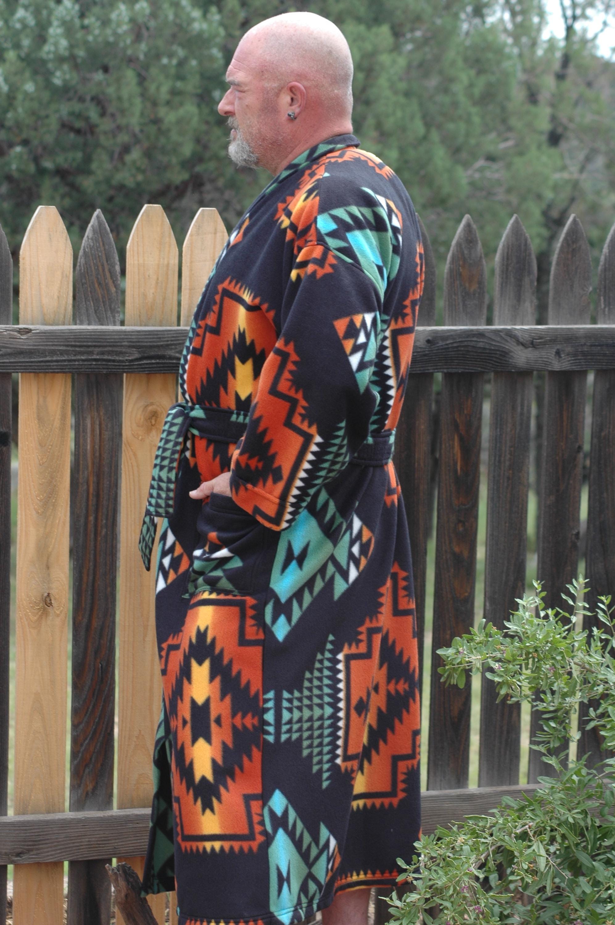 Native print on a soft, thick anti-pill winter fleece in a long, mid-calf wrap robe.