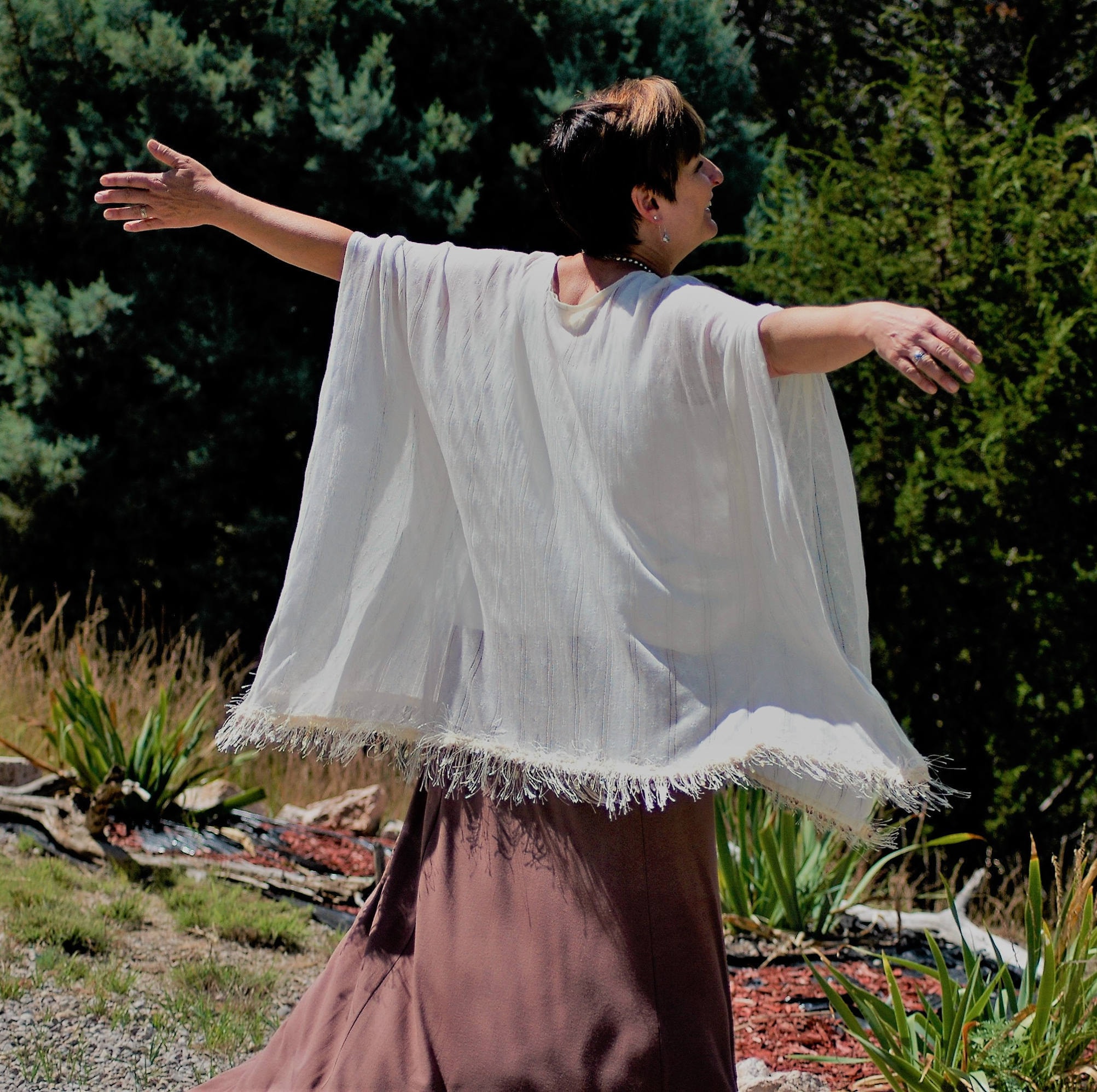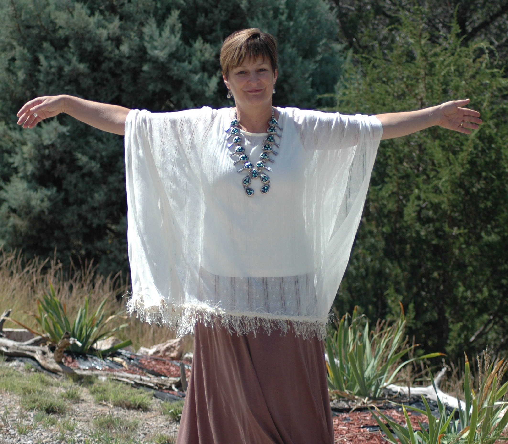 Light knit cream poncho, with cream eyelash trim with clear ,bronze and gold tone beads