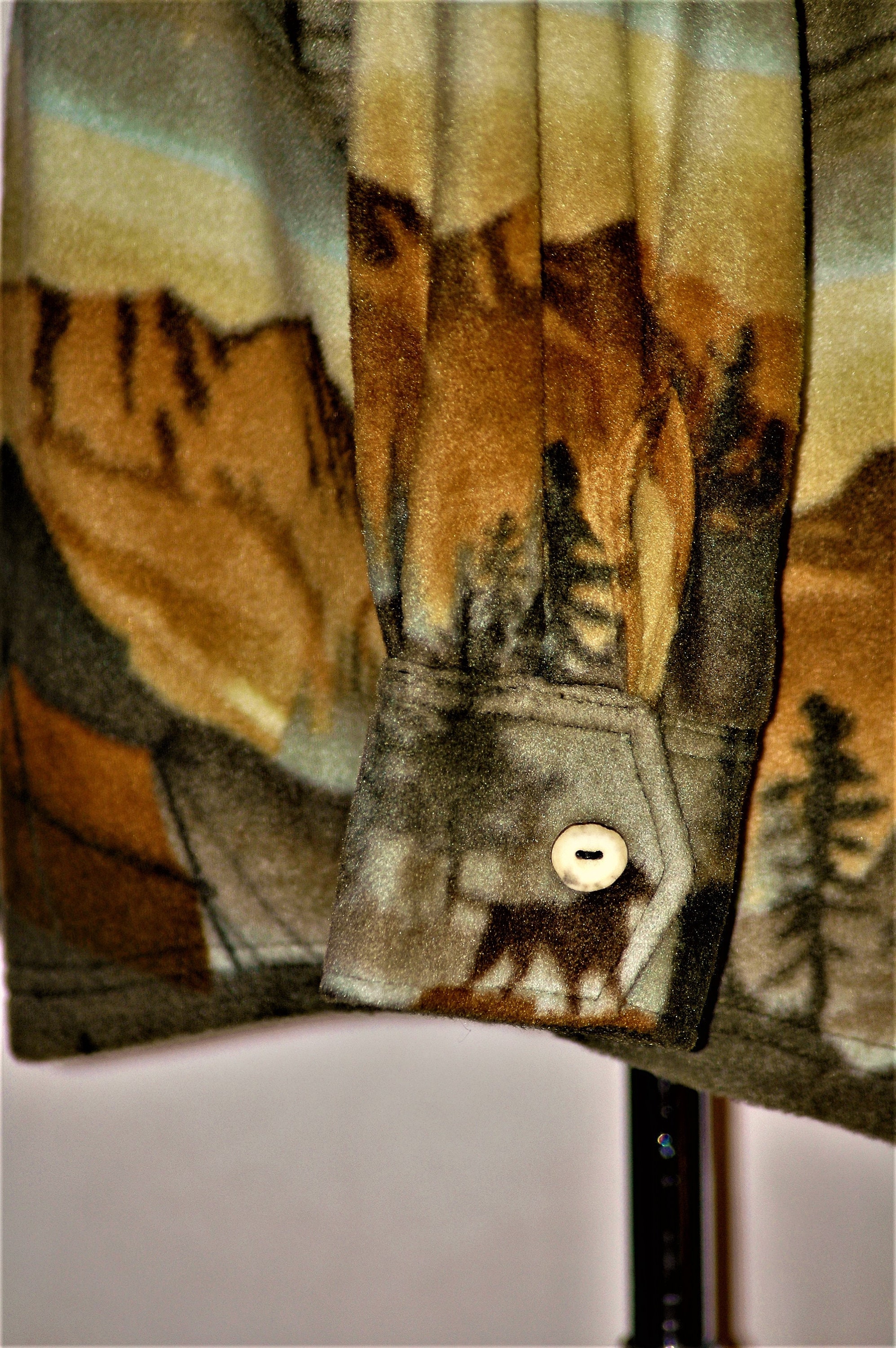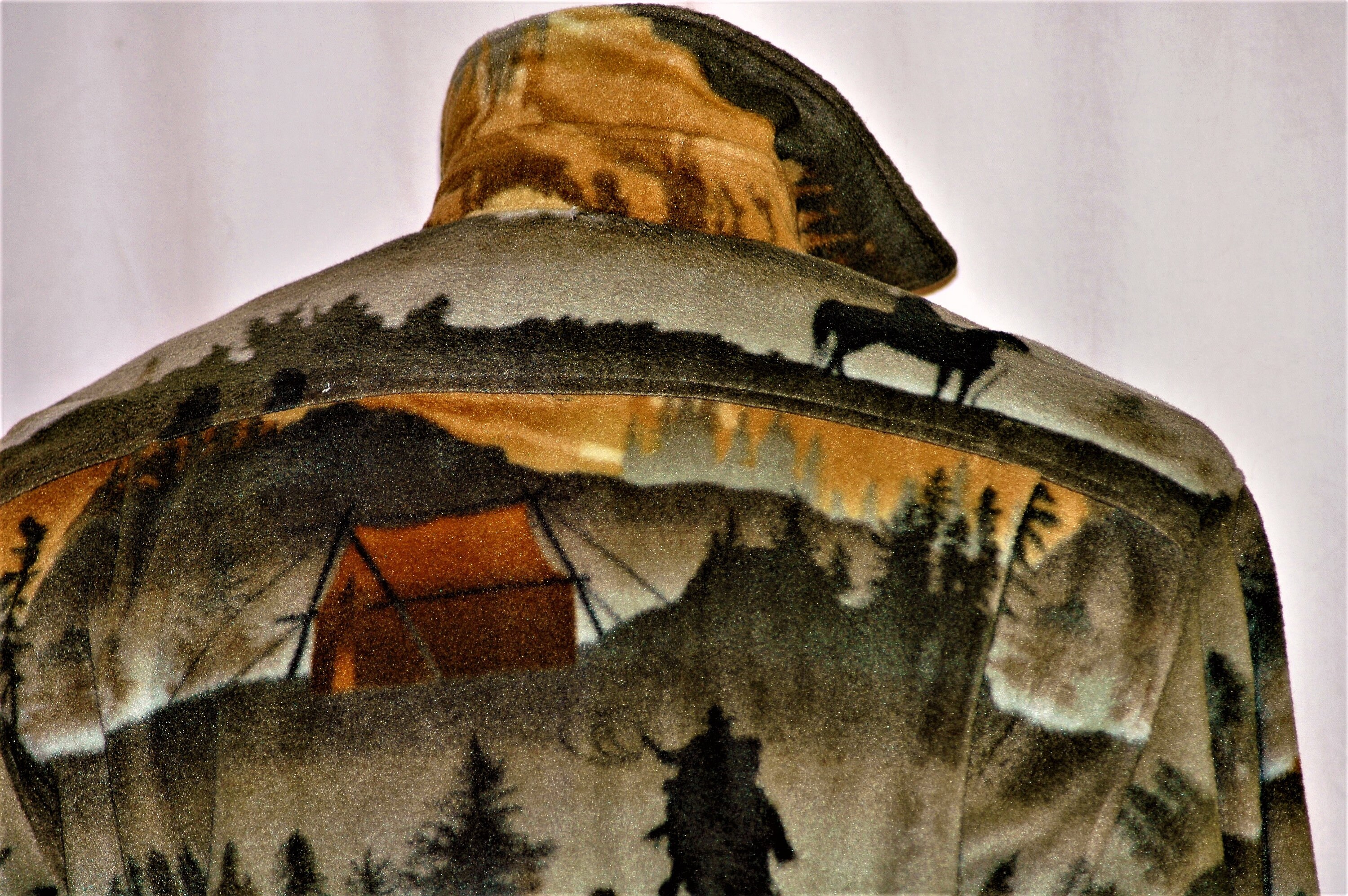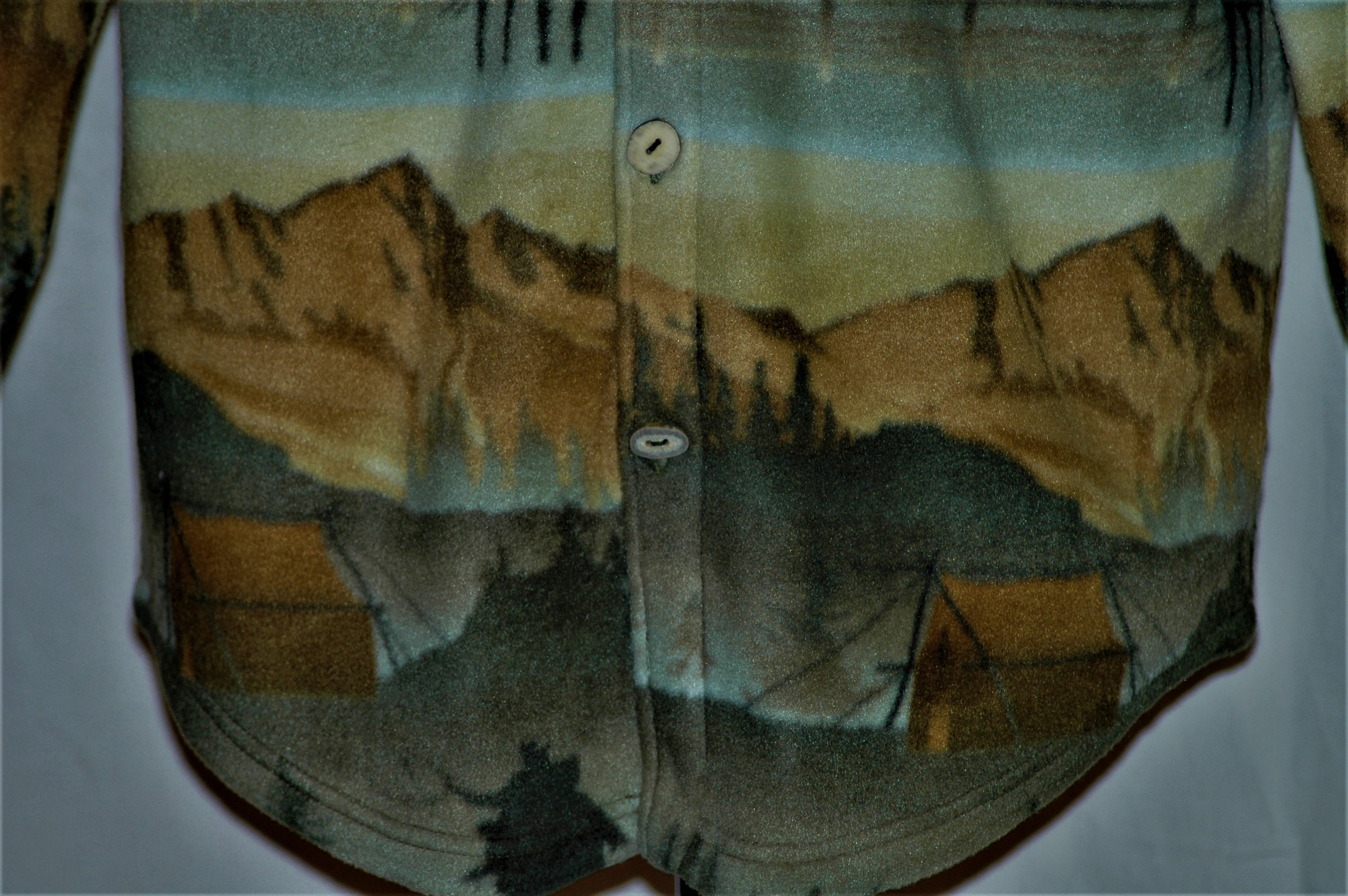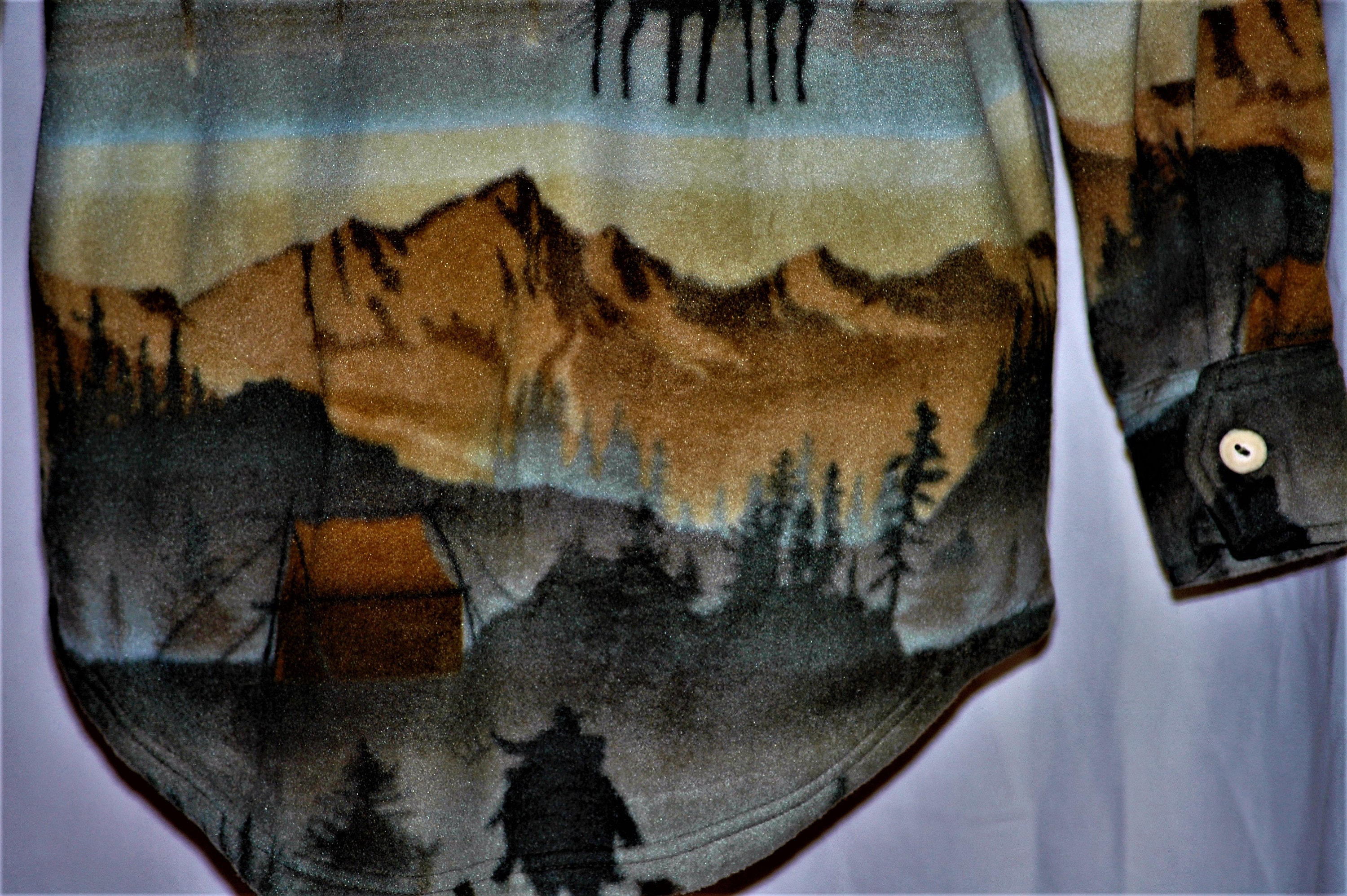 Velour anti-pill fleece with a camping scene on this easy fit shirt with antler buttons. Very comfy and light weight on but very warm. A great present to yourself or your significant other