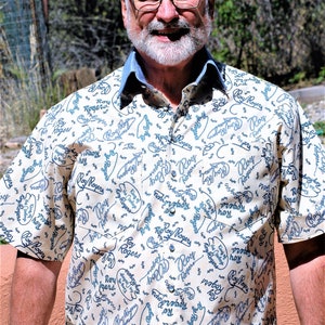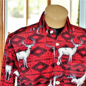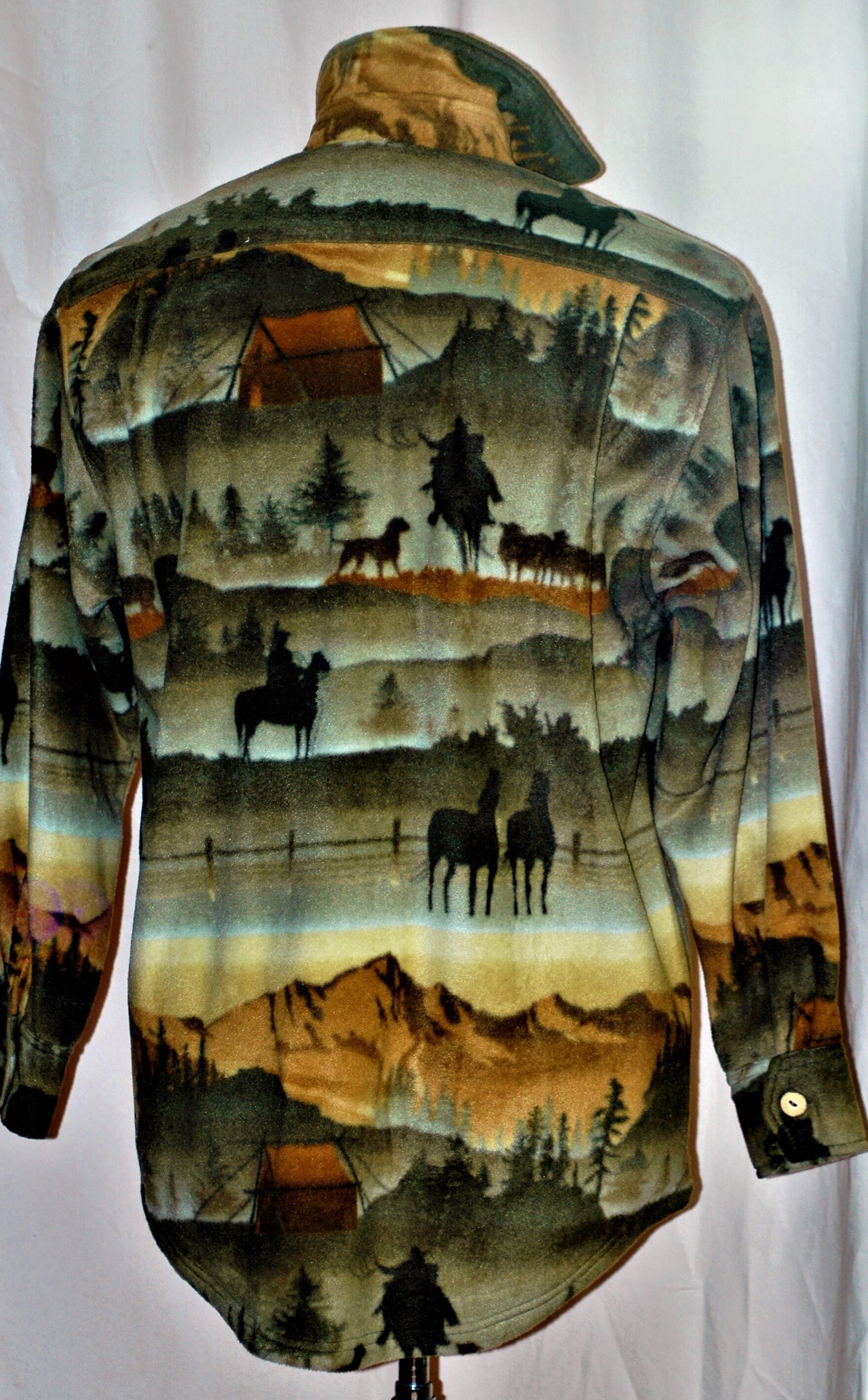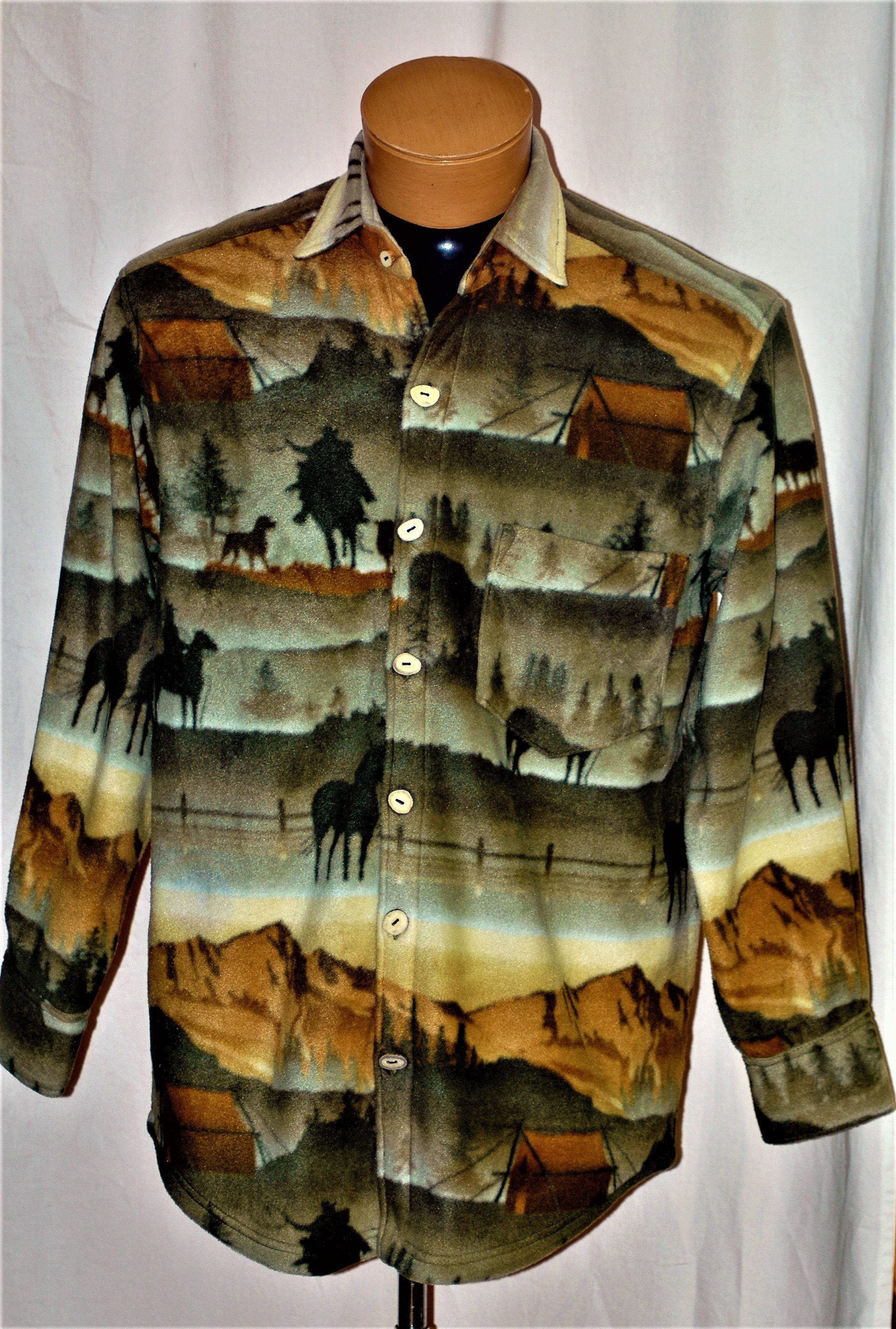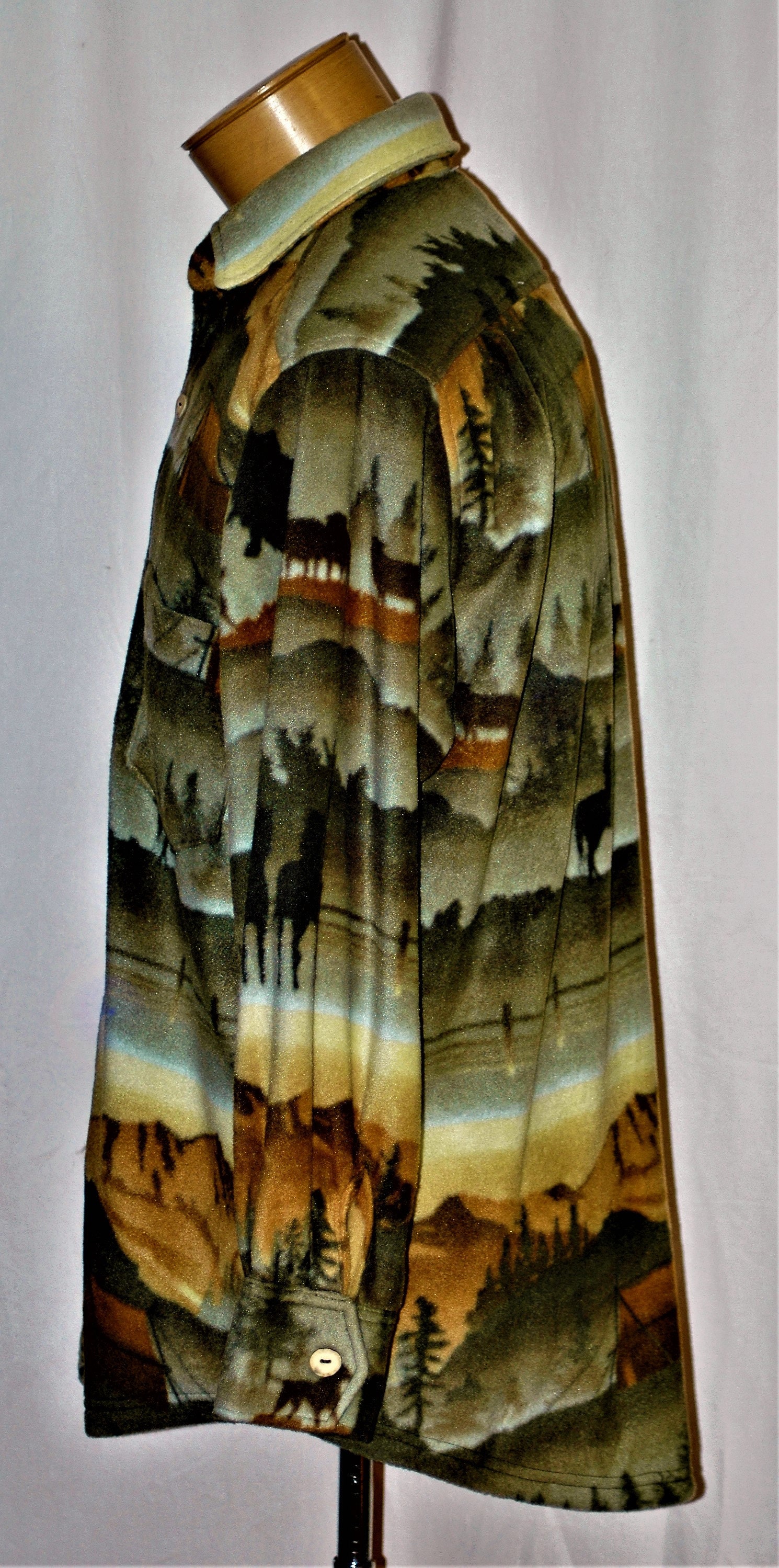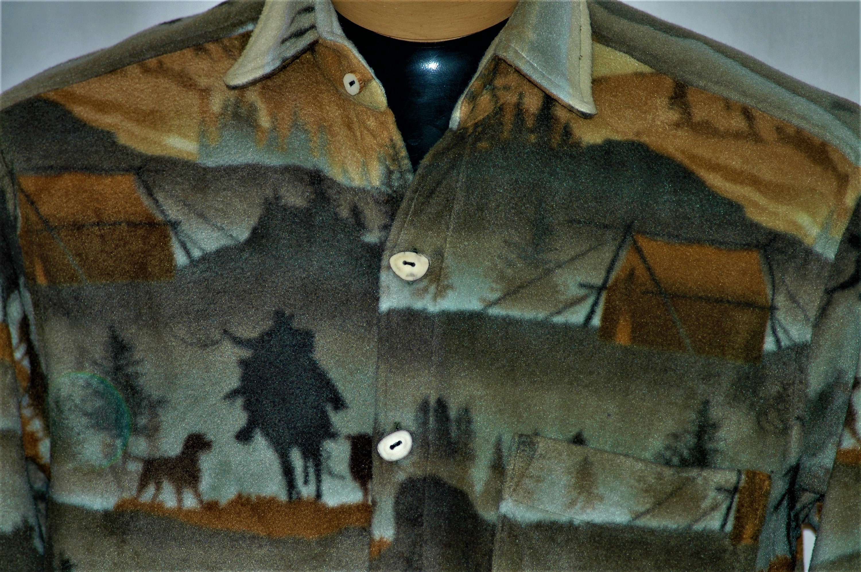 Velour anti-pill fleece with a camping scene on this easy fit shirt with antler buttons. Very comfy and light weight on but very warm. A great present to yourself or your significant other