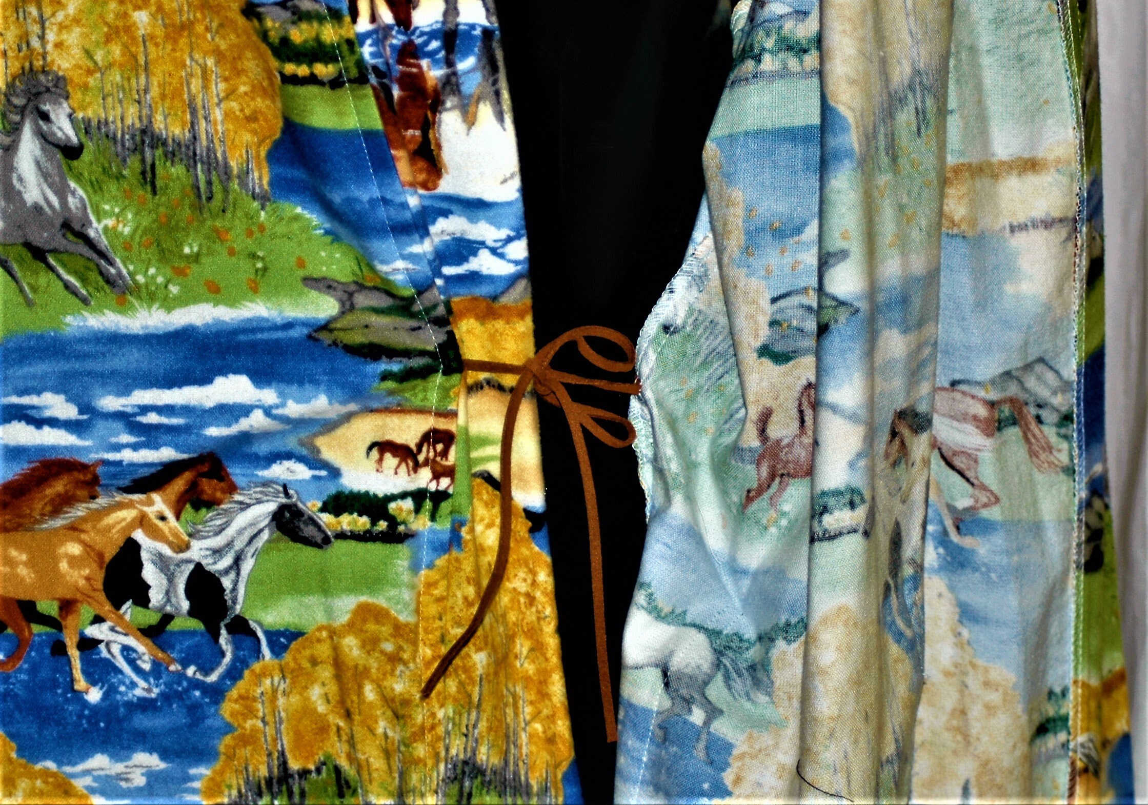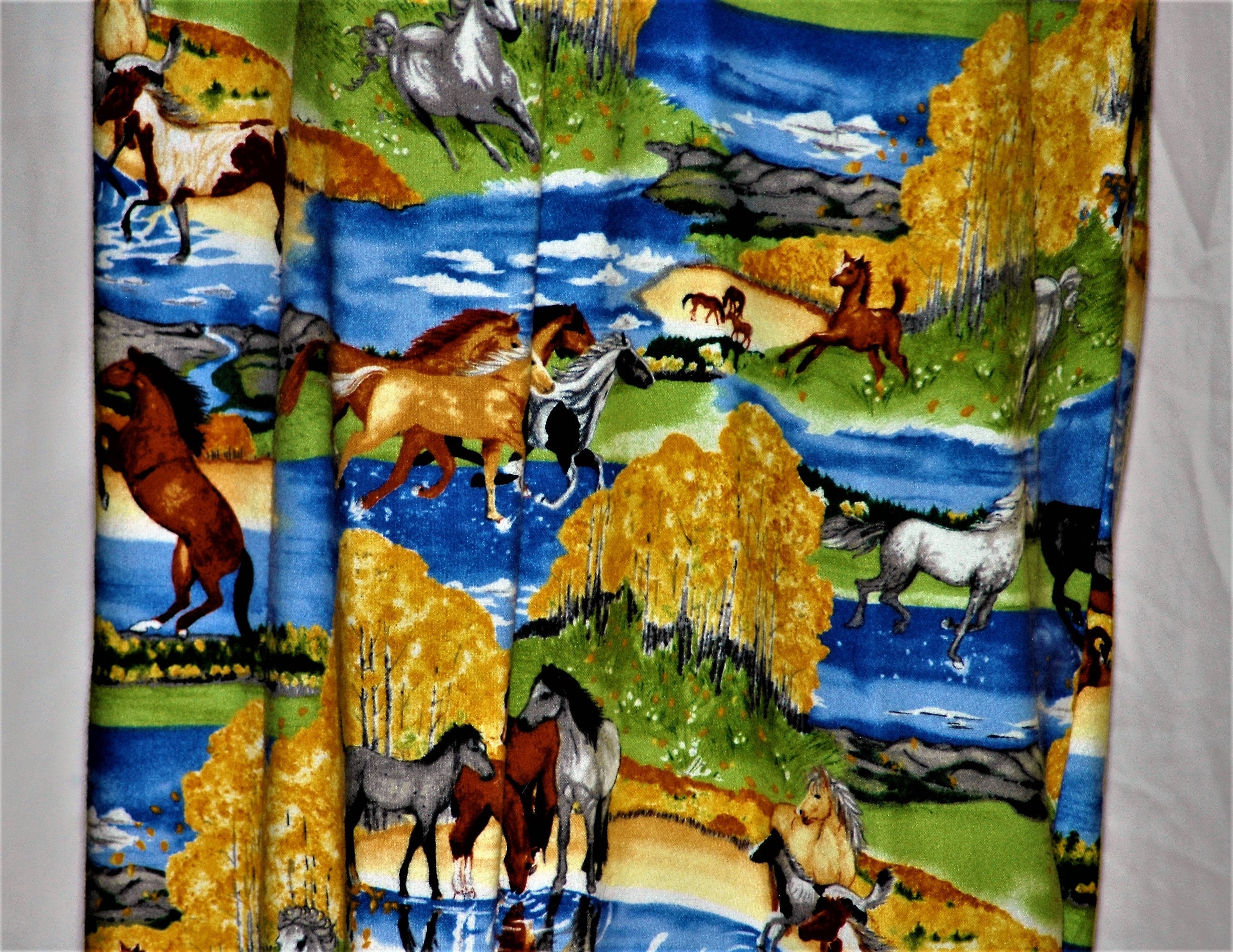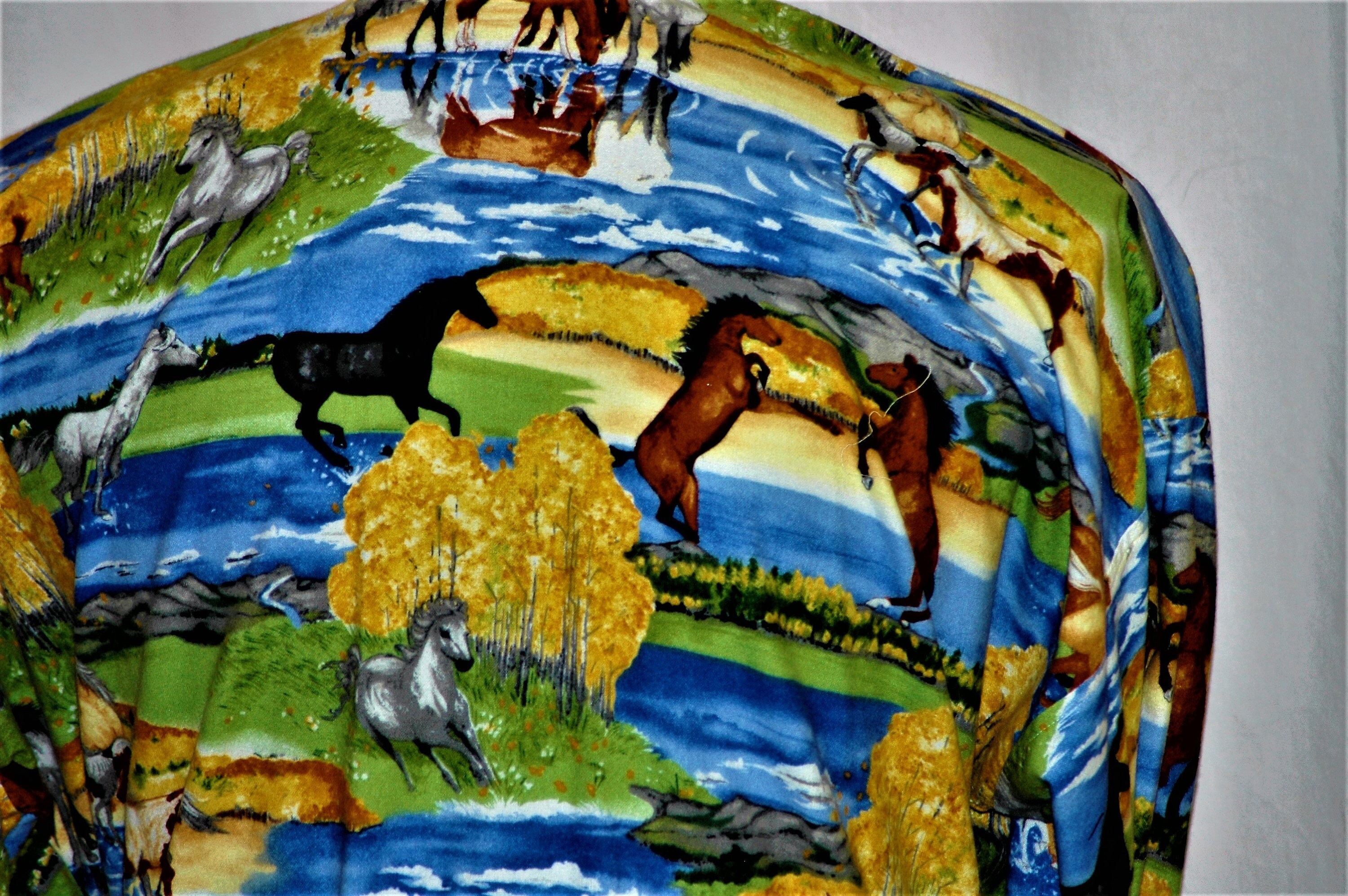 Running with the thoroughbred 's in the field, a screen printed flannel,with horses romping on the range