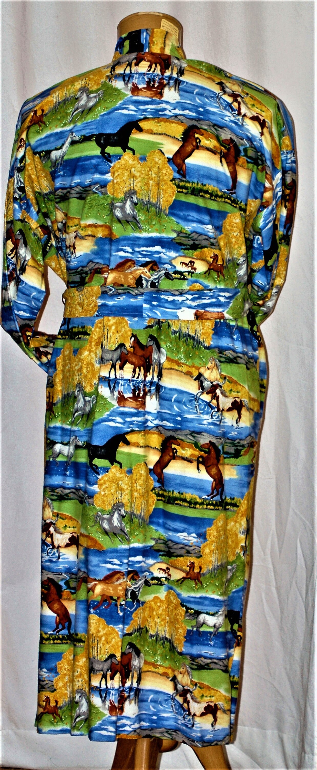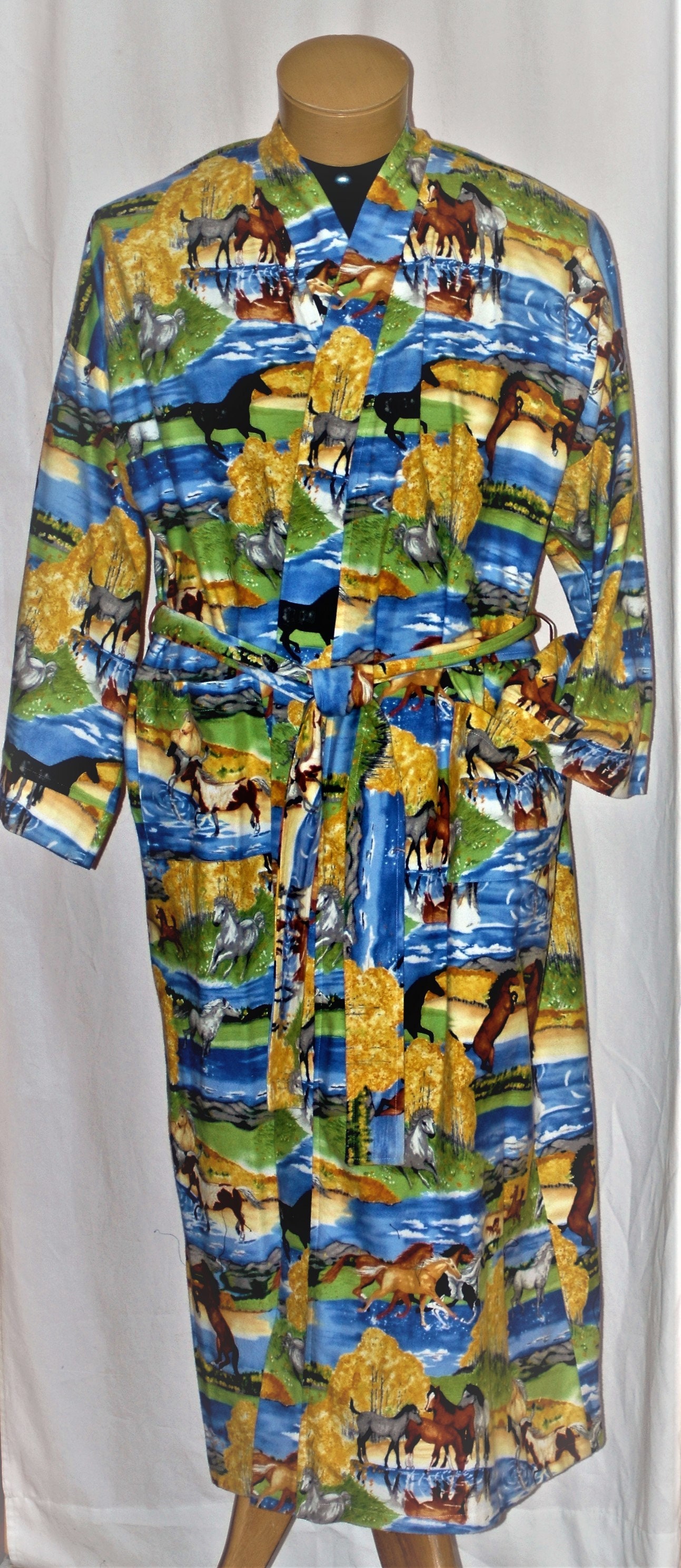 Unisex cotton flannel robe with horsesin a field