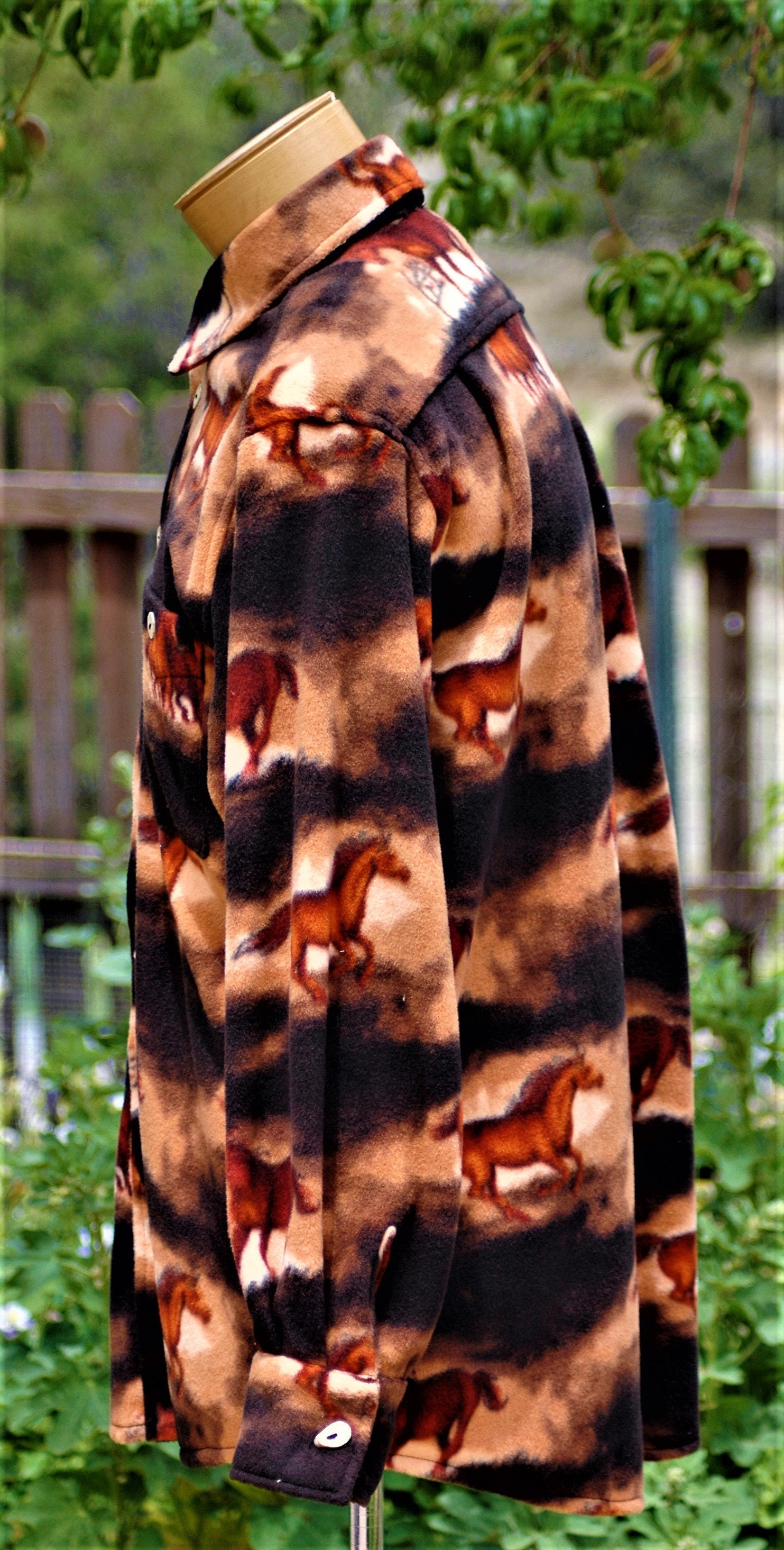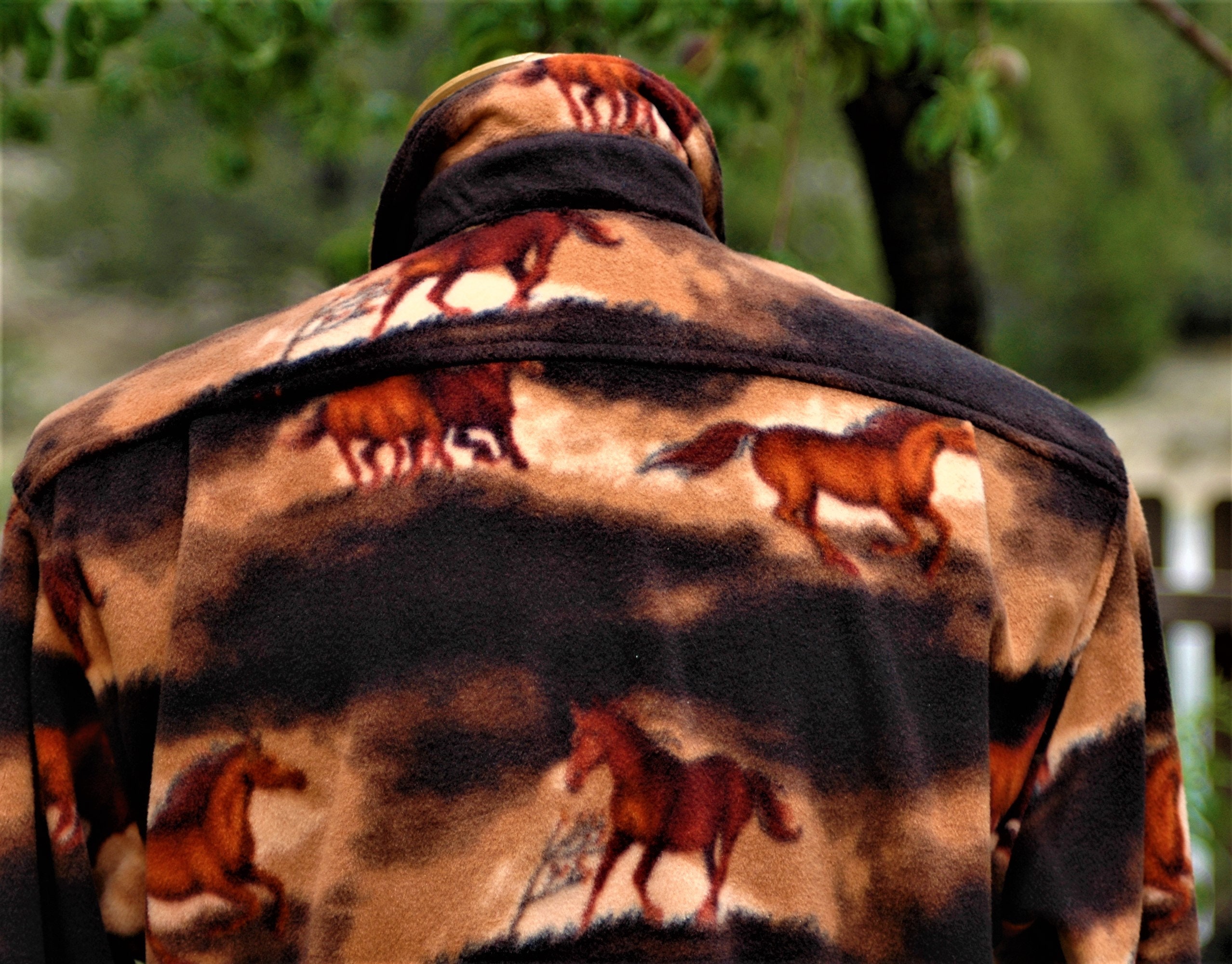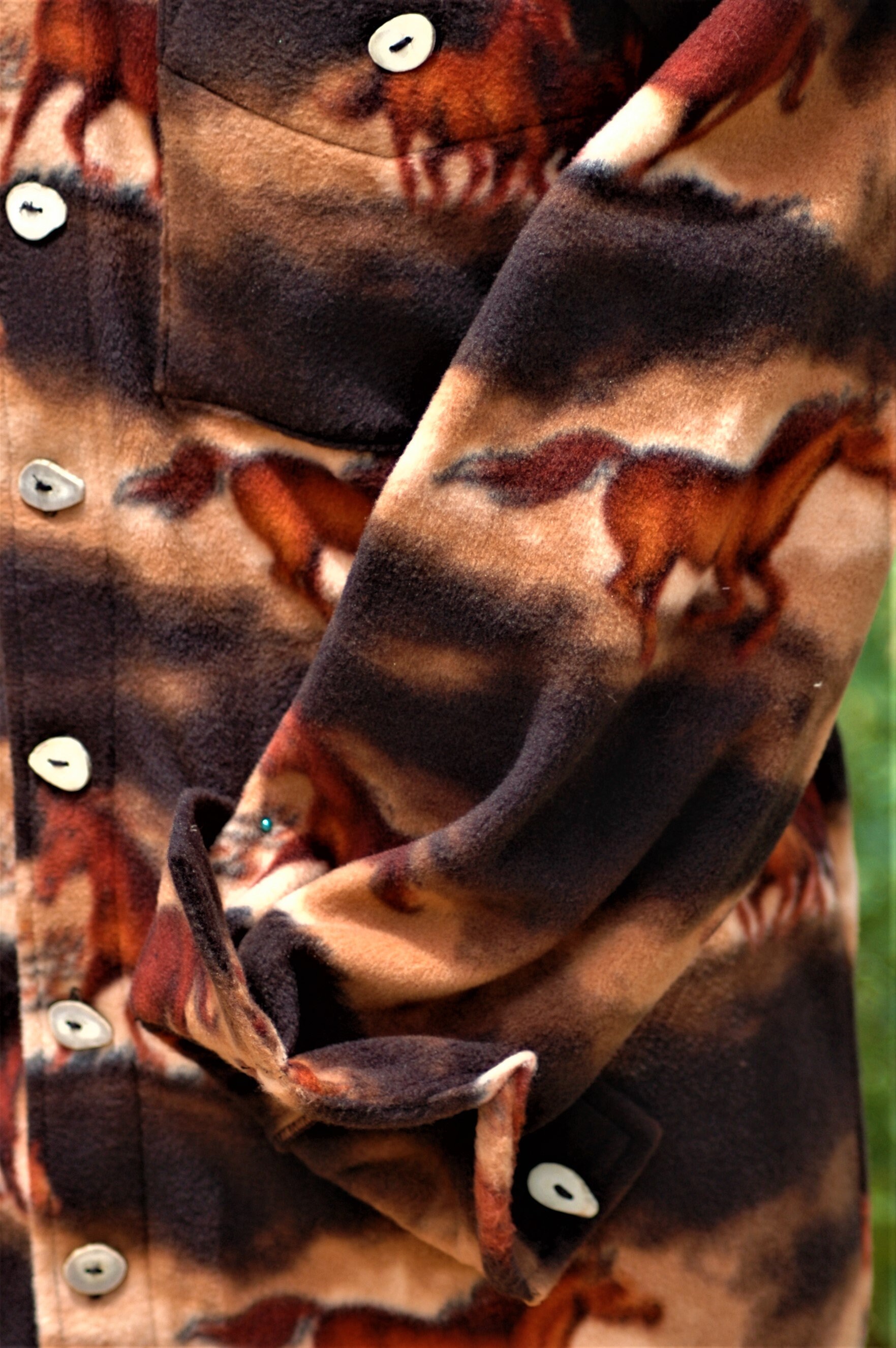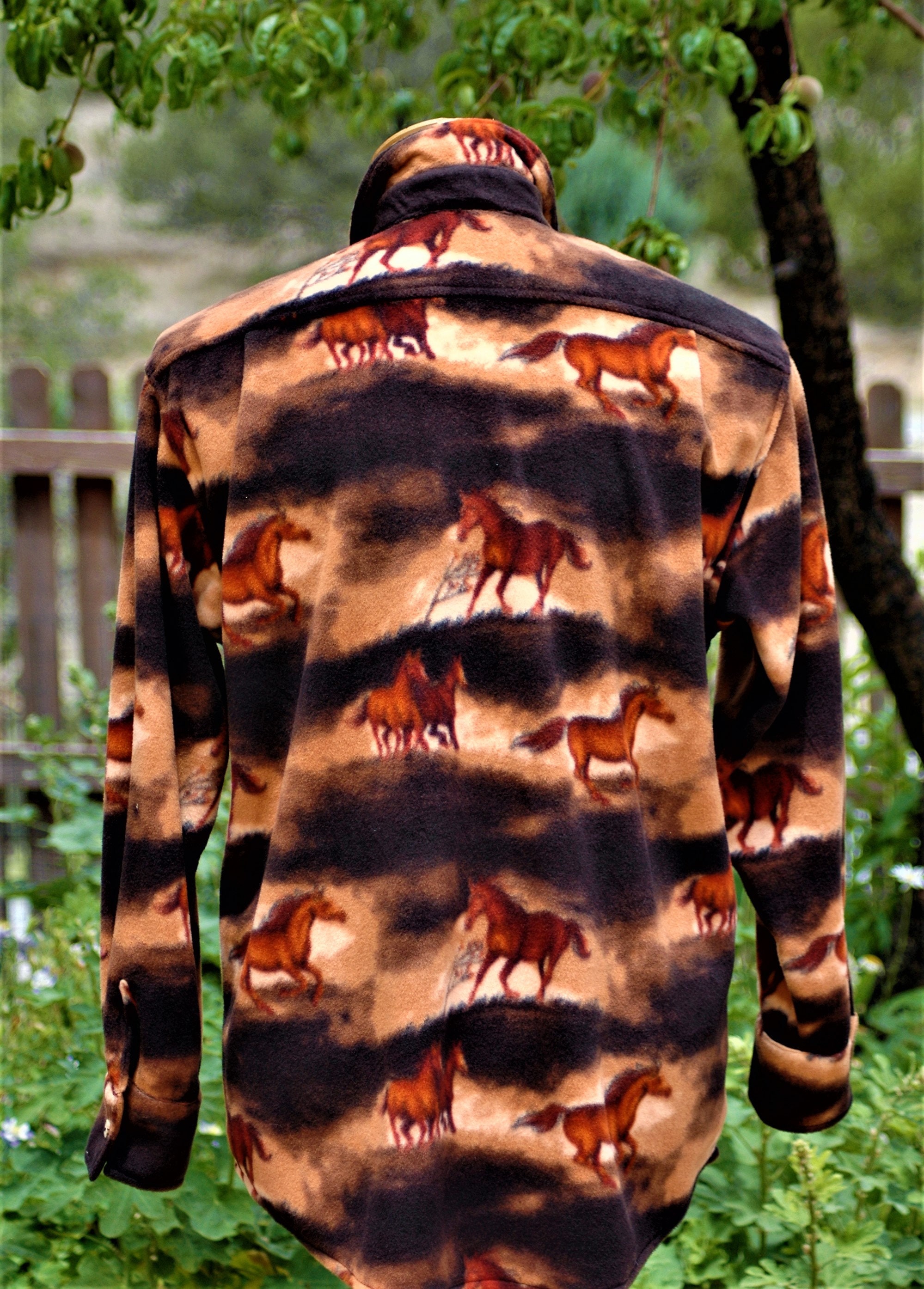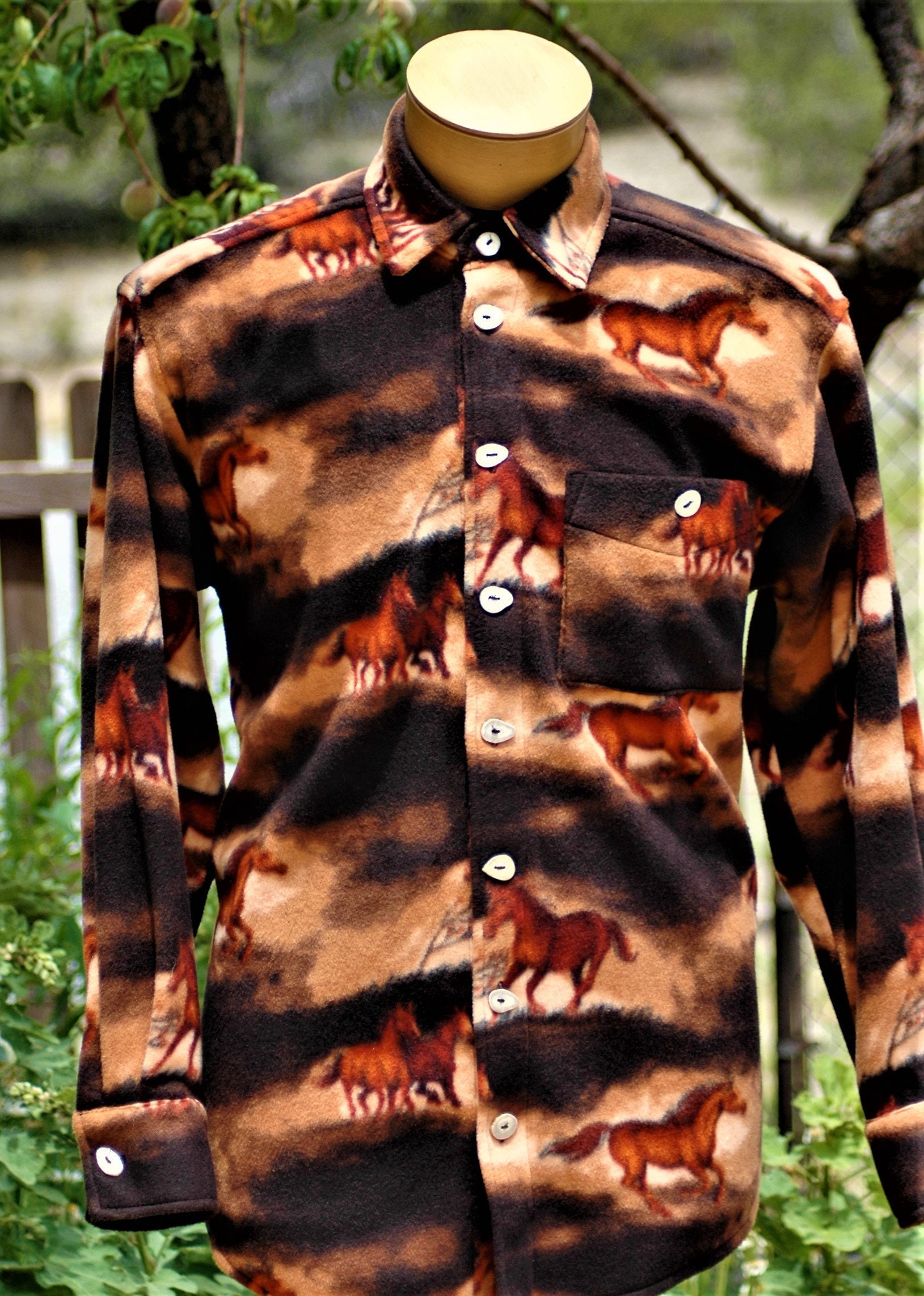 Men's horse shirt print, anti-pill velour fleece with antler horn buttons