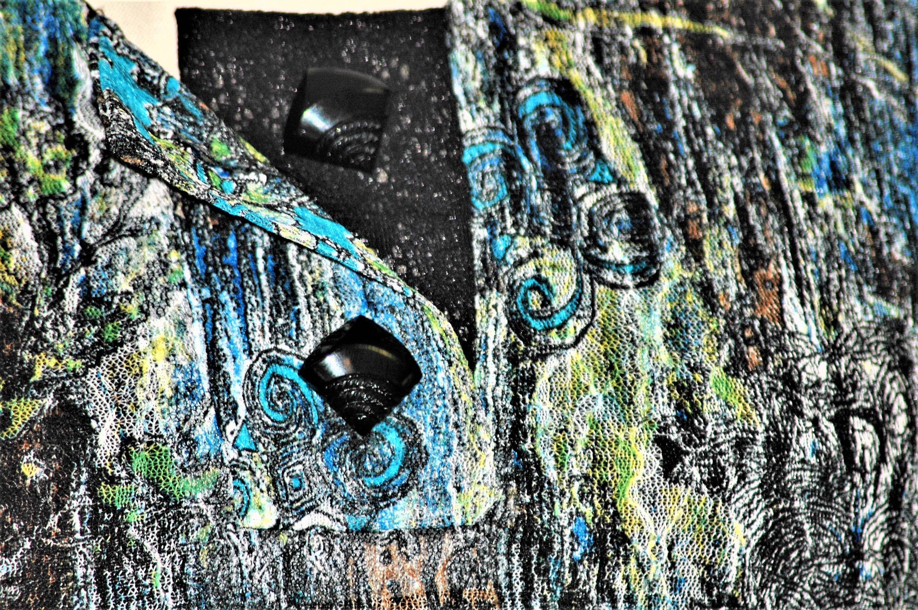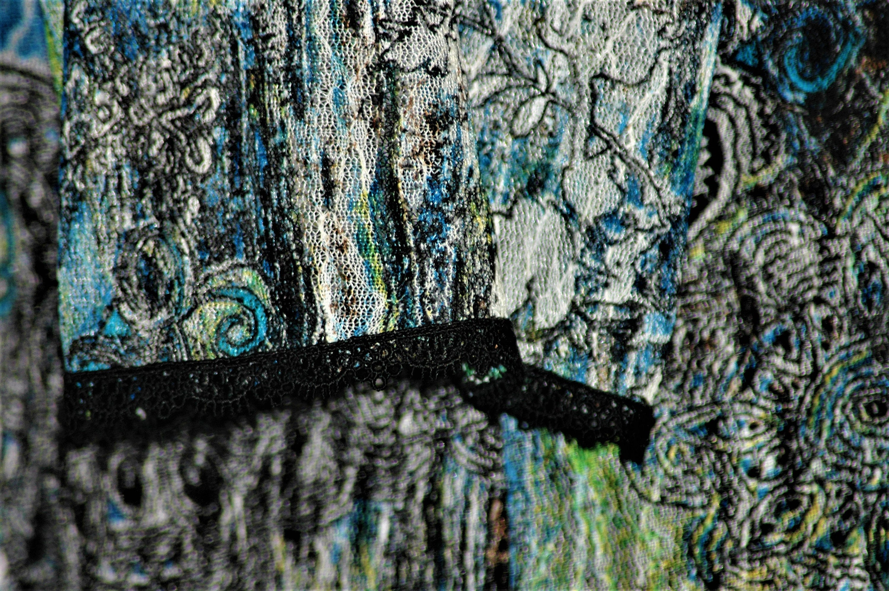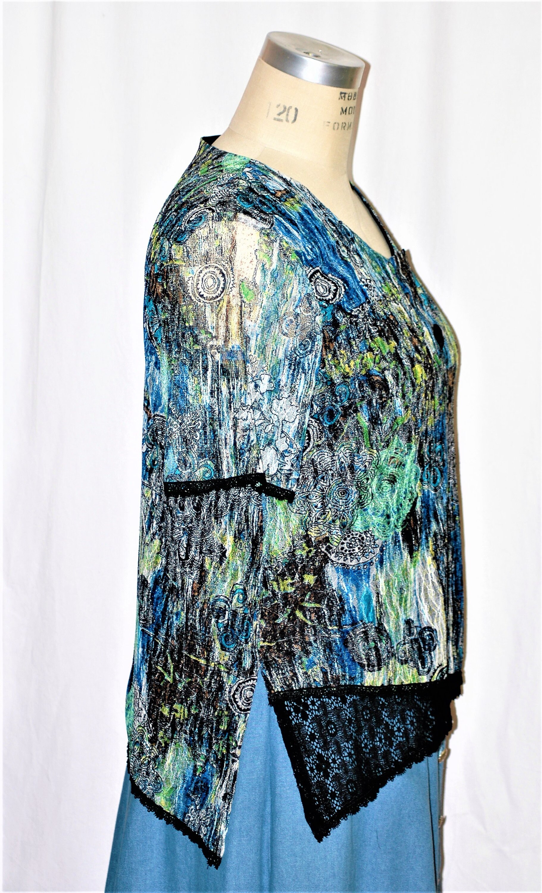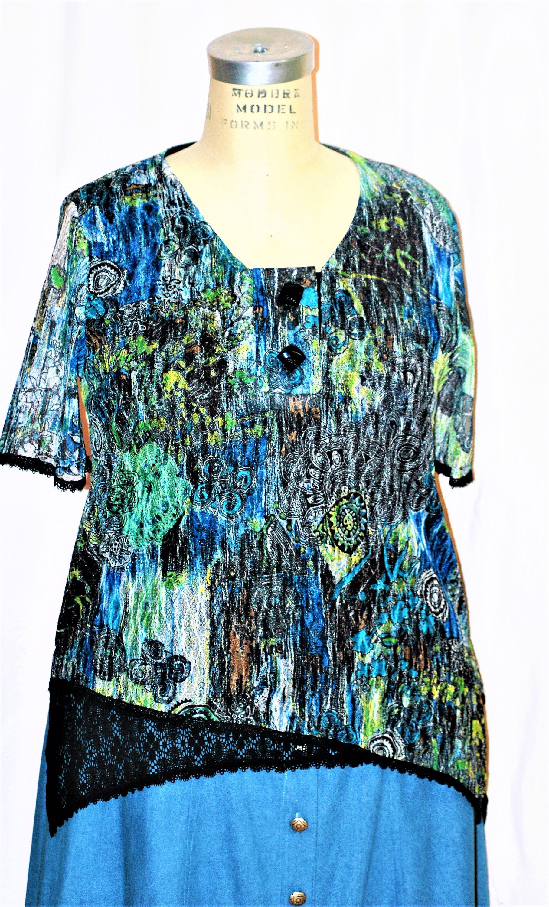 Multi color lace with open neckline, functioning button tab with asymmetrical hem with lace trim and body lined