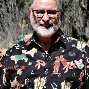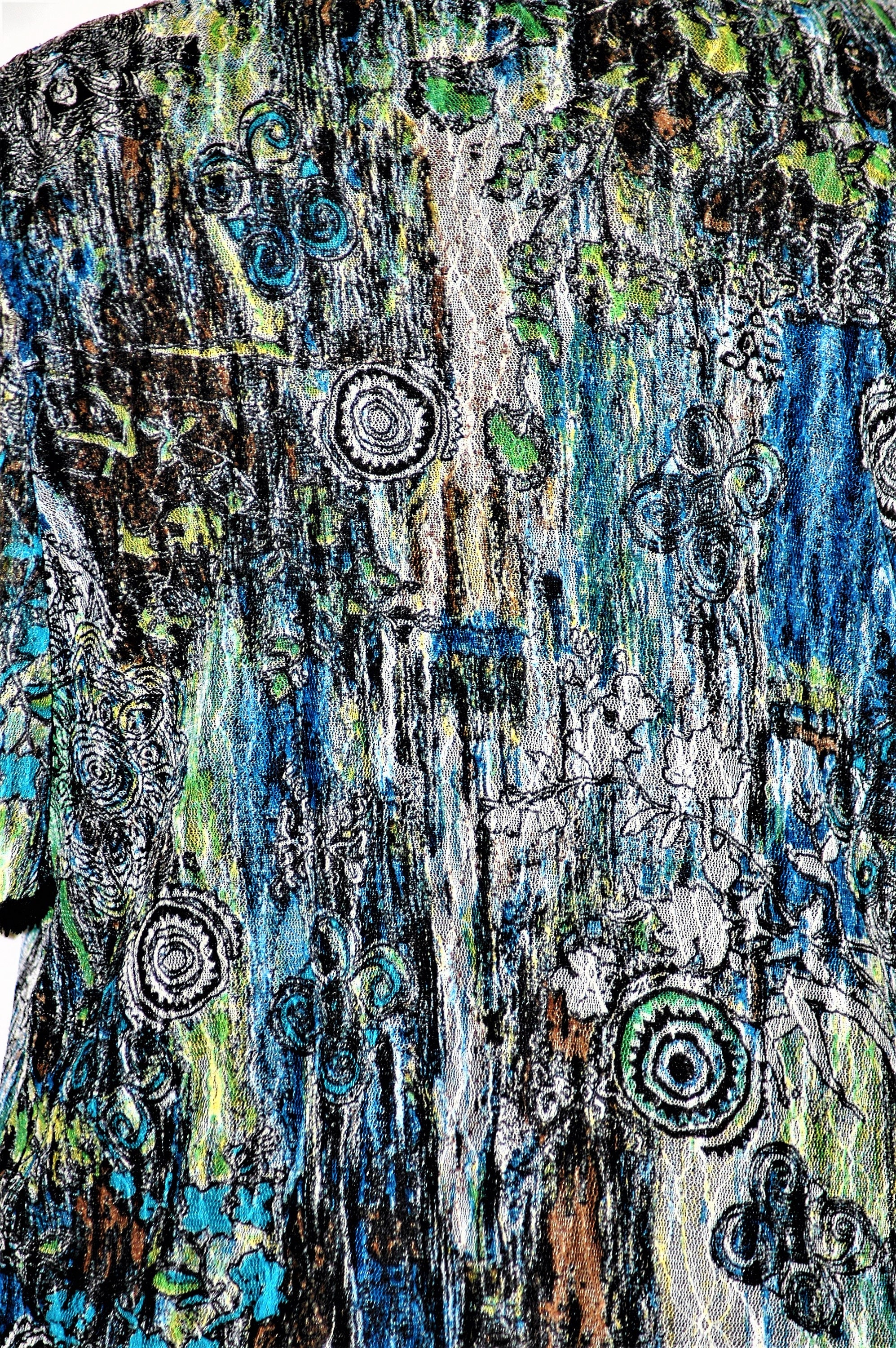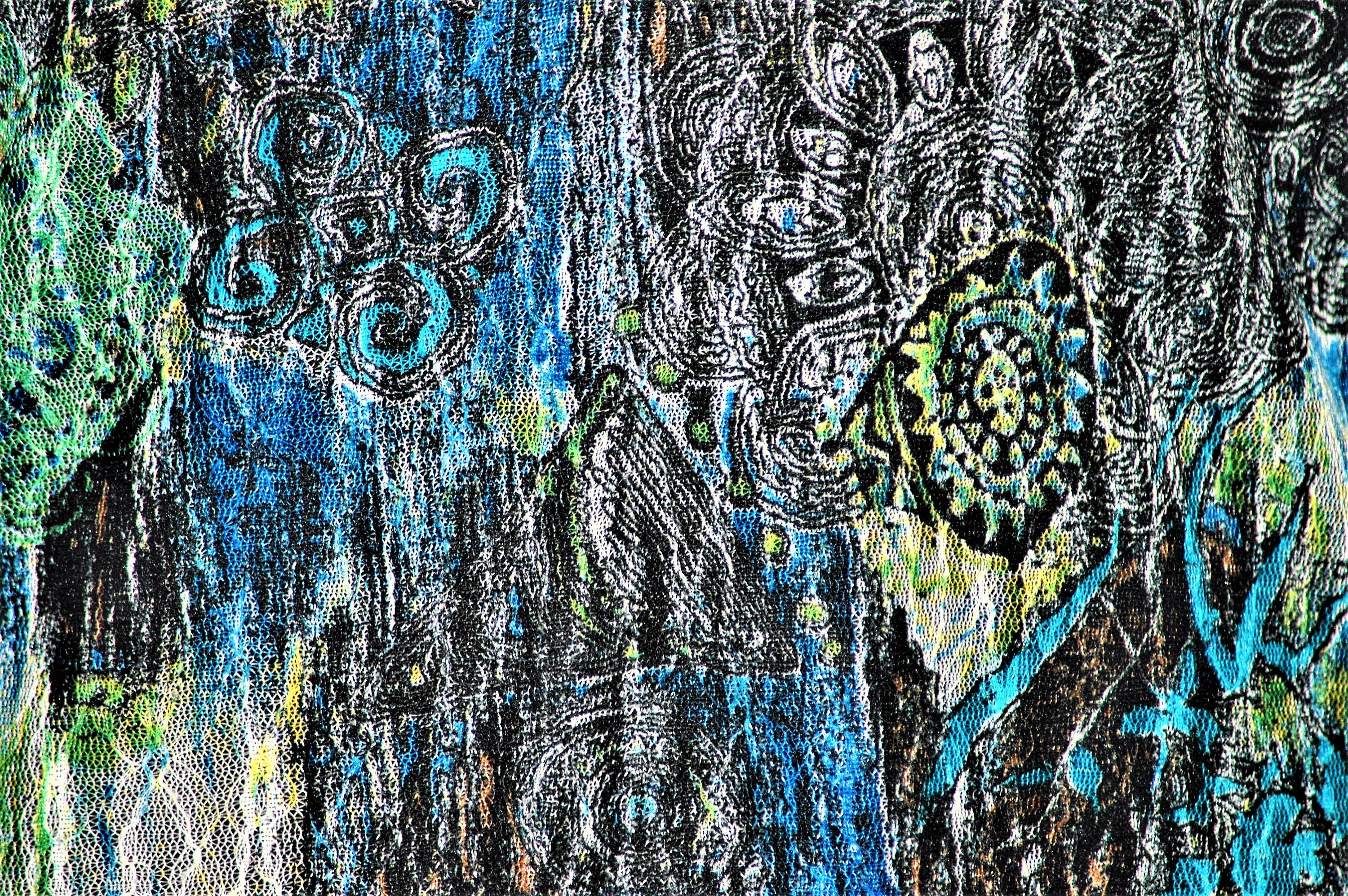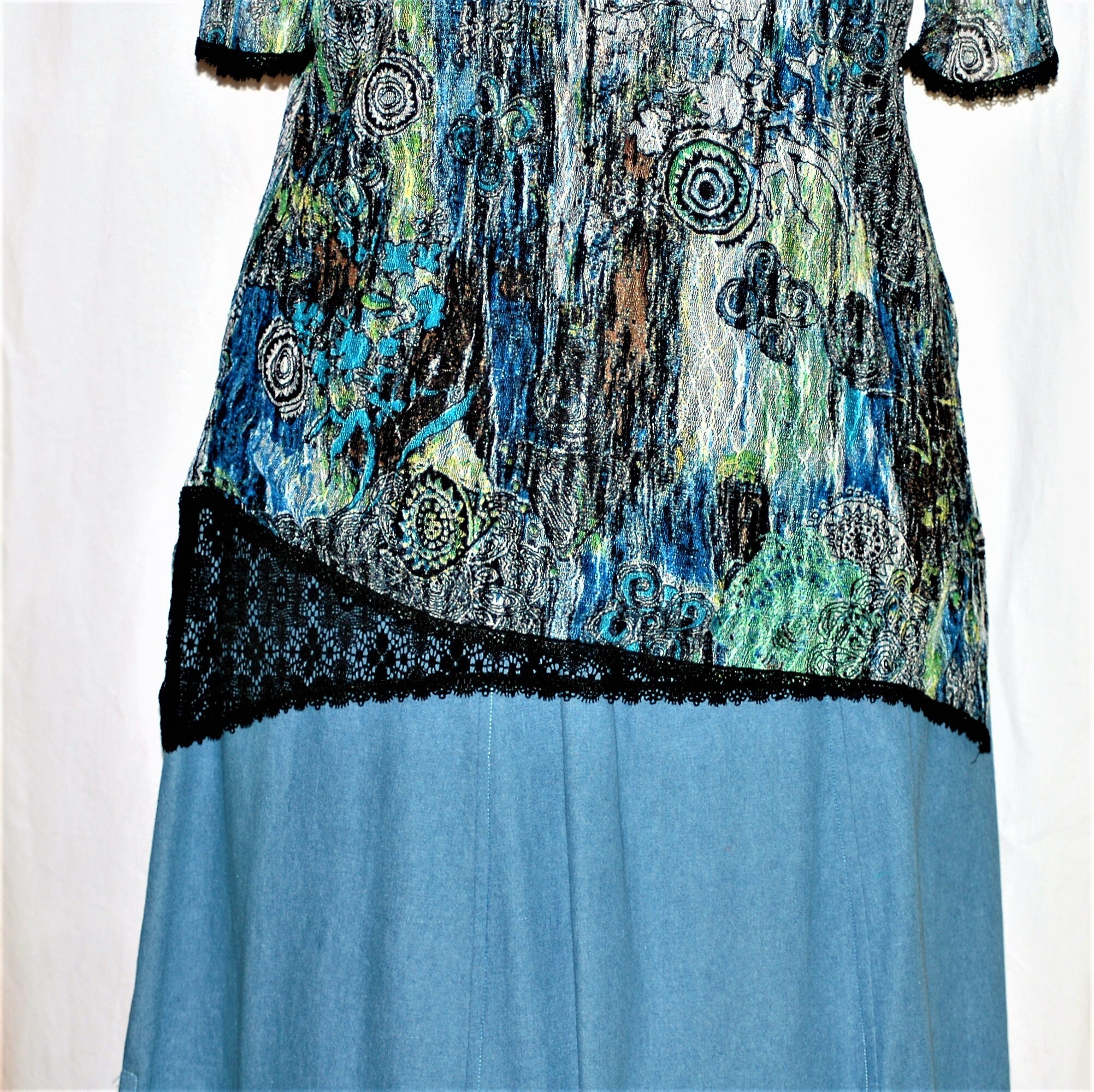 Multi color lace with open neckline, functioning button tab with asymmetrical hem with lace trim and body lined