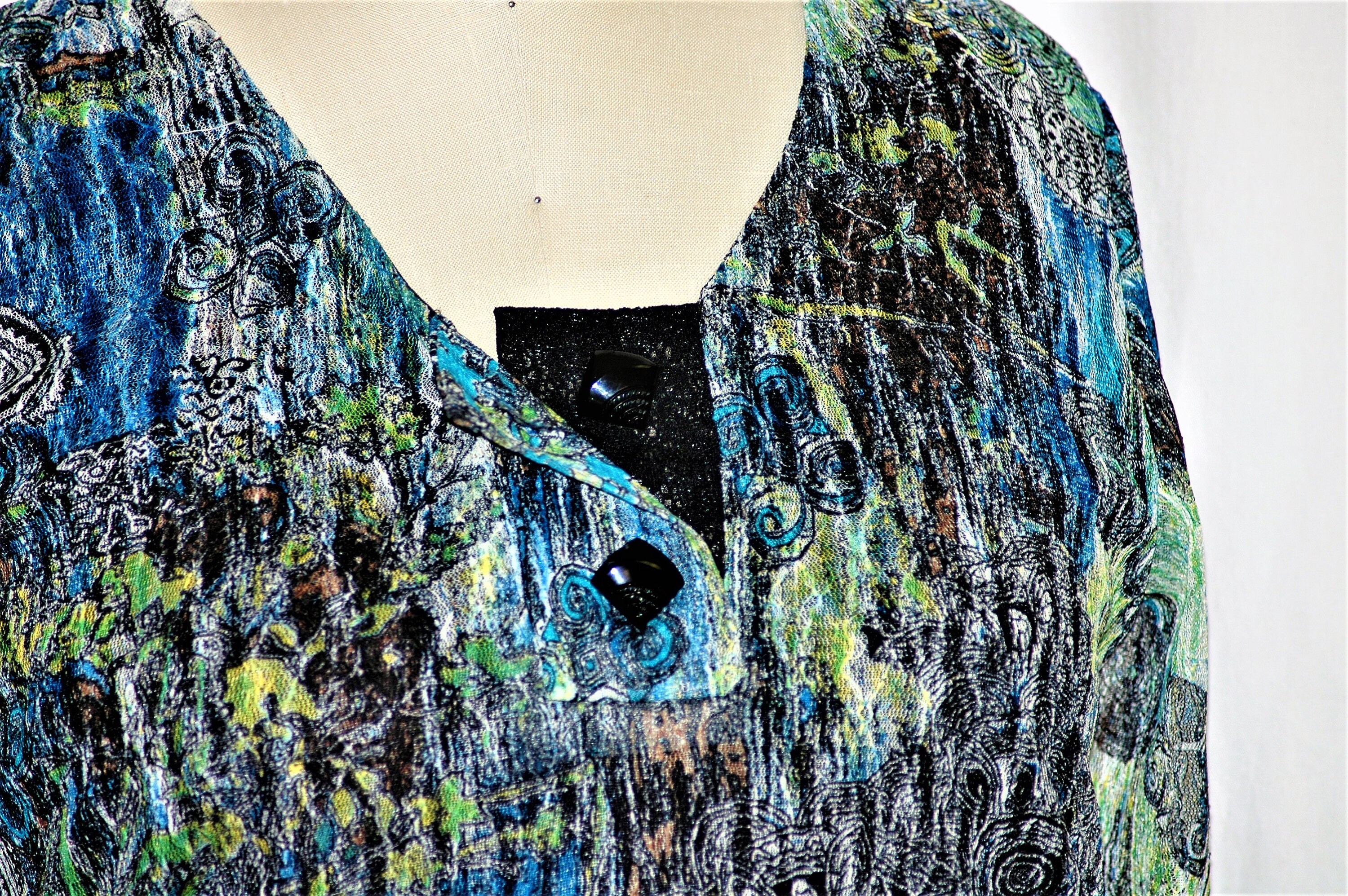 A very soft multi color lace with an open neckline, with a functioning 2 button tab which you can leave open for a peek of black lace. Has an asymmetrical hem that dips on the sides with more black lace peeking through.