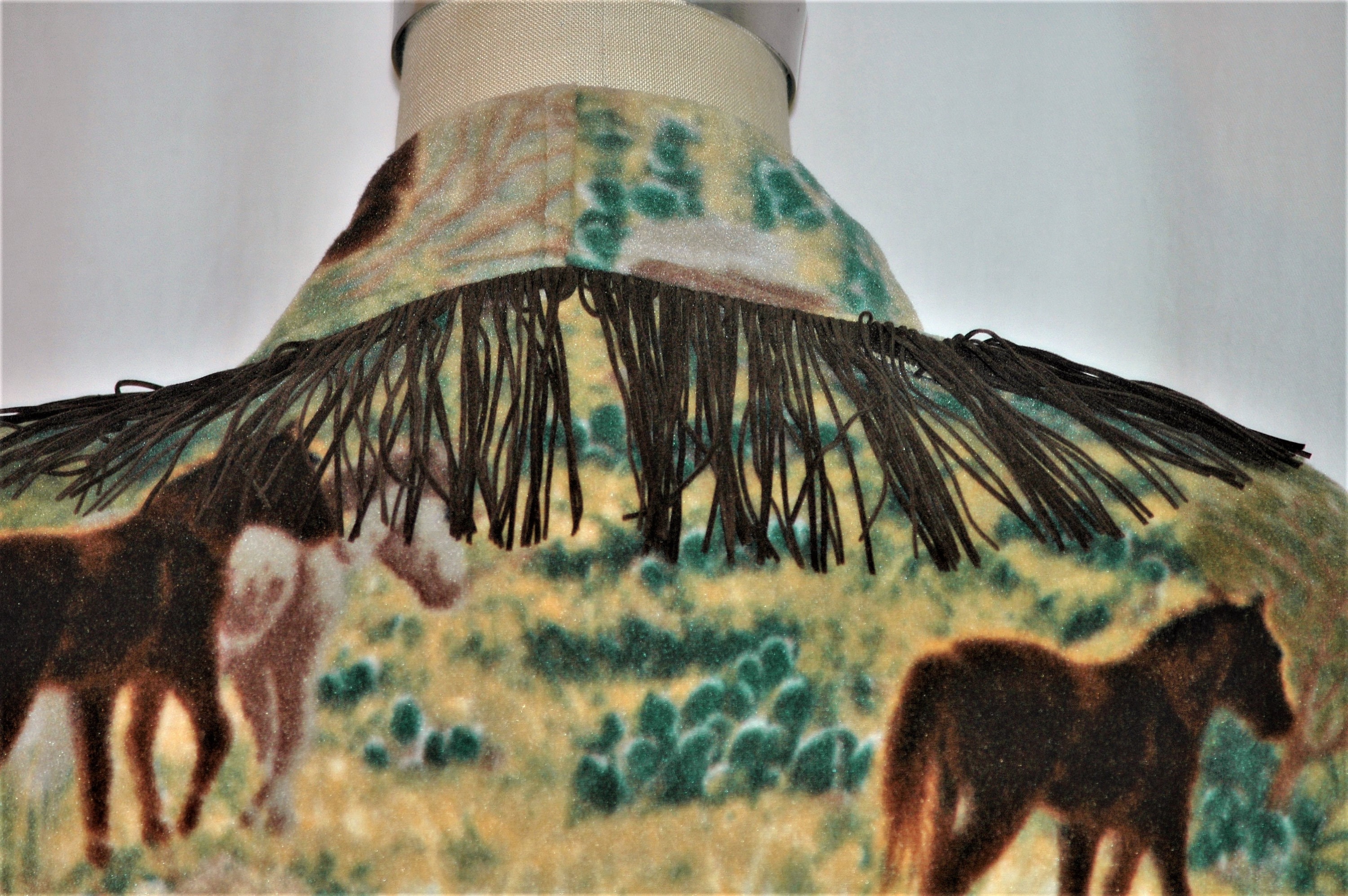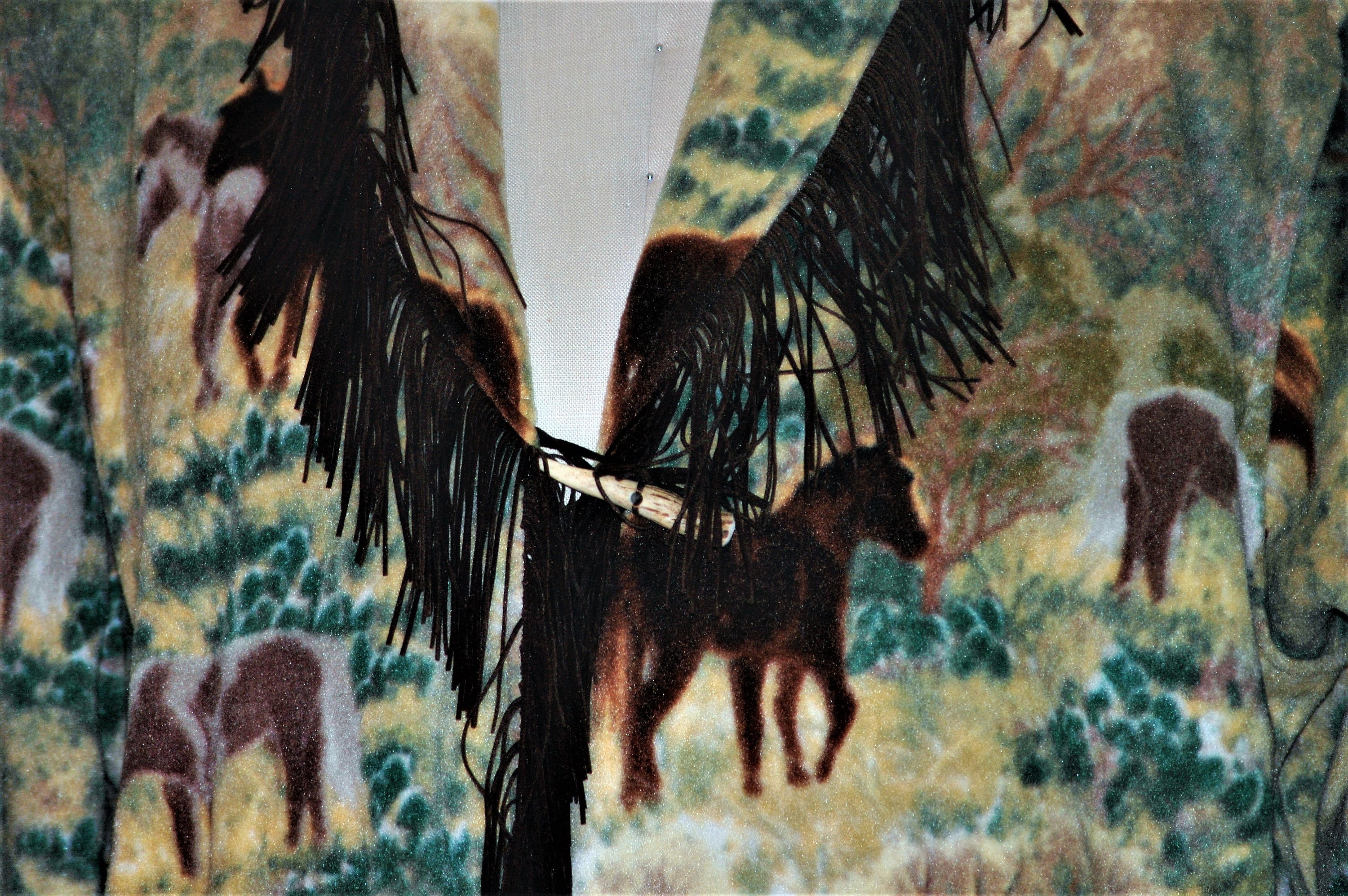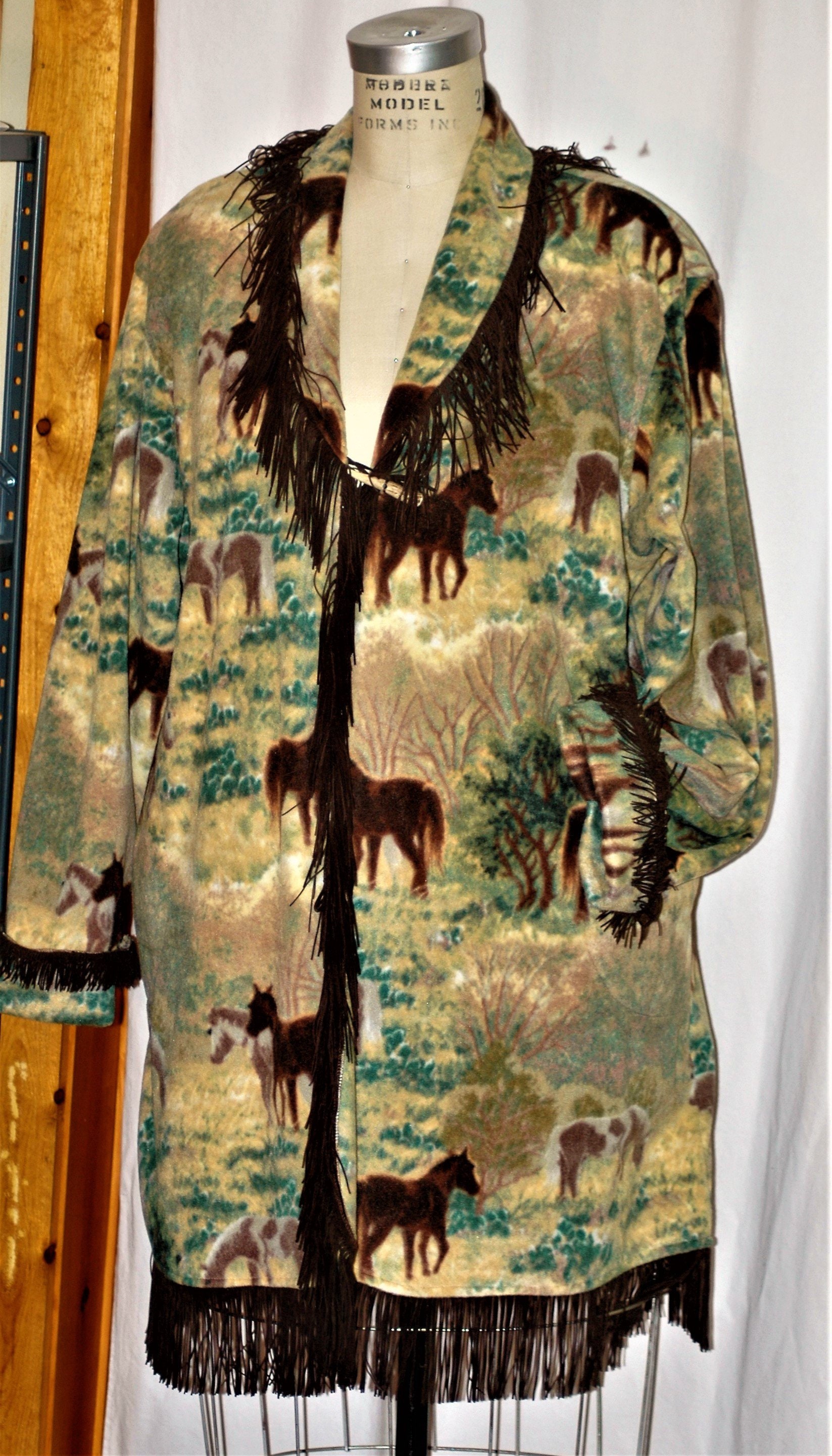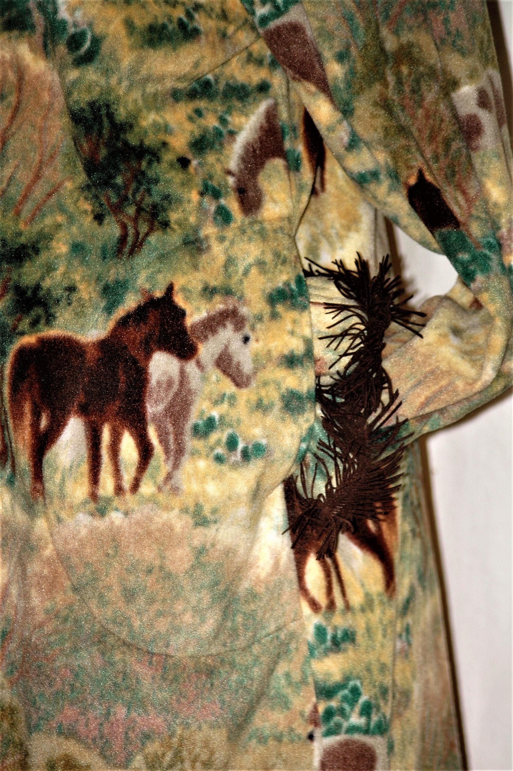 ONE of a KIND shawl collar with very soft muted colors of green and beige for the back ground of trees and foliage with horses grazing. Very light weight on the body but very warm. It is very easy to travel with packs small and does not add weight to a suit case (about 2lbs) .Great for every day it is practial and a show stopper