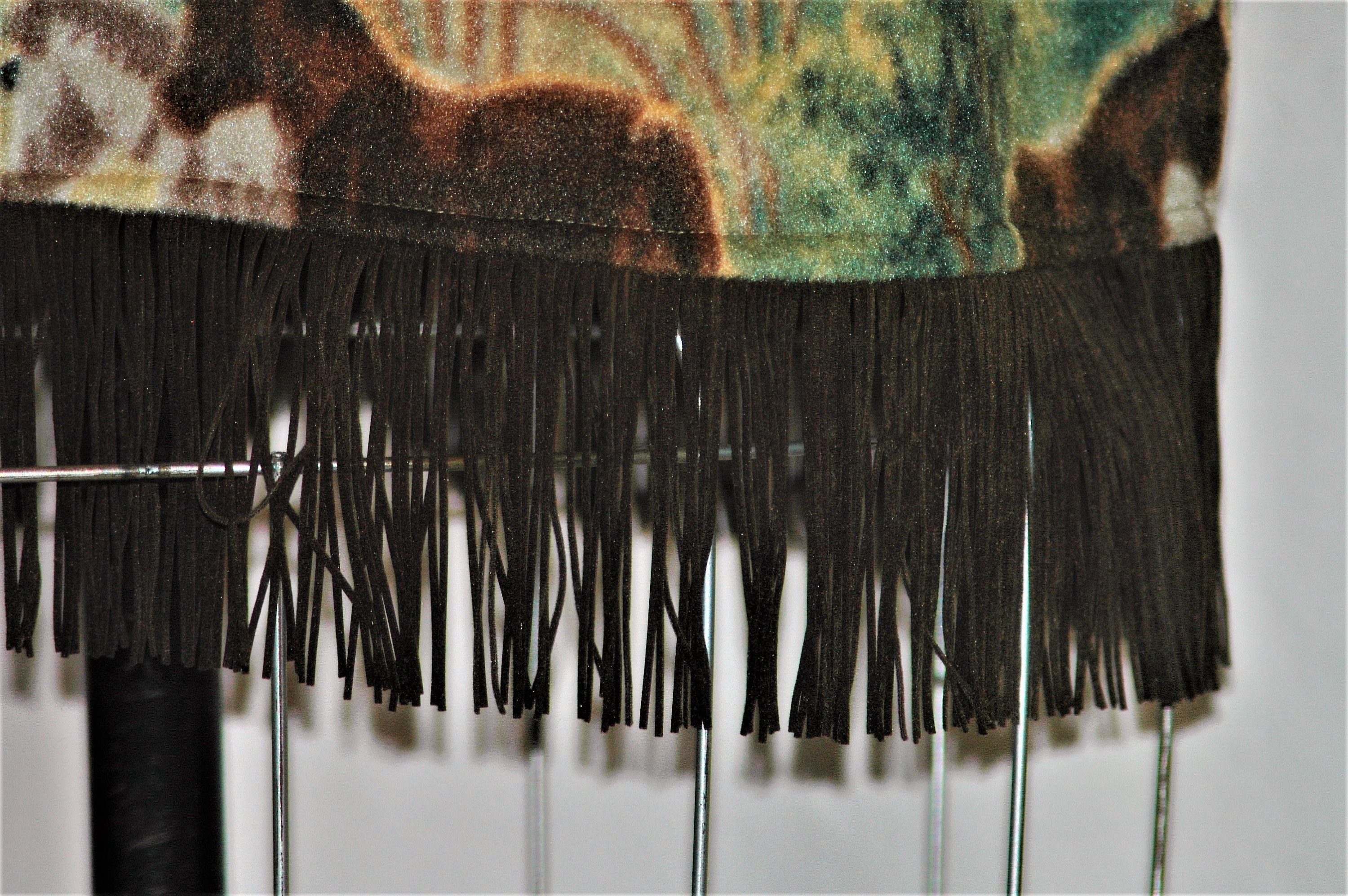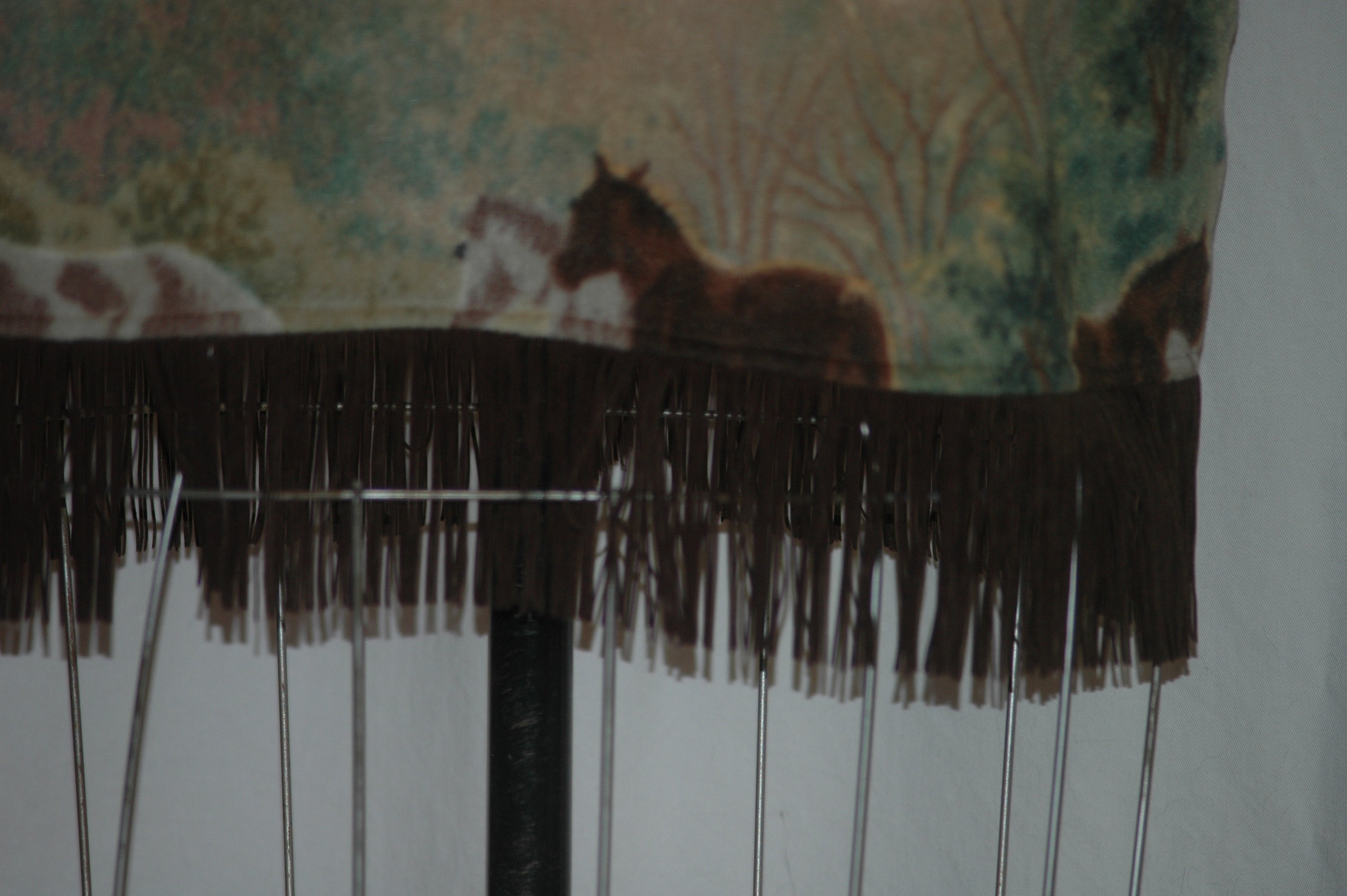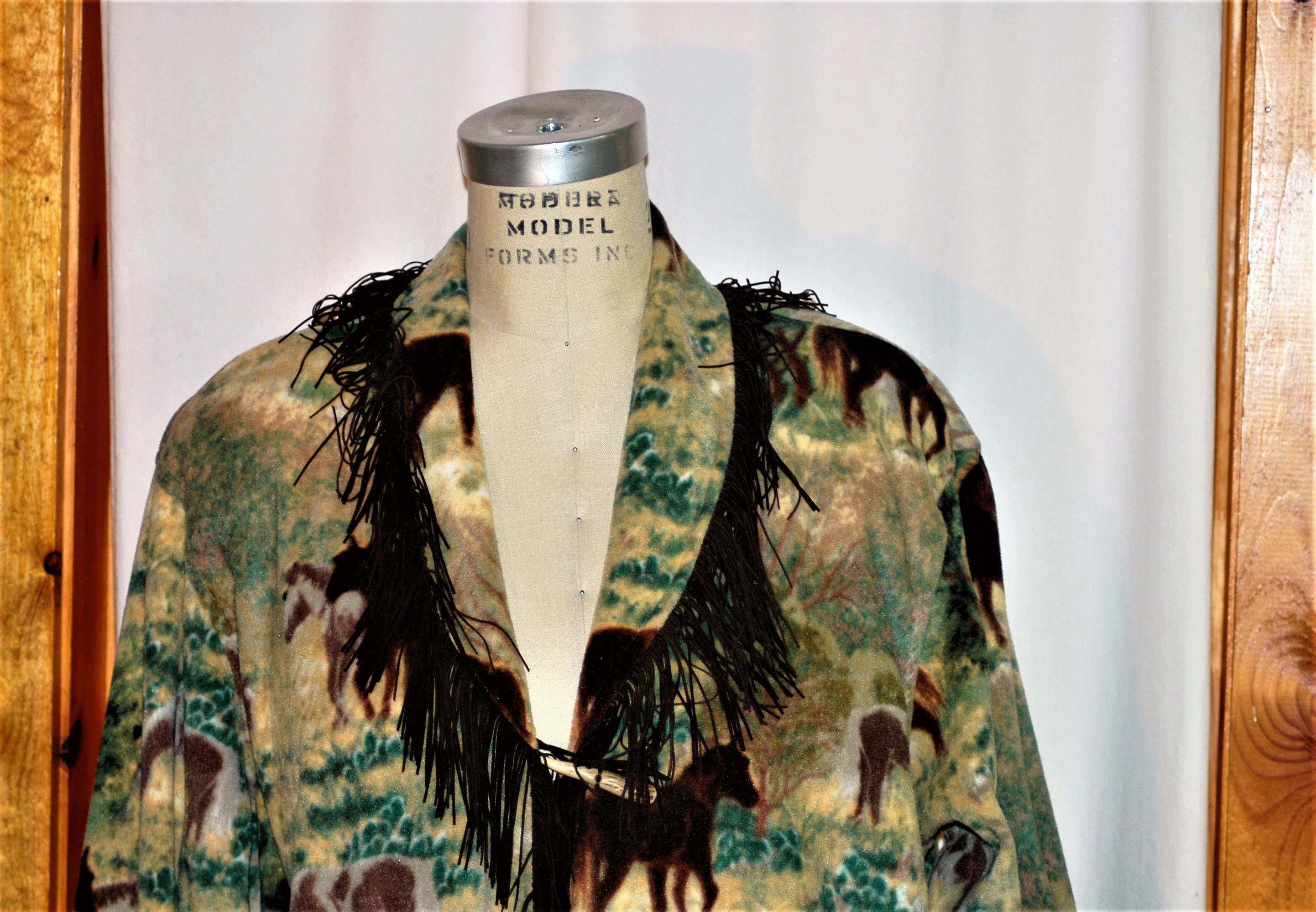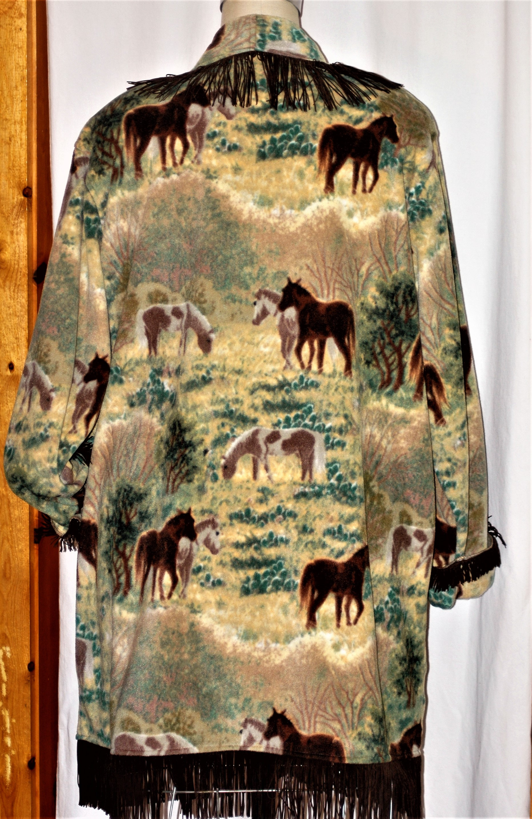 ONE of a KIND shawl collar with very soft muted colors of green and beige for the back ground of trees and foliage with horses grazing. Very light weight on the body but very warm. It is very easy to travel with packs small and does not add weight to a suit case (about 2lbs) .Great for every day it is practial and a show stopper
