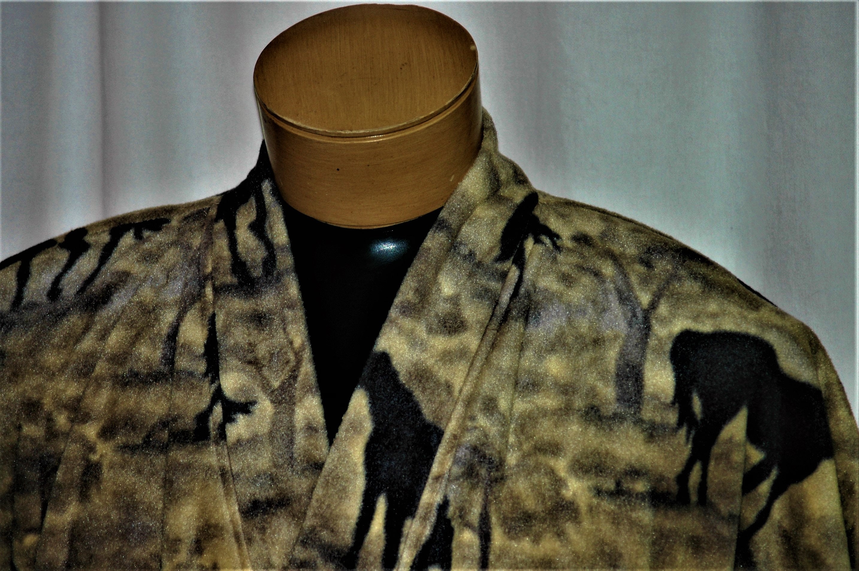 Camouflage like background with silouettes of horses on this velour anti-pill winter fleece robe with a generous wrap and calf length