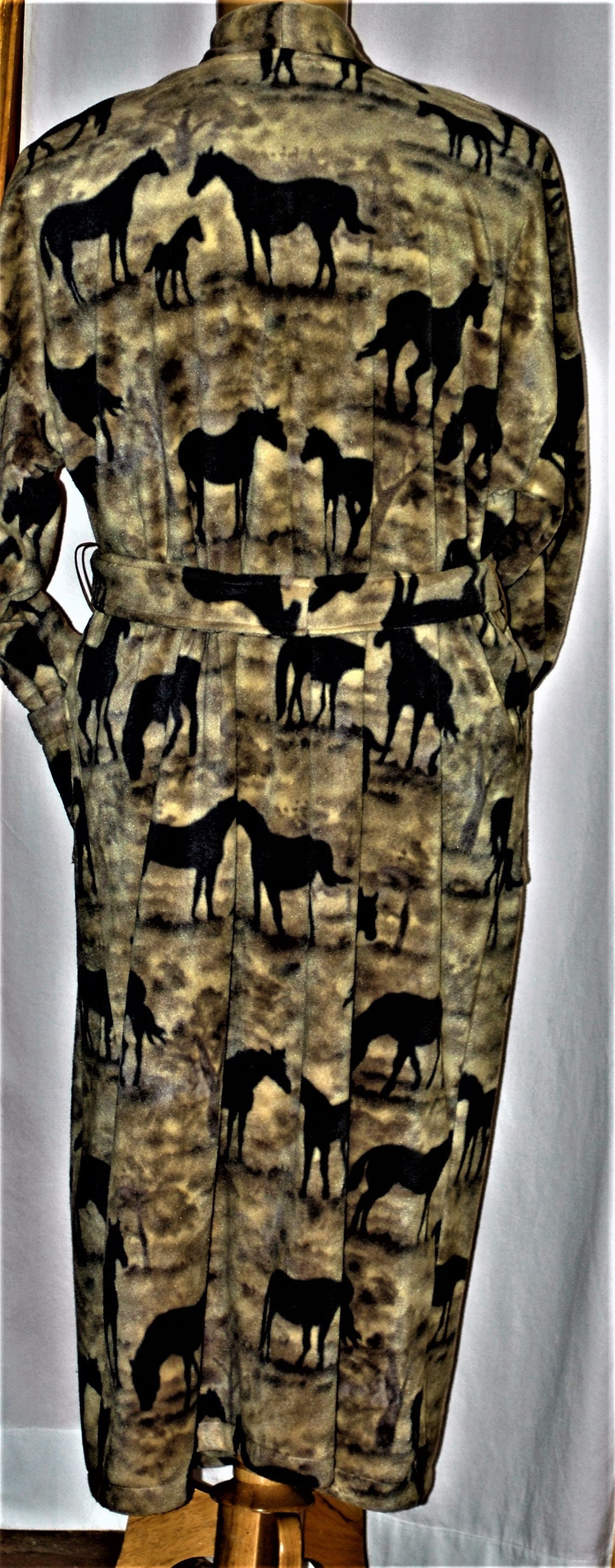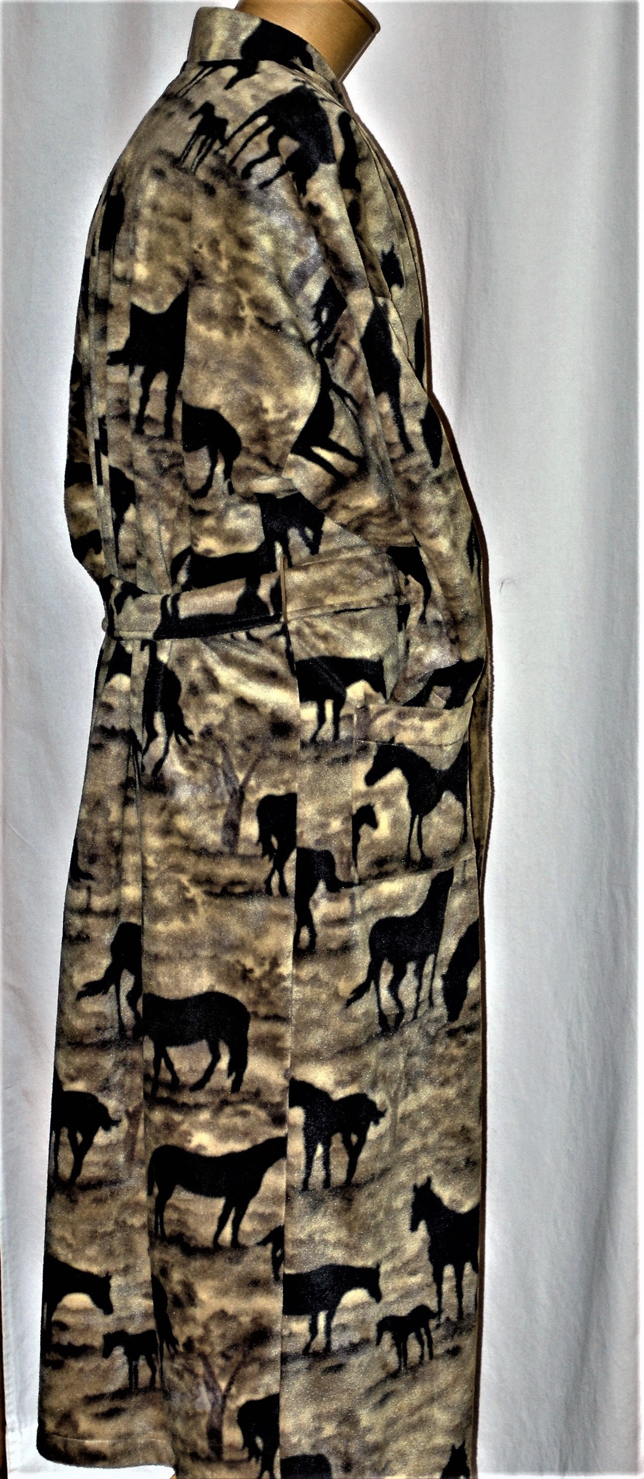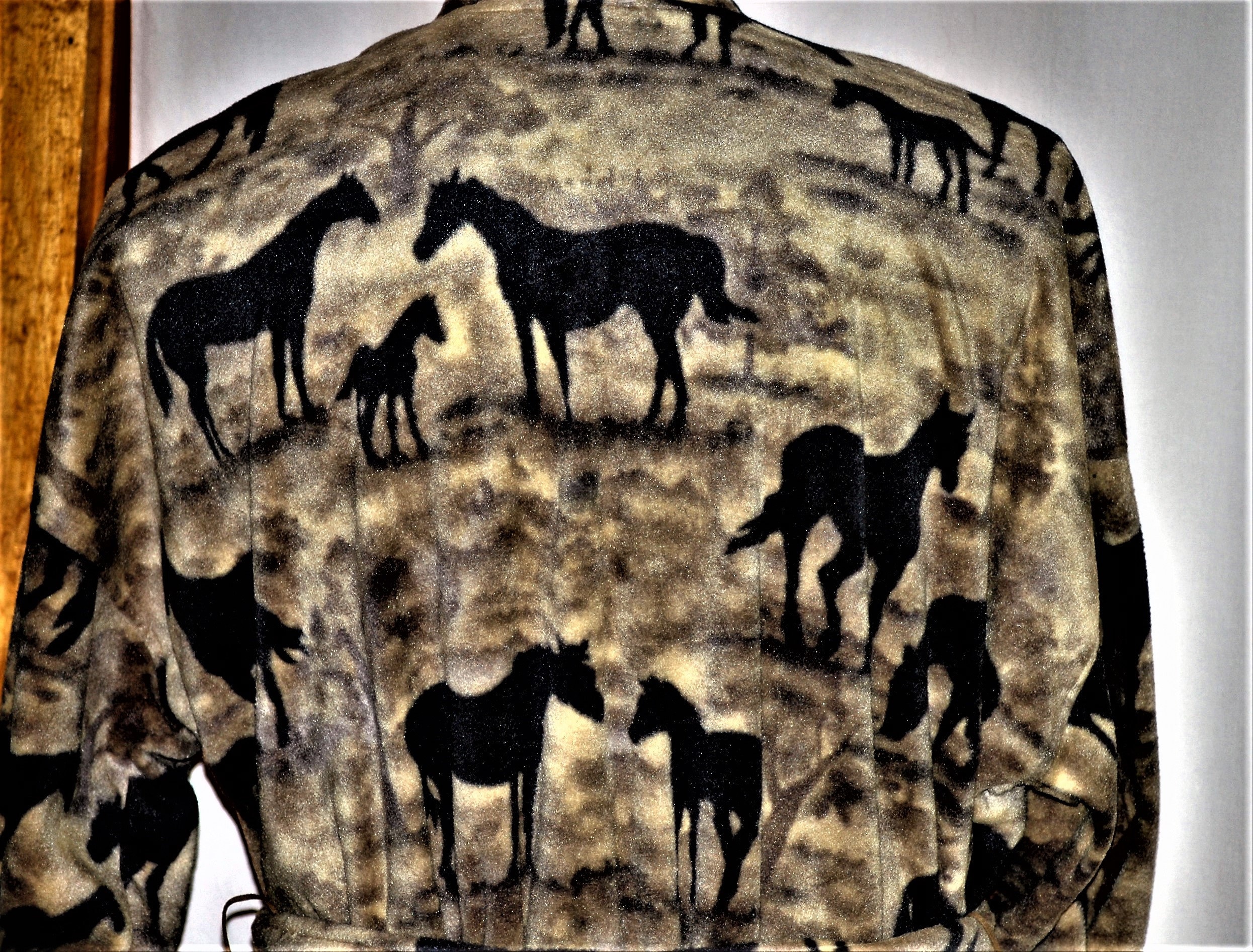Camouflage like back ground with silhouettes of horses on a generous wrap ant-pill velour winter fleece. Wrap yourself (or one you love) in the warm comfort of an ultra-soft fleece robe. Has a generous wrap won't open when you sit. he perfect gift for any occasion with exceptional lounging lounge wear. Only one ever made