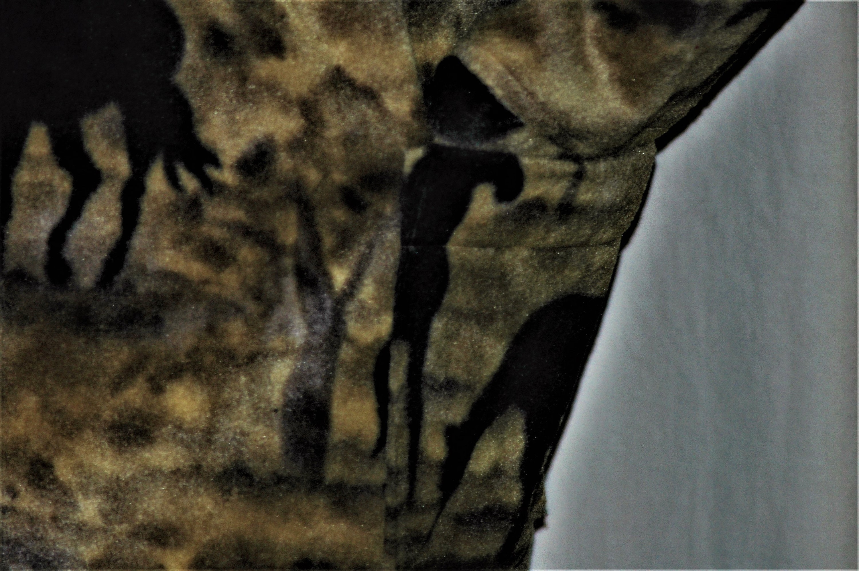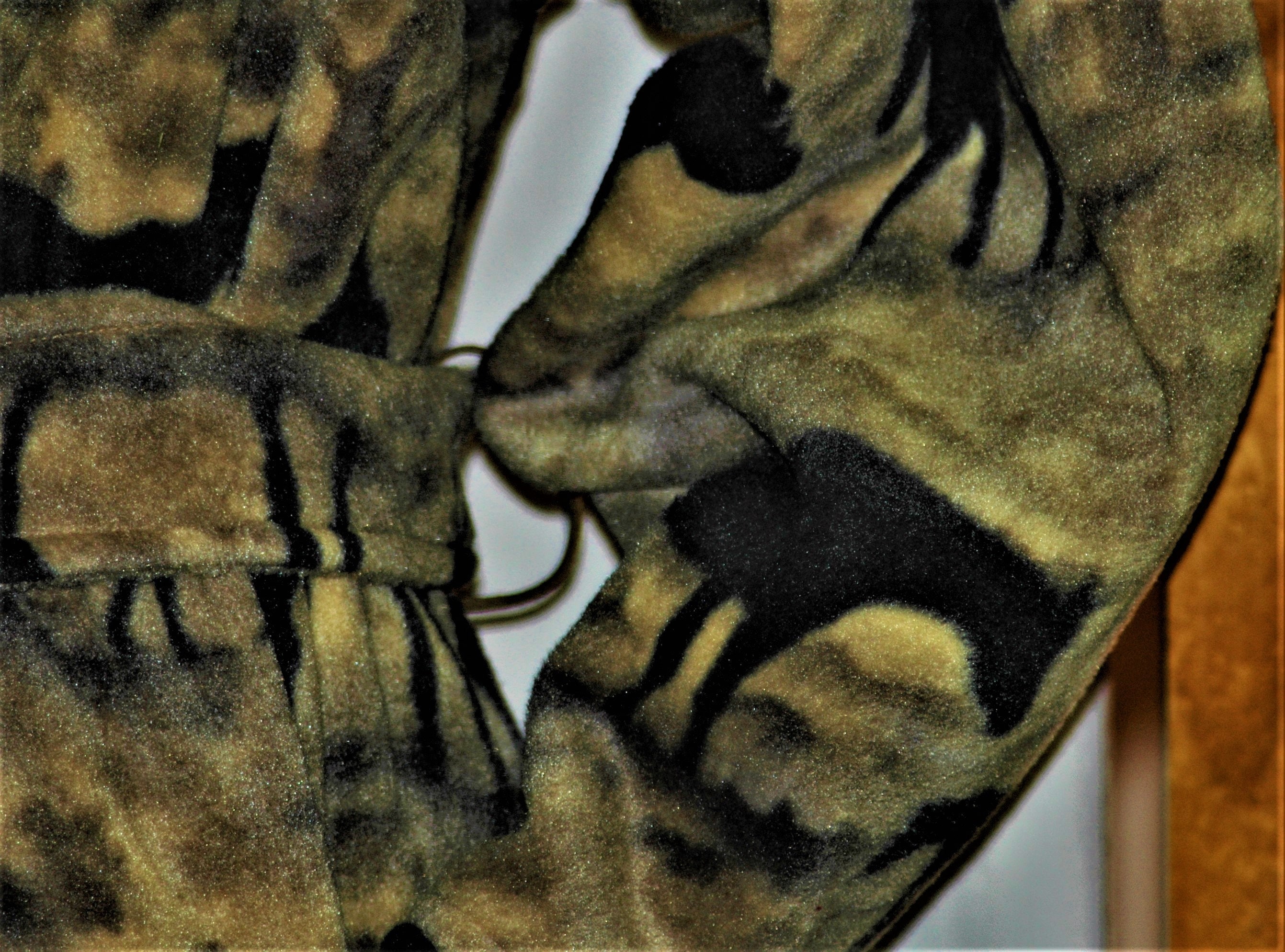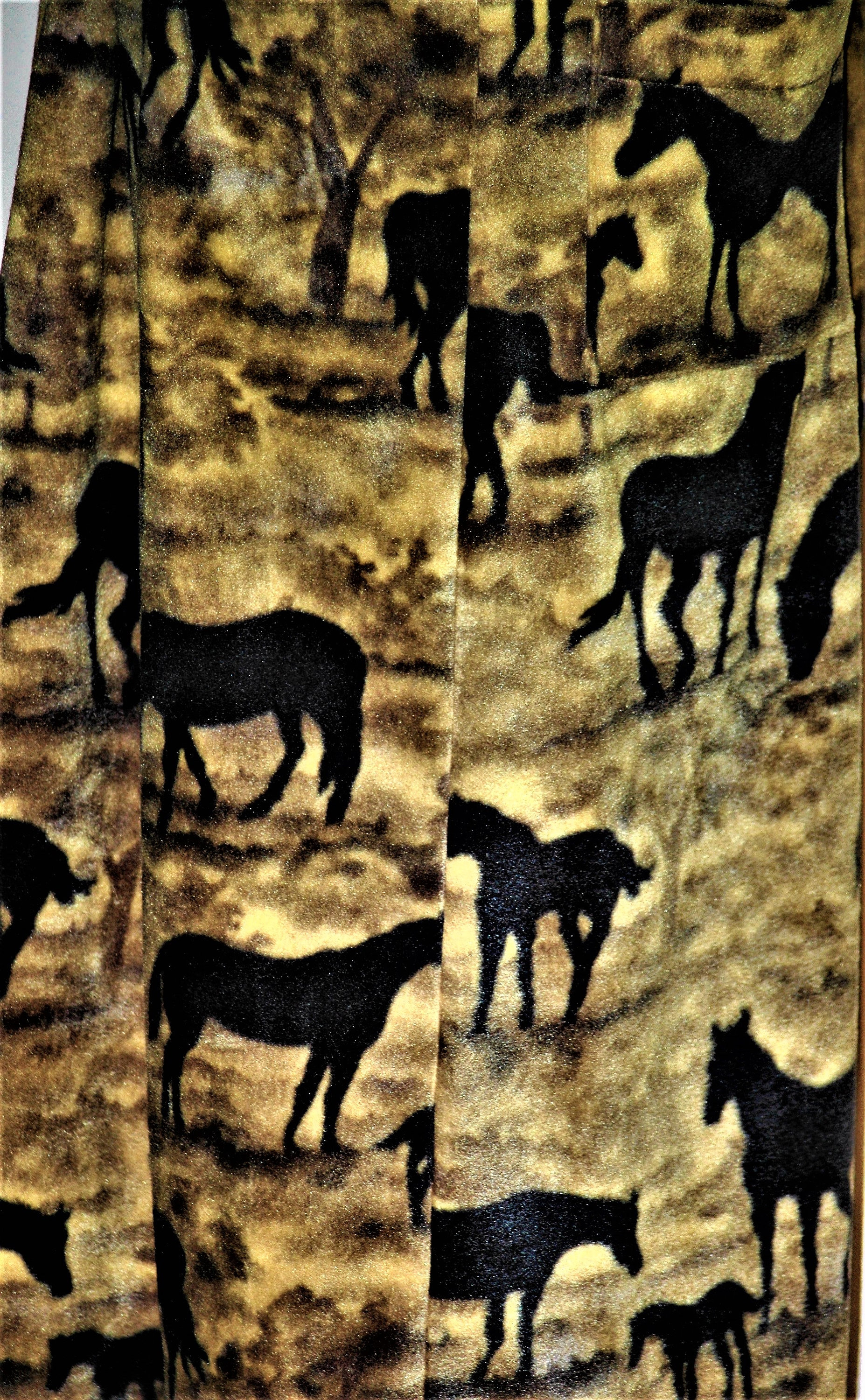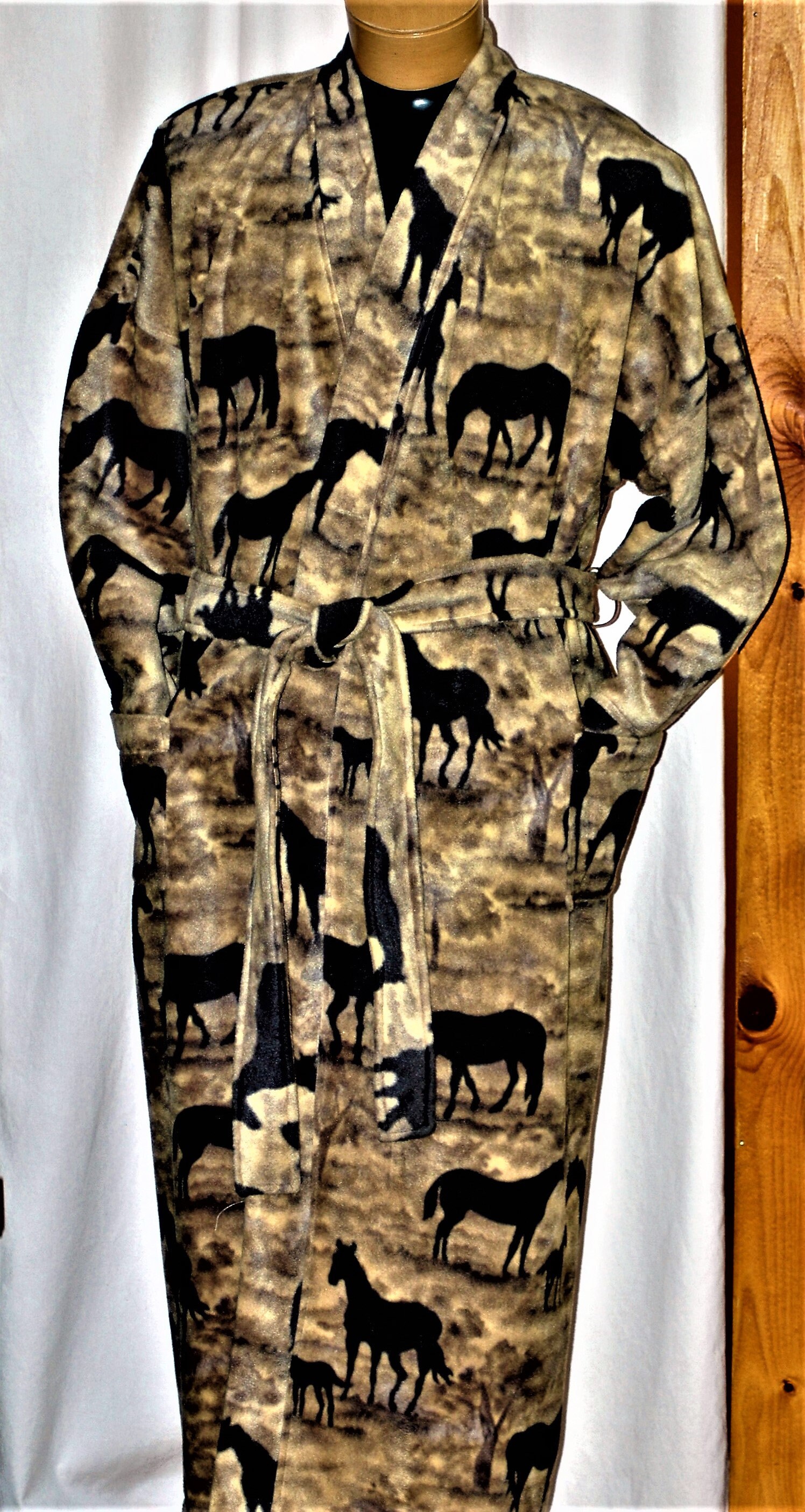 Camouflage like back ground with silhouettes of horses on a generous wrap ant-pill velour winter fleece. Wrap yourself (or one you love) in the warm comfort of an ultra-soft fleece robe. Has a generous wrap won't open when you sit. he perfect gift for any occasion with exceptional lounging lounge wear. Only one ever made