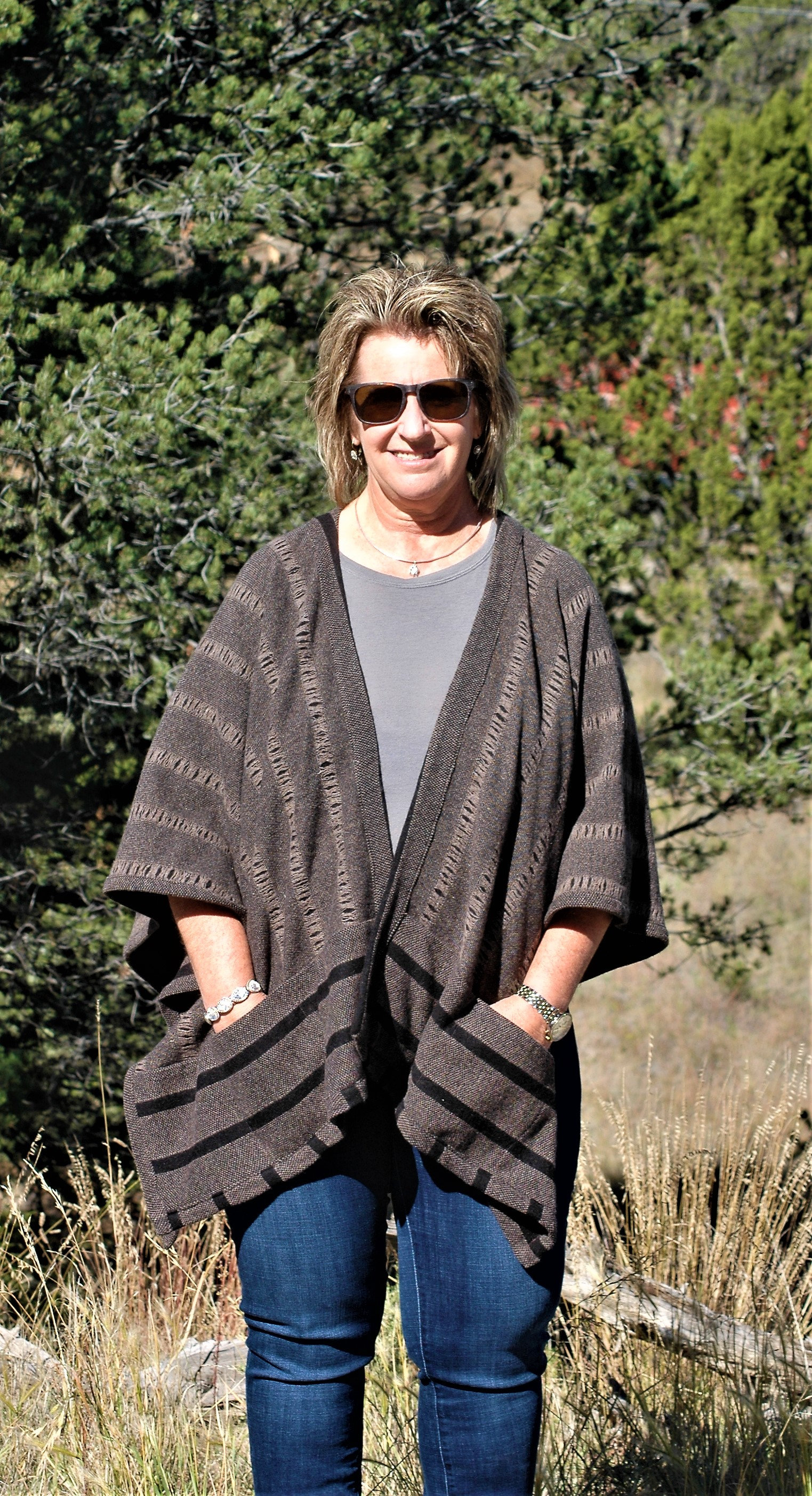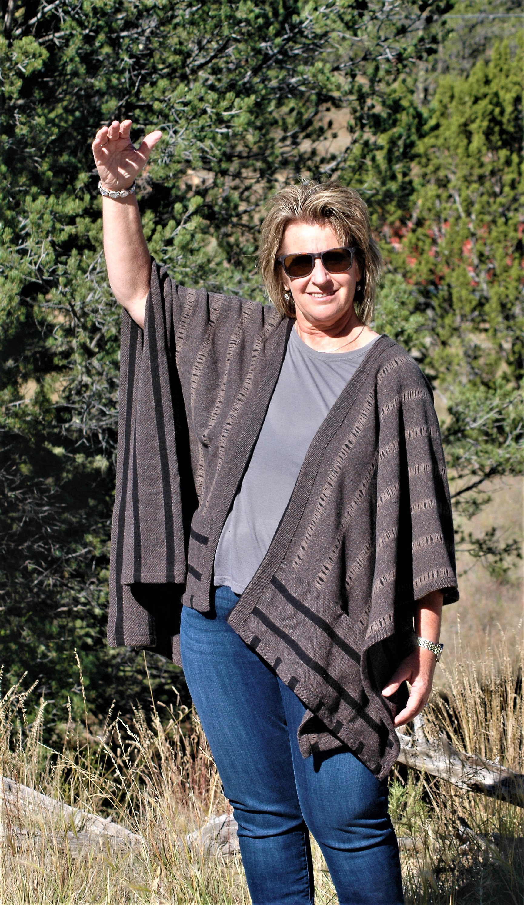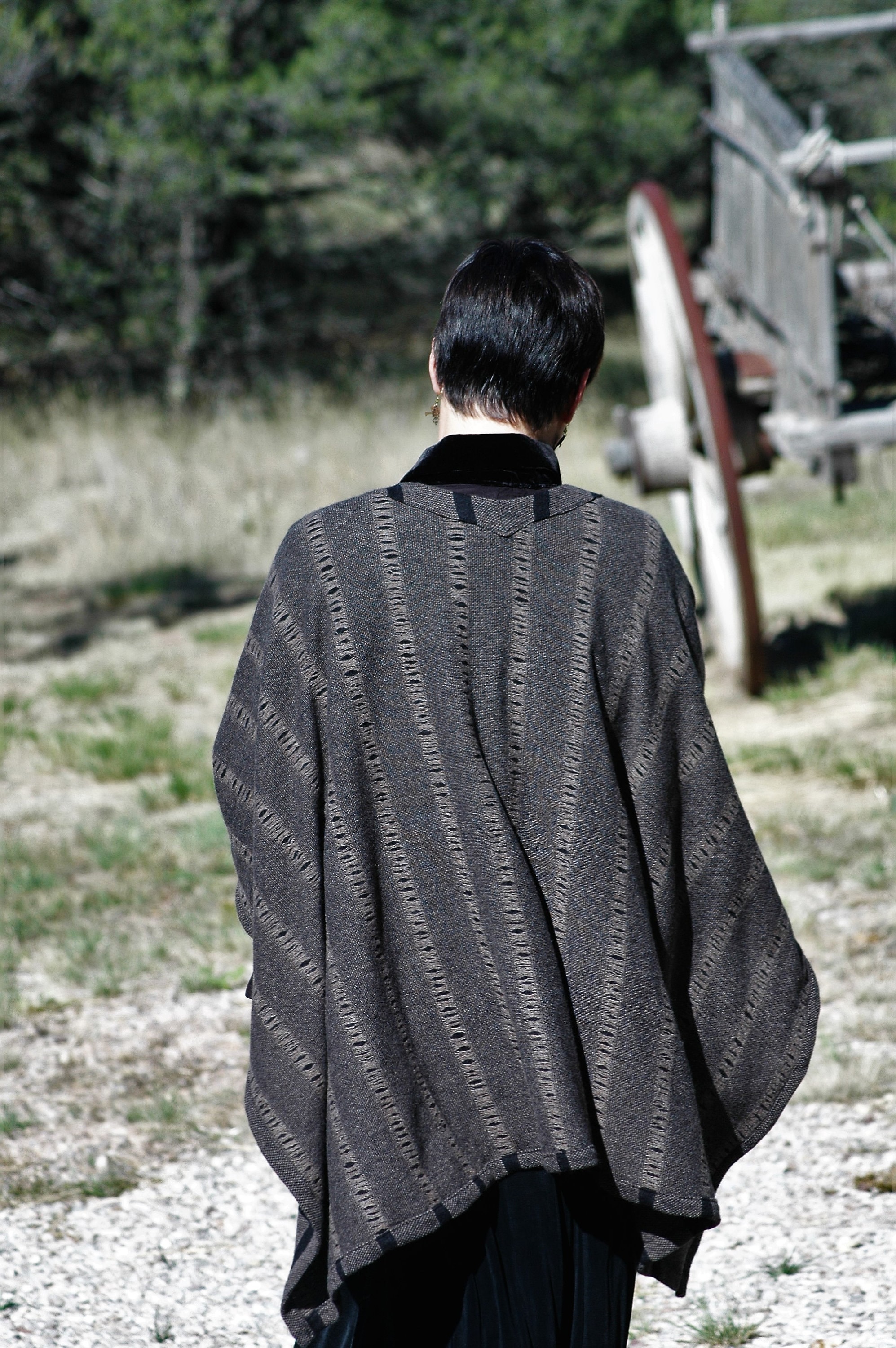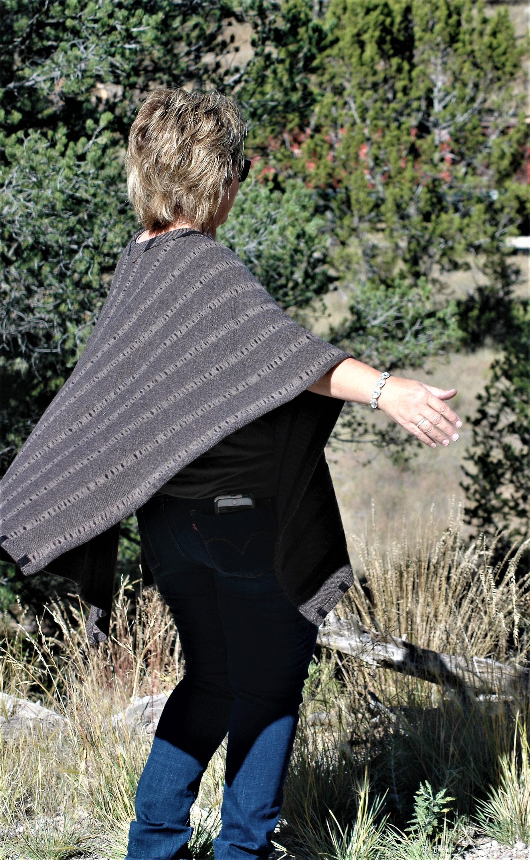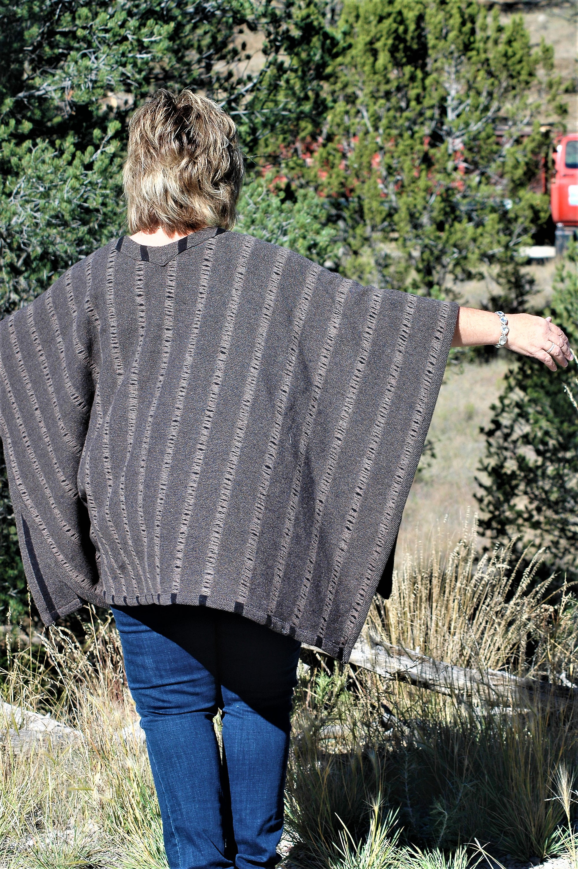 ONE SIZE Italian wool ruana, a beautiful wool black and taupe with an open stitch in the stripe with a sophisticated look to carry you from work to an evening out. Light as a feather on and so warm . So easy to grab and throw on, a great travel wrap. Makes a great gift you don't half to worry about size.