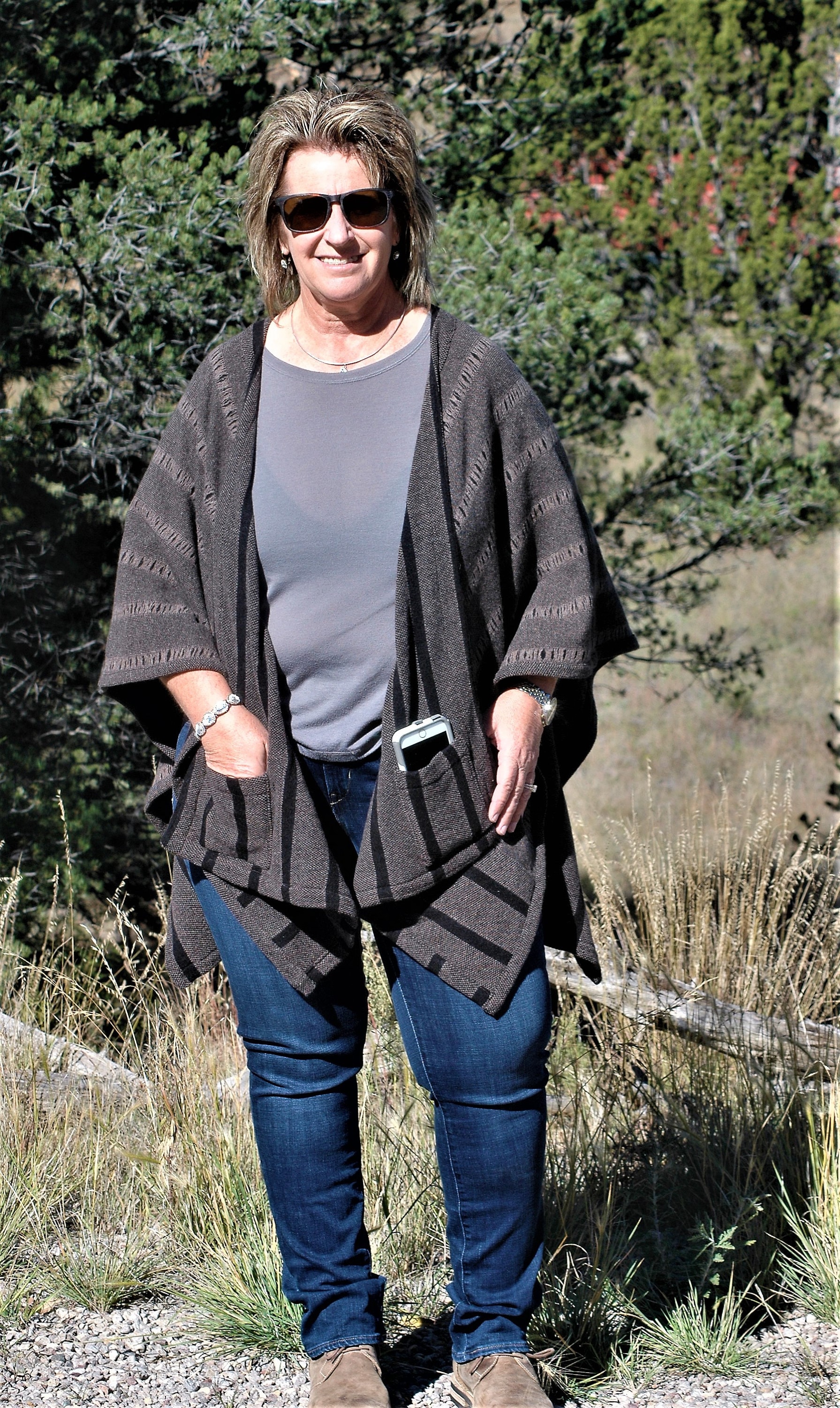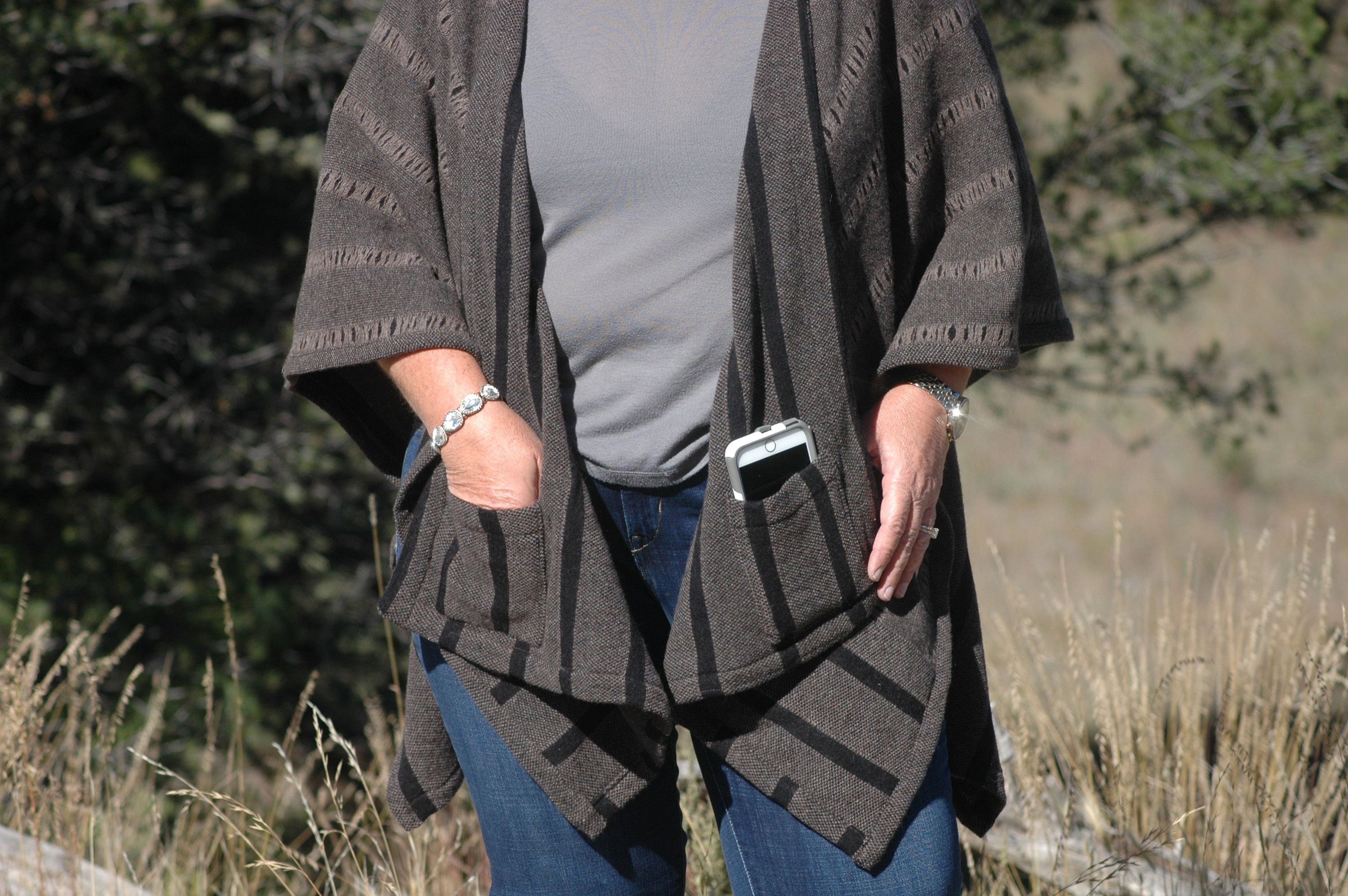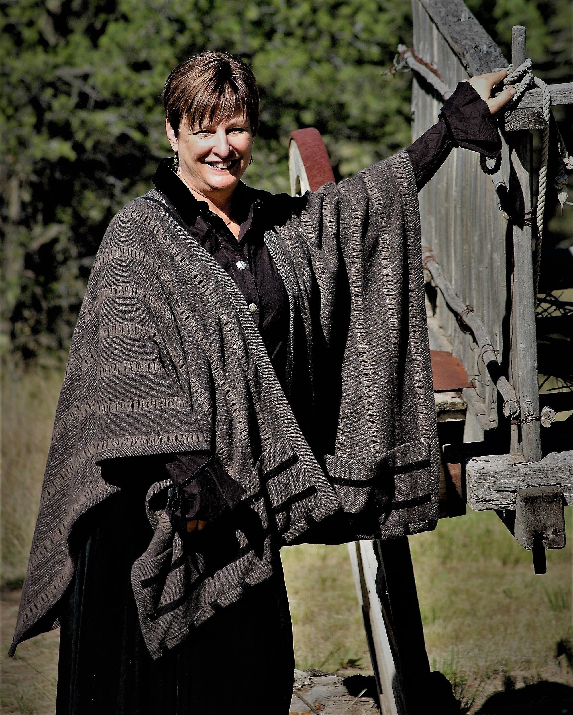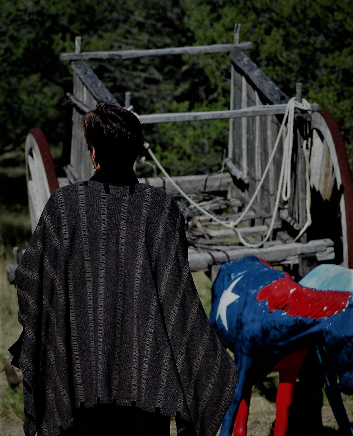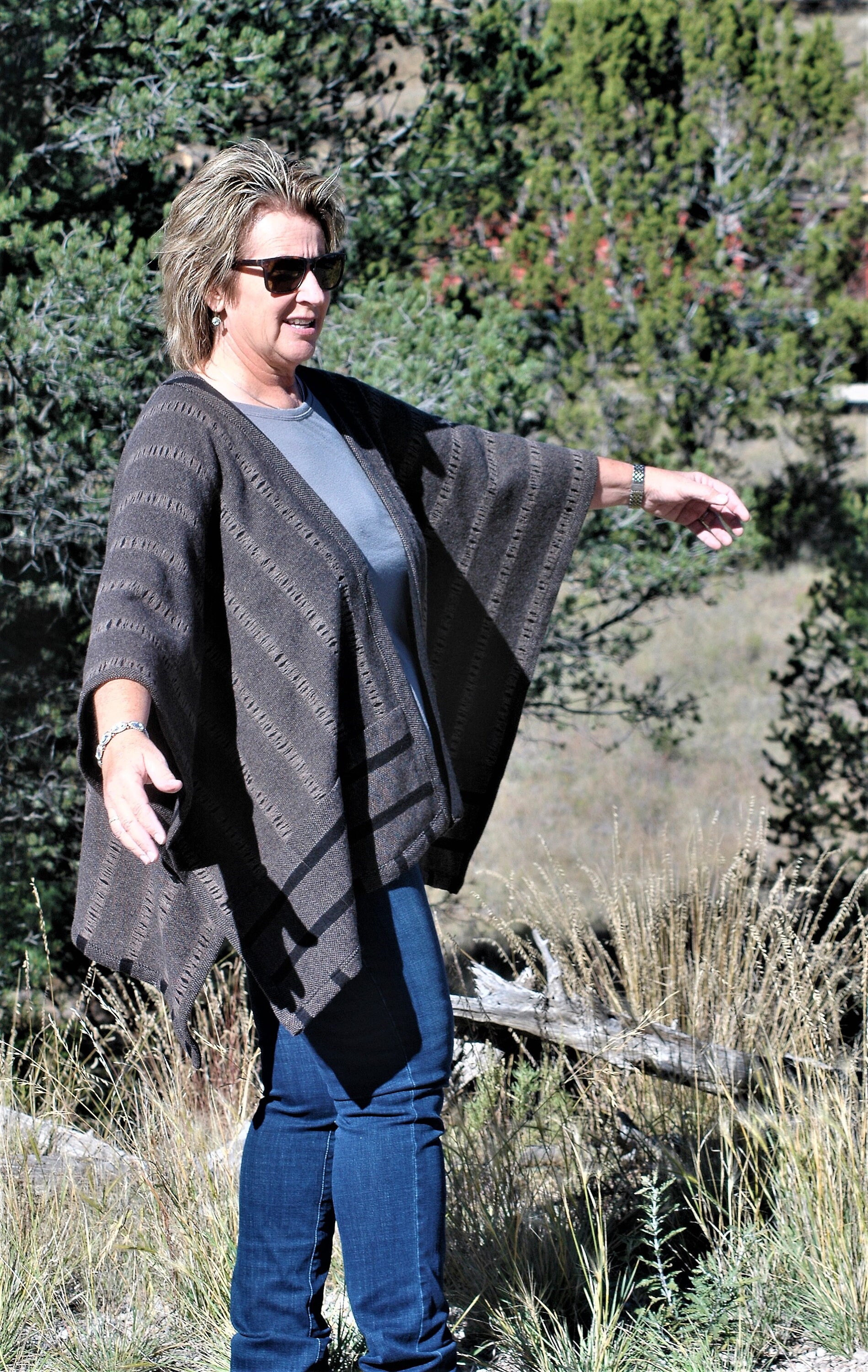 ONE SIZE Italian wool ruana, a beautiful wool black and taupe with an open stitch in the stripe with a sophisticated look to carry you from work to an evening out. Light as a feather on and so warm . So easy to grab and throw on, a great travel wrap. Makes a great gift you don't half to worry about size.
