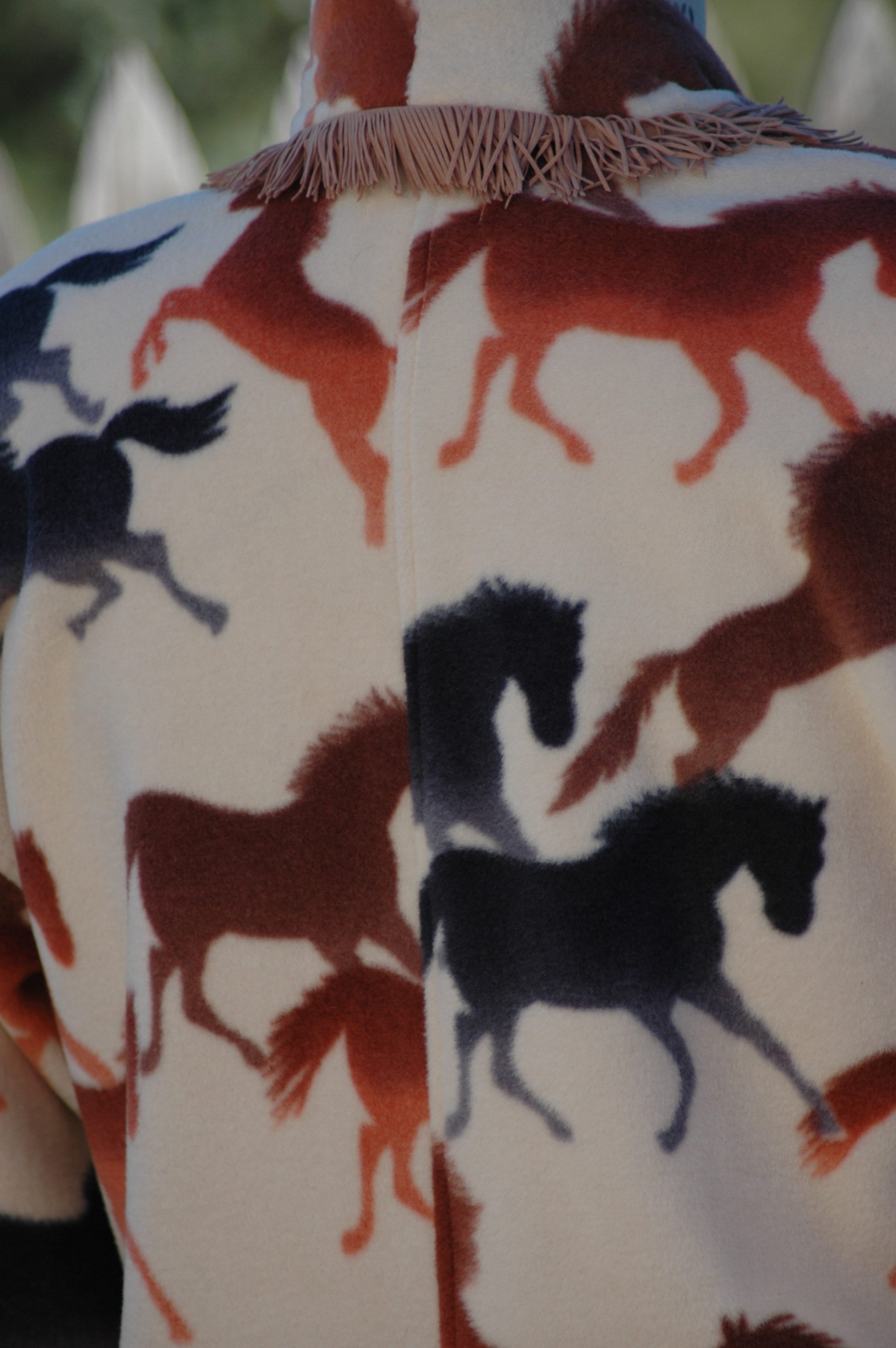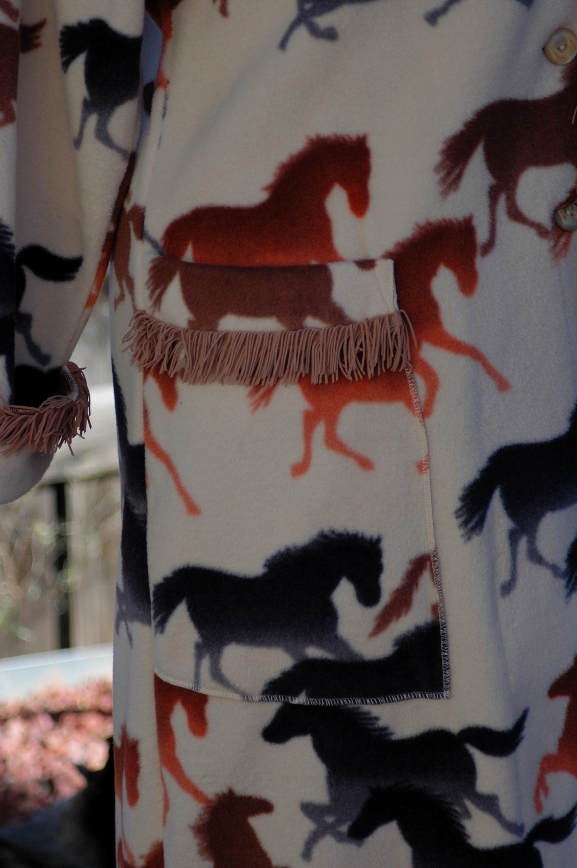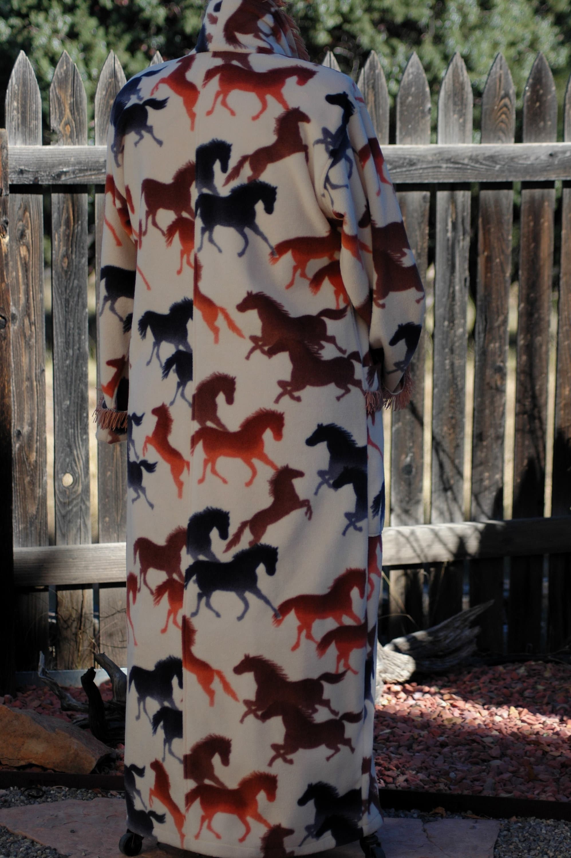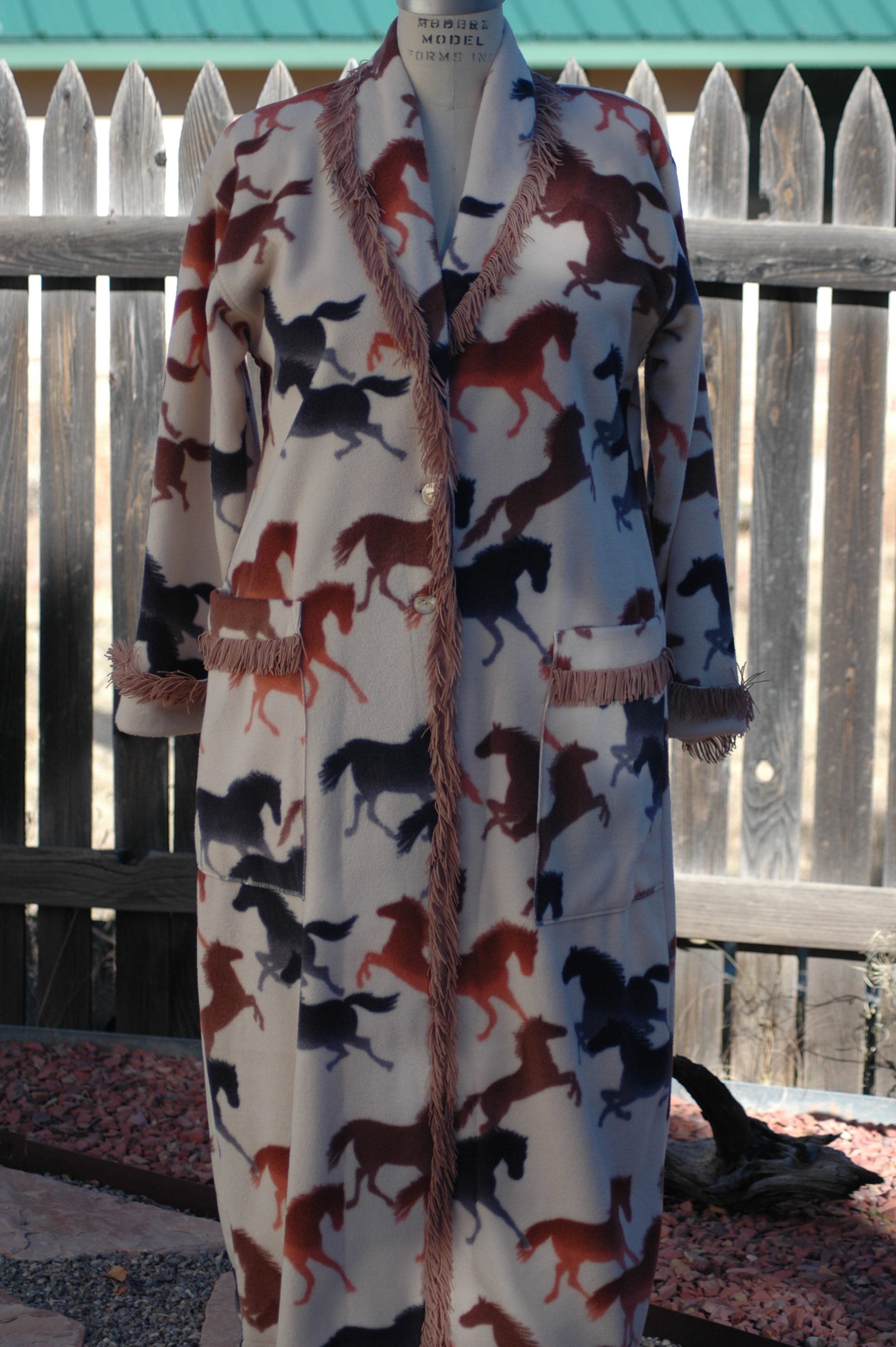 Horse print on a luxury velour anti-pill fleece full length coat. Very light weight on the body, but very warm and cuddly. this is a great jacket for traveling, I have used mine as a blanket on airplanes; you can roll it up use it as a pillow unroll it put it back on and no one would ever know. It does not wrinkle. You will get many compliments on this when you wear it.