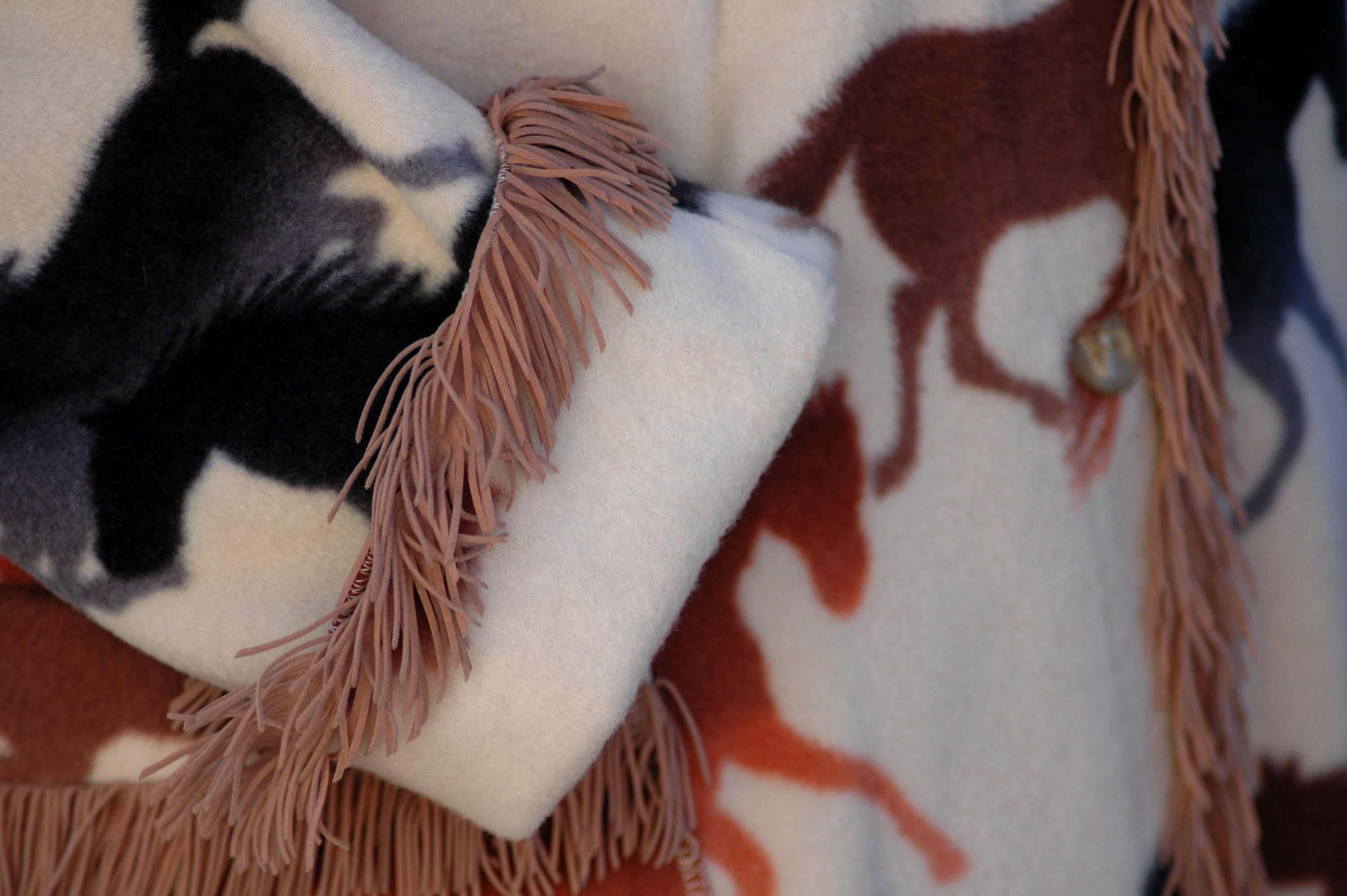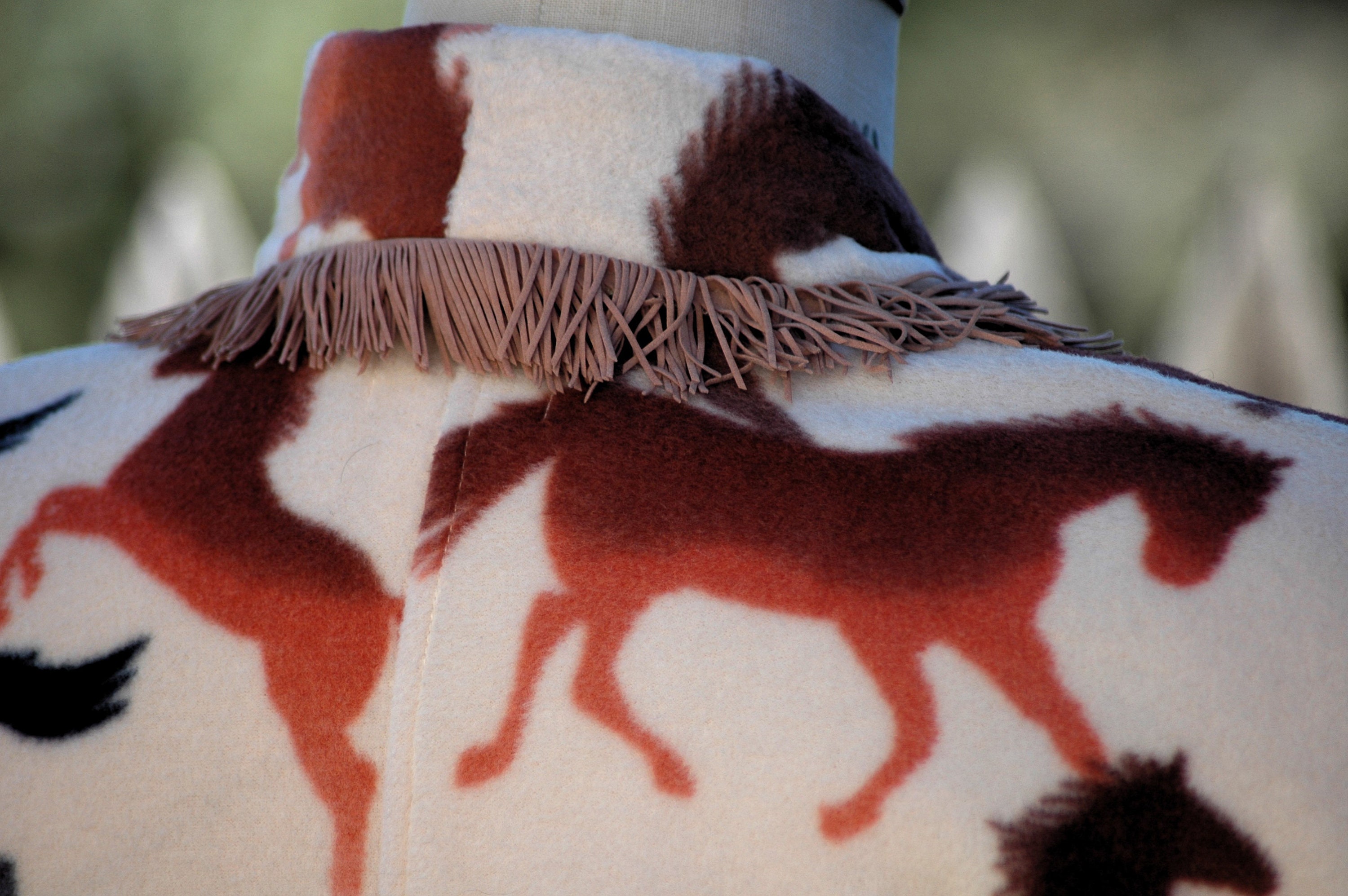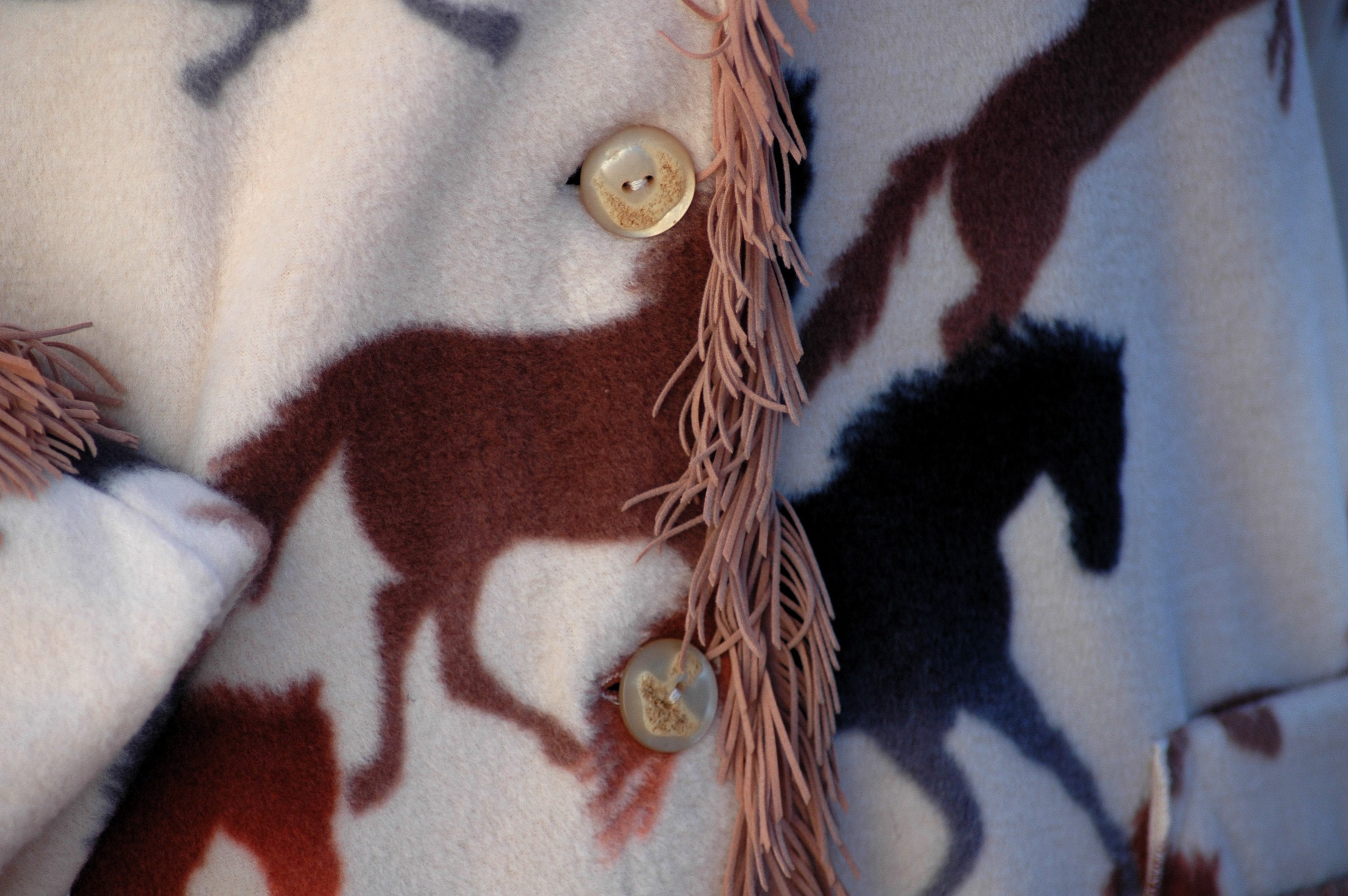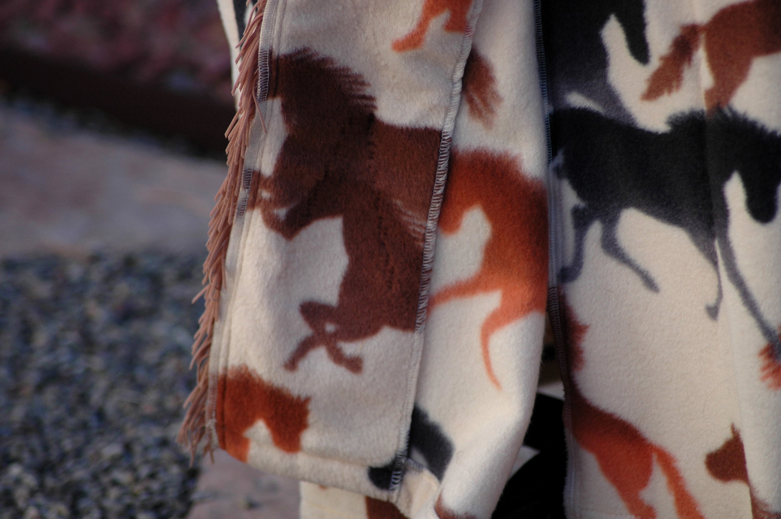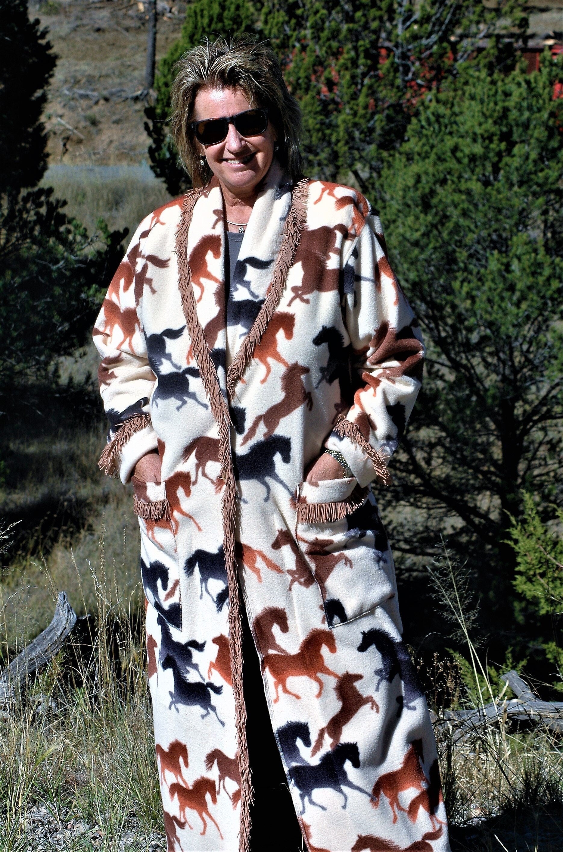 Horse print on a luxury velour anti-pill fleece full length coat. Very light weight on the body, but very warm and cuddly. this is a great jacket for traveling, I have used mine as a blanket on airplanes; you can roll it up use it as a pillow unroll it put it back on and no one would ever know. It does not wrinkle. You will get many compliments on this when you wear it.