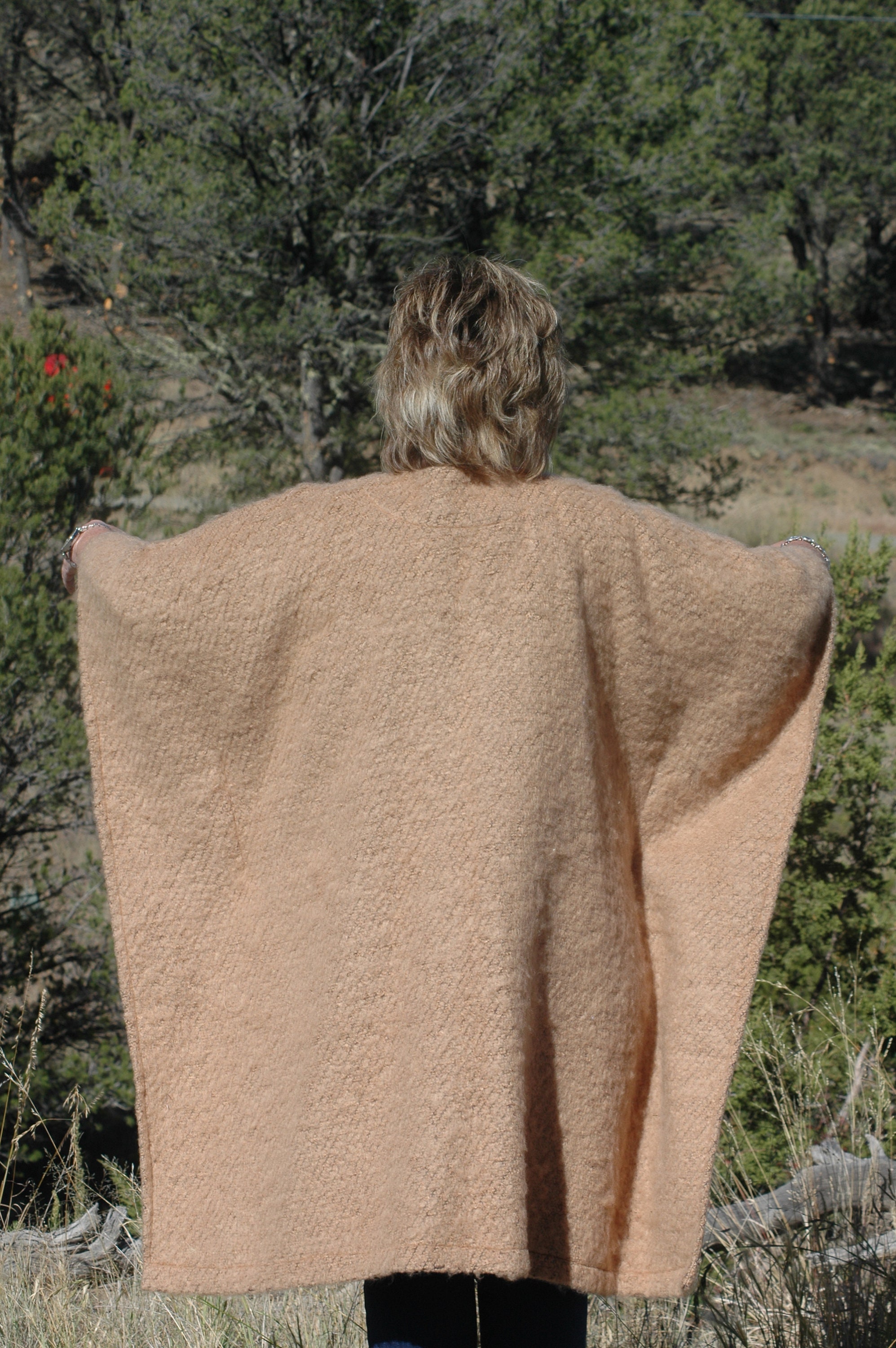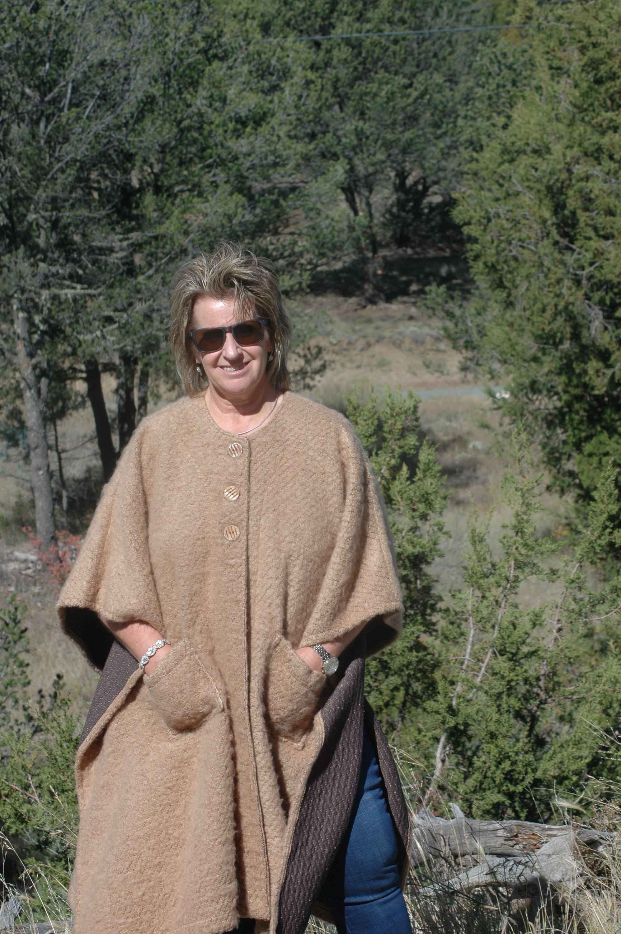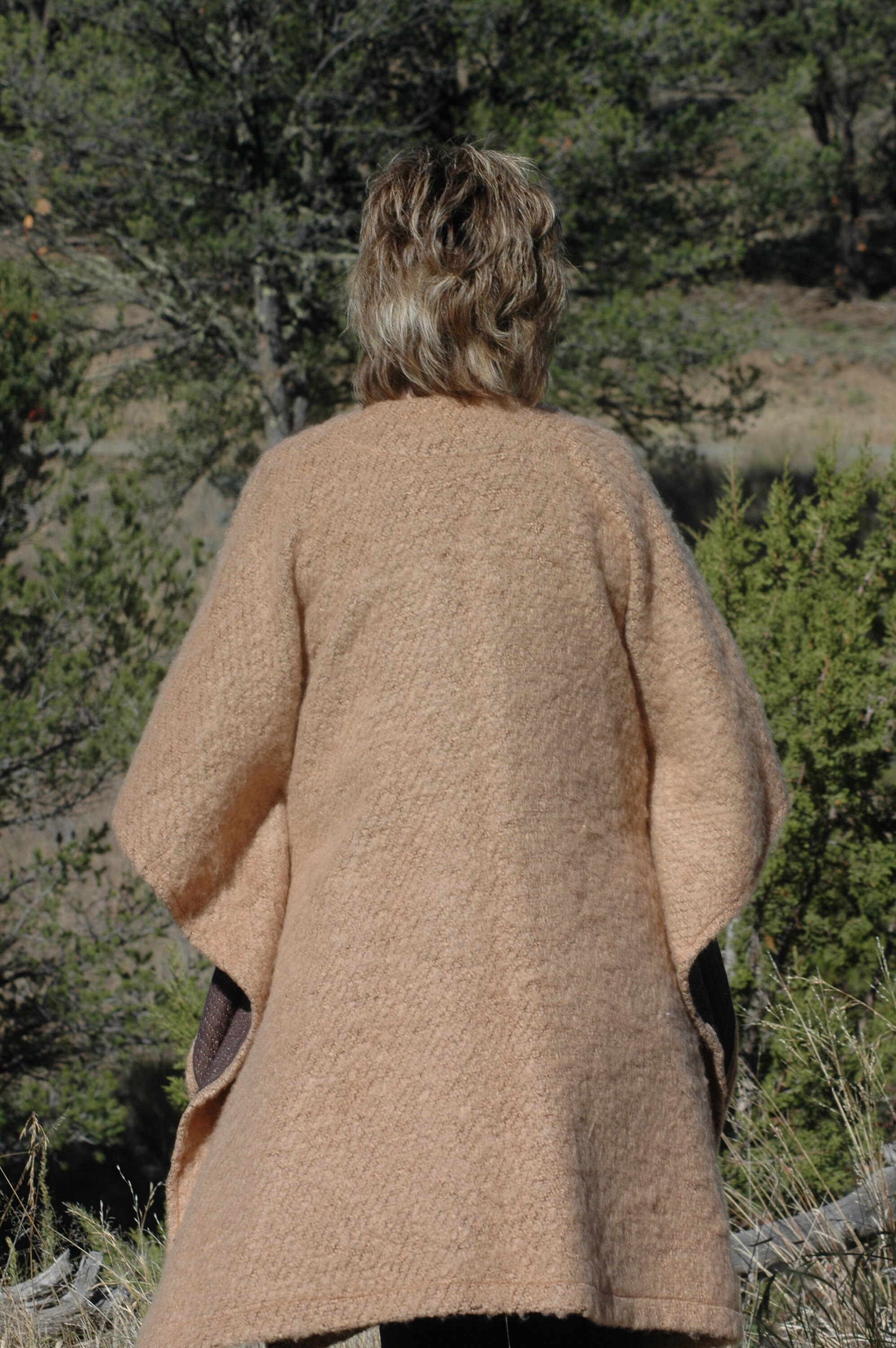 Wool cape out of the softest and fuzziest wool from Italy. Quilted on the inside to add warmth and body to hang like a coat. Has short side seam for your arms so it will act like a coat on. A great accessory to just throw on over work clothes to carry you into evening and or just play time. Very warm and chic, makes a great gift. Travels well also. Makes a wonderful gift for that someone special or treat yourself to something that is just so cozy and soft.