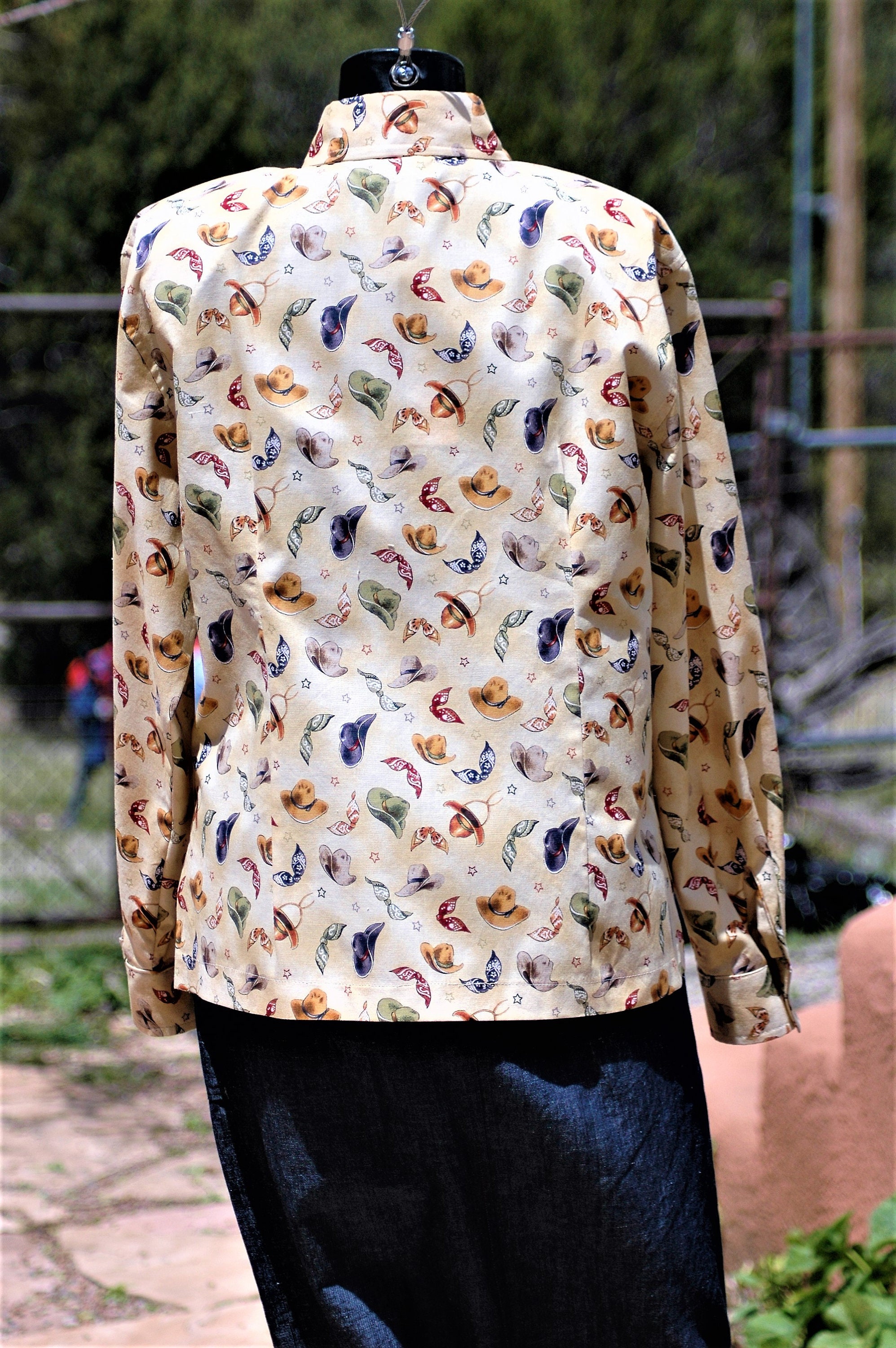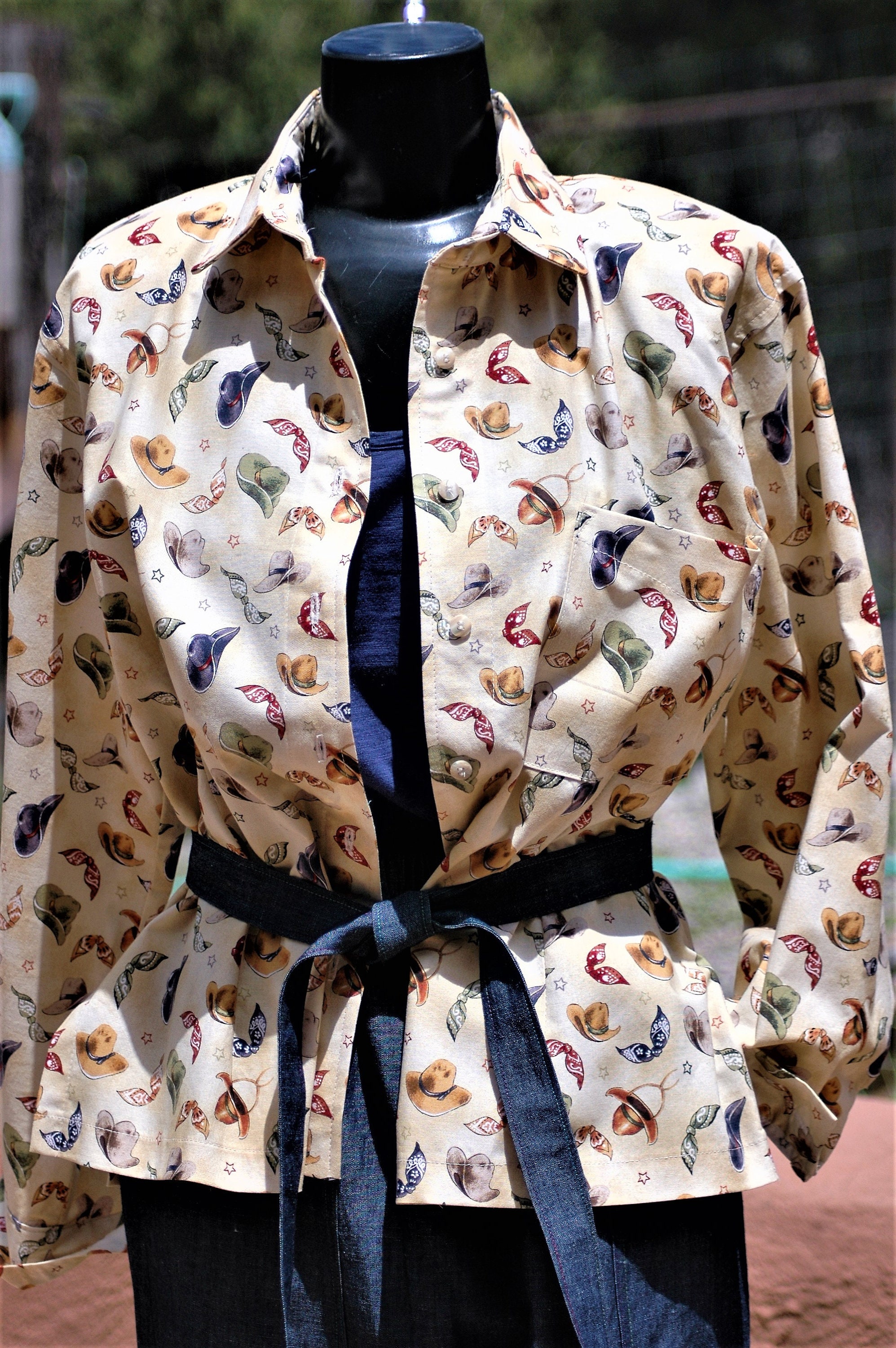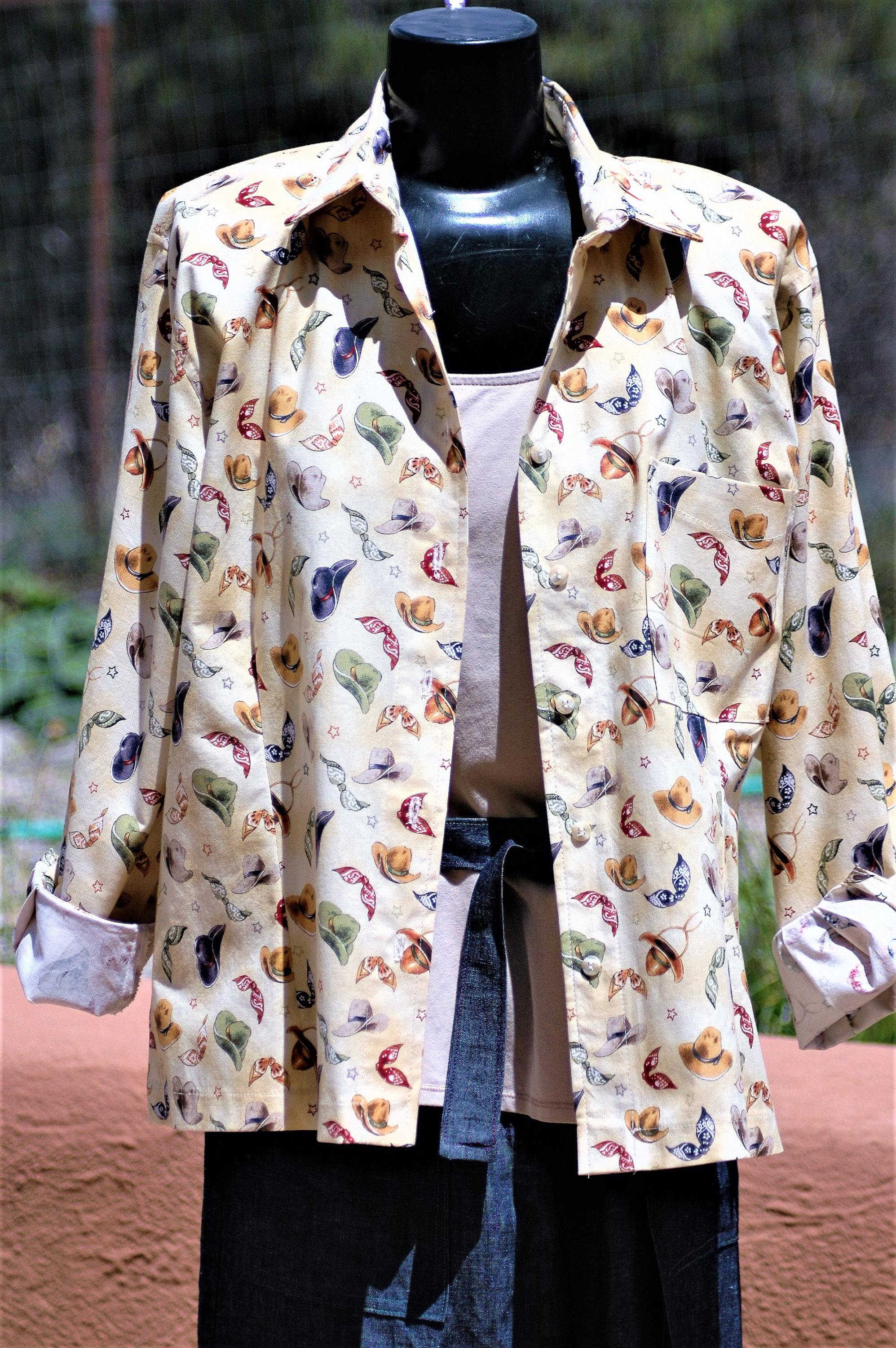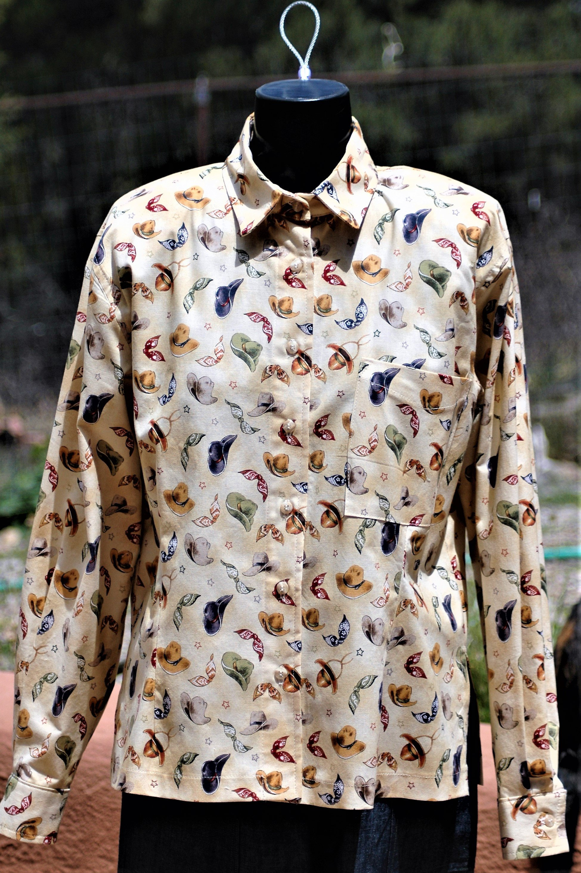 Cotton long sleeve button down shirt with a western motif. Has been pre-washed for shrinkage and softness. Easy fit, drop shoulder with darts front and back to give shape. Cotton shirt to wear many ways, as an over shirt with tank for summer or with a long sleeve "T".Go from the casual look to a nice belt with skirt or jeans. Being a natural fiber cotton breaths to keep you cool and comfrotable