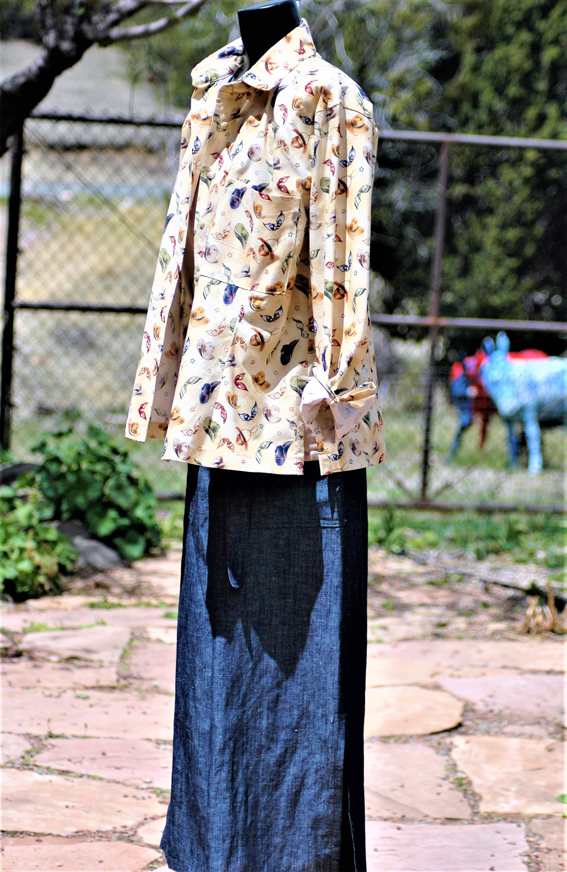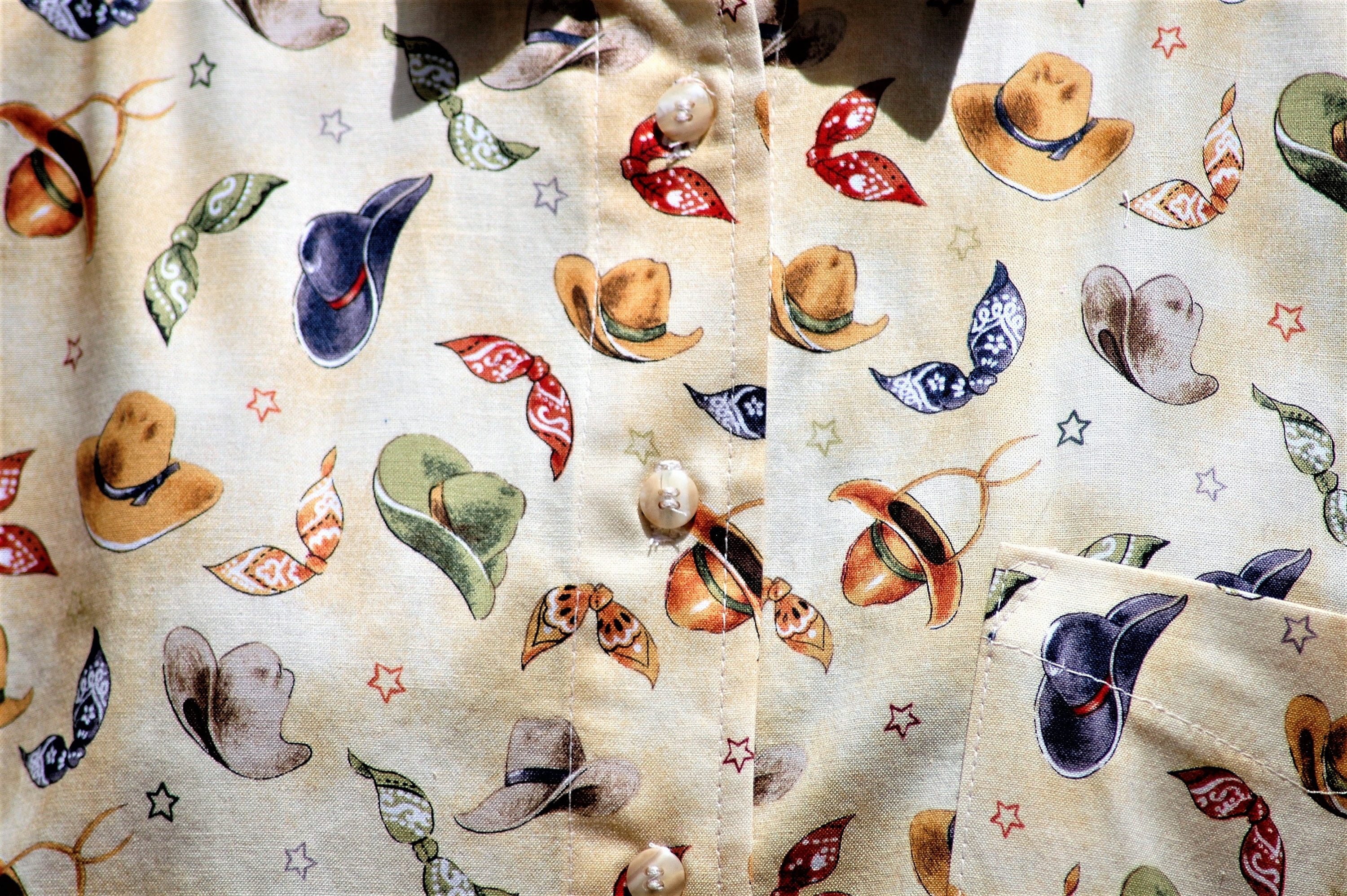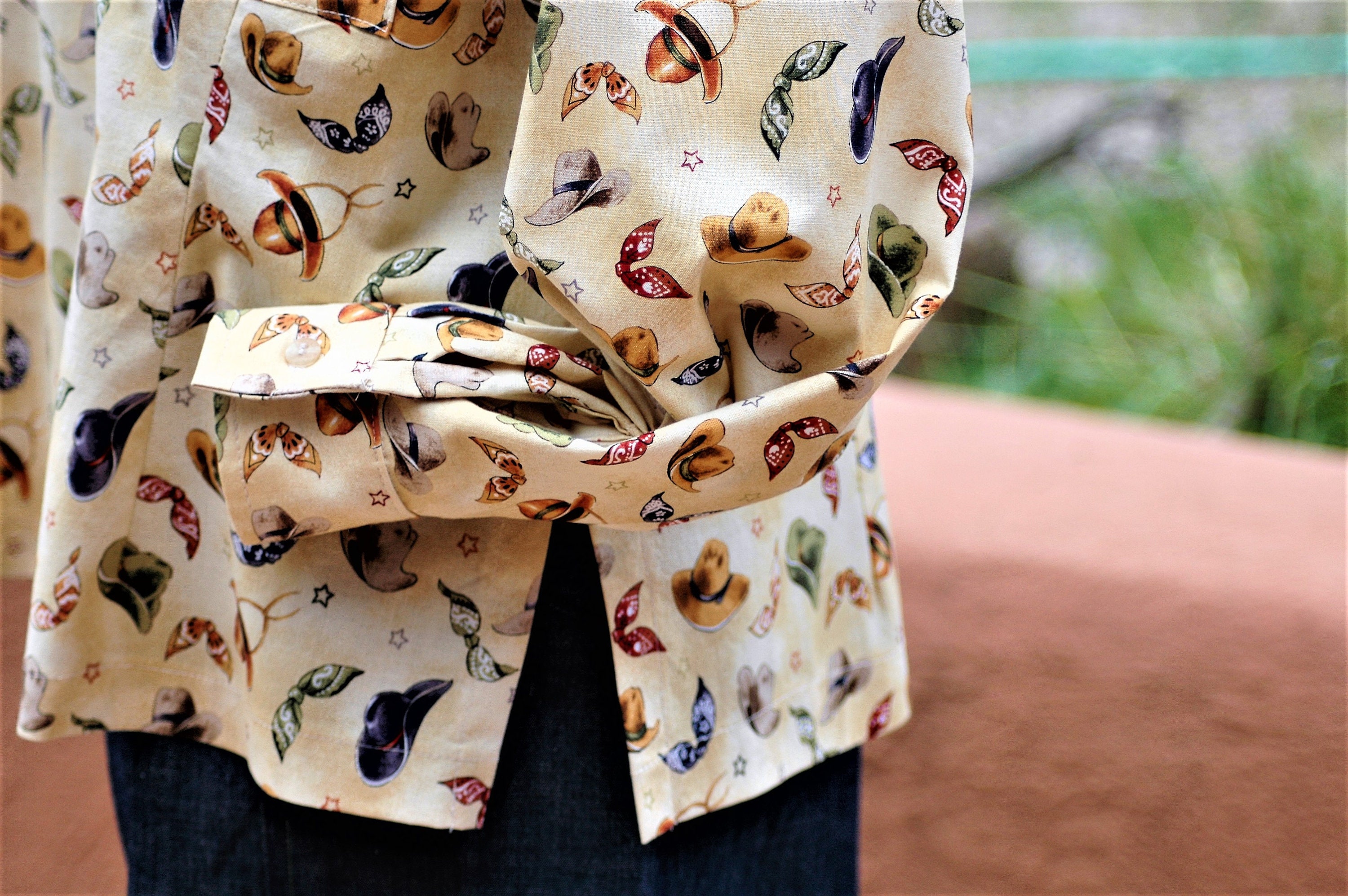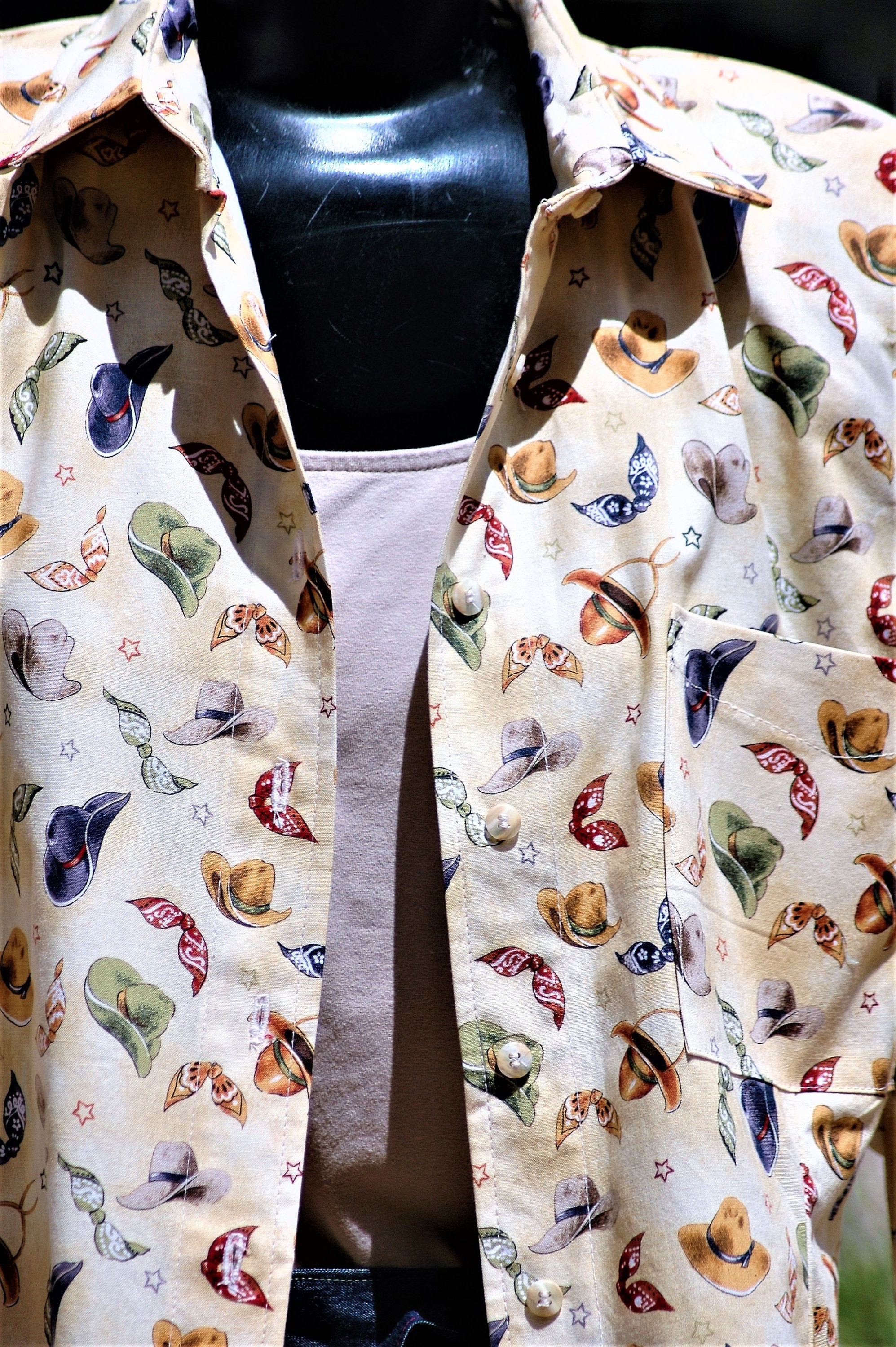 Cotton long sleeve button down shirt with a western motif. Has been pre-washed for shrinkage and softness. Easy fit, drop shoulder with darts front and back to give shape. Cotton shirt to wear many ways, as an over shirt with tank for summer or with a long sleeve "T".Go from the casual look to a nice belt with skirt or jeans. Being a natural fiber cotton breaths to keep you cool and comfrotable