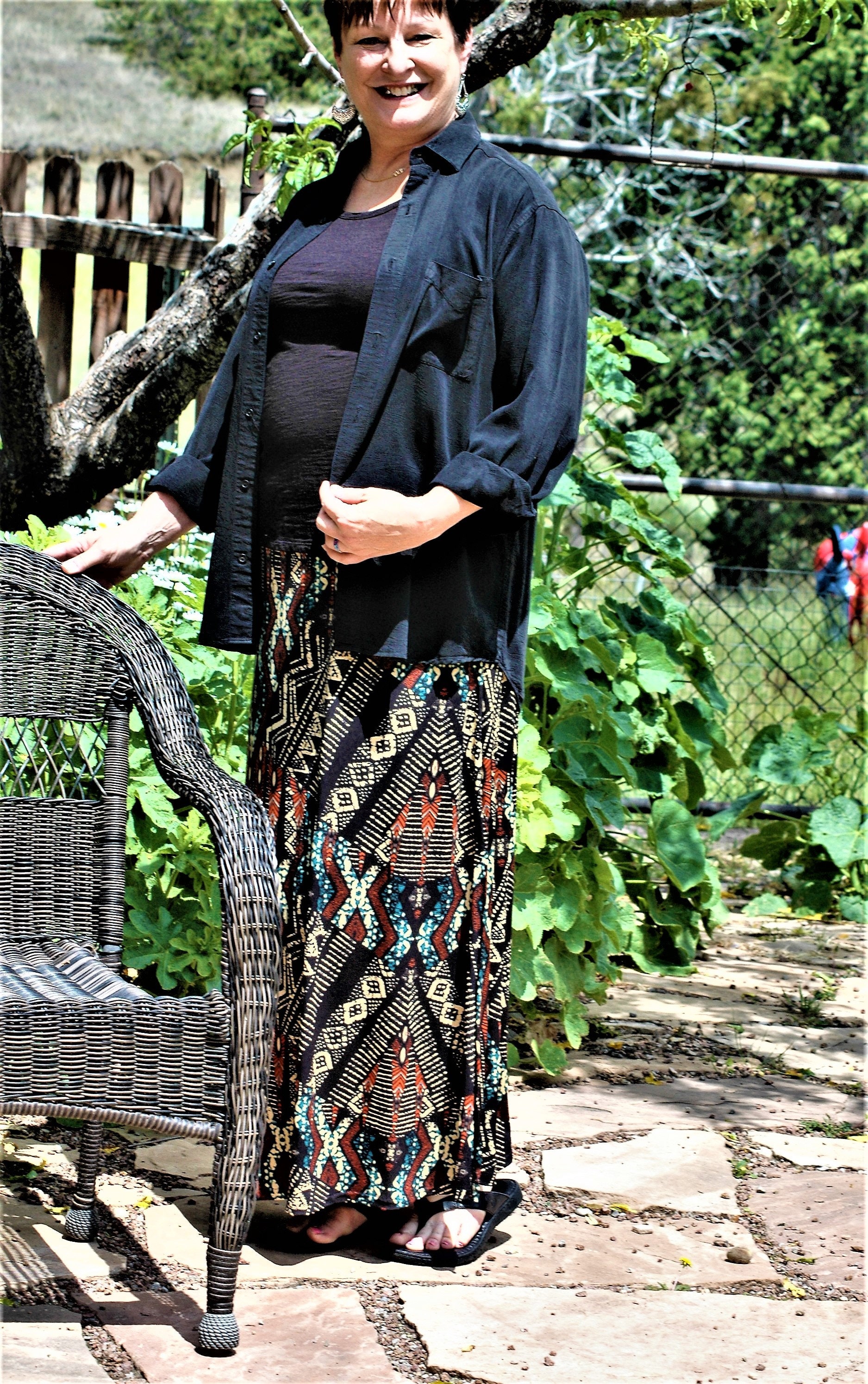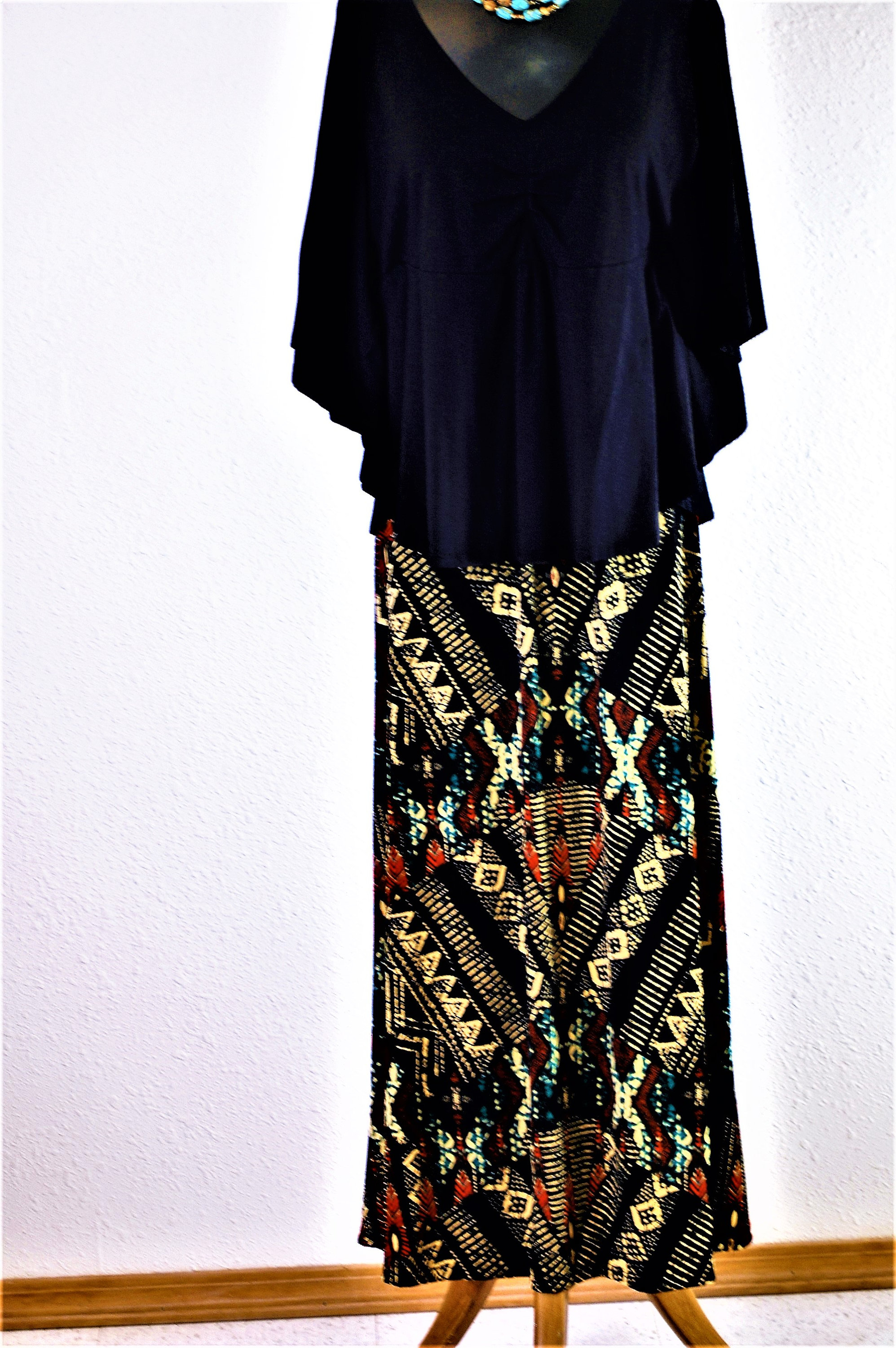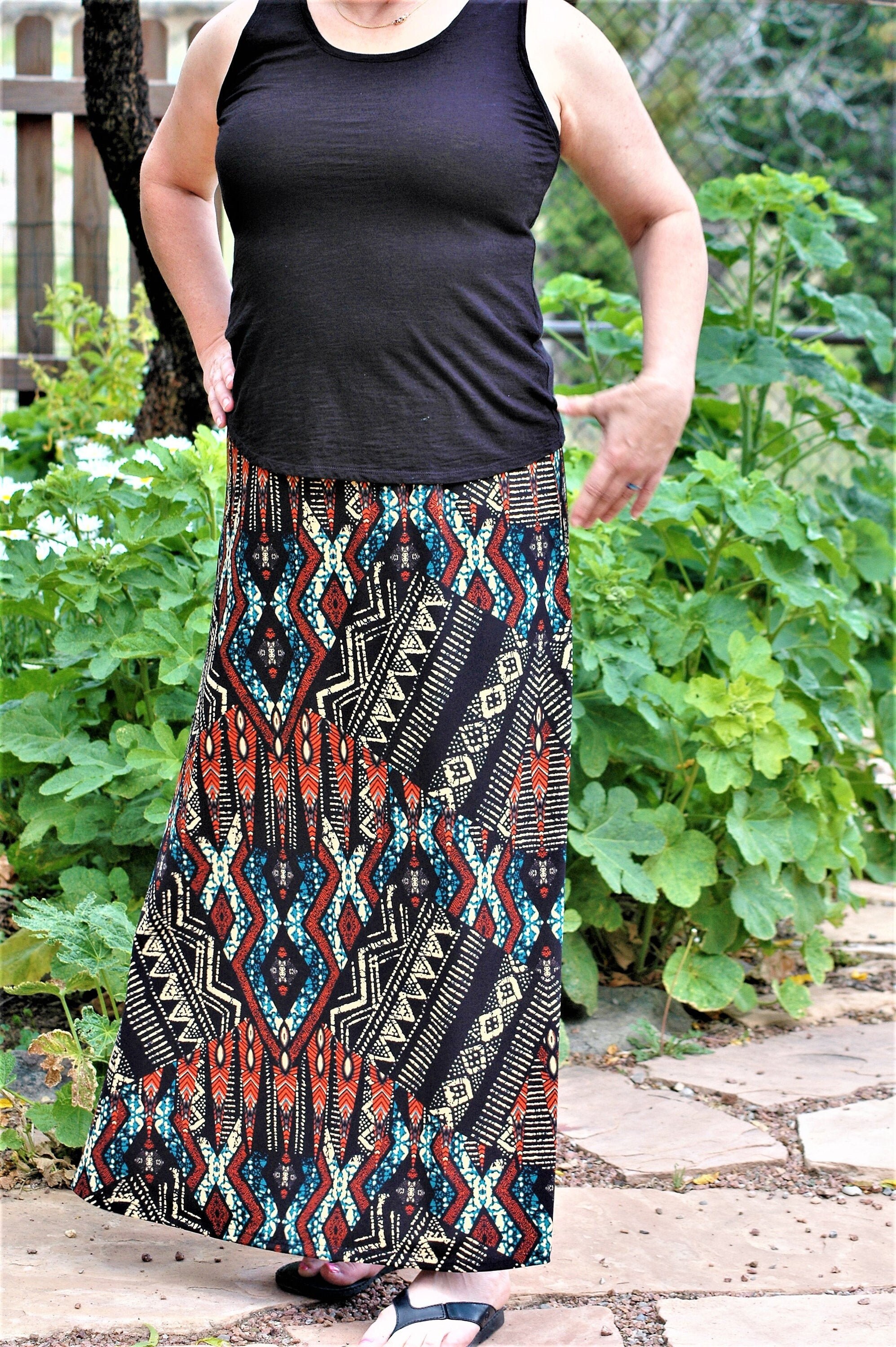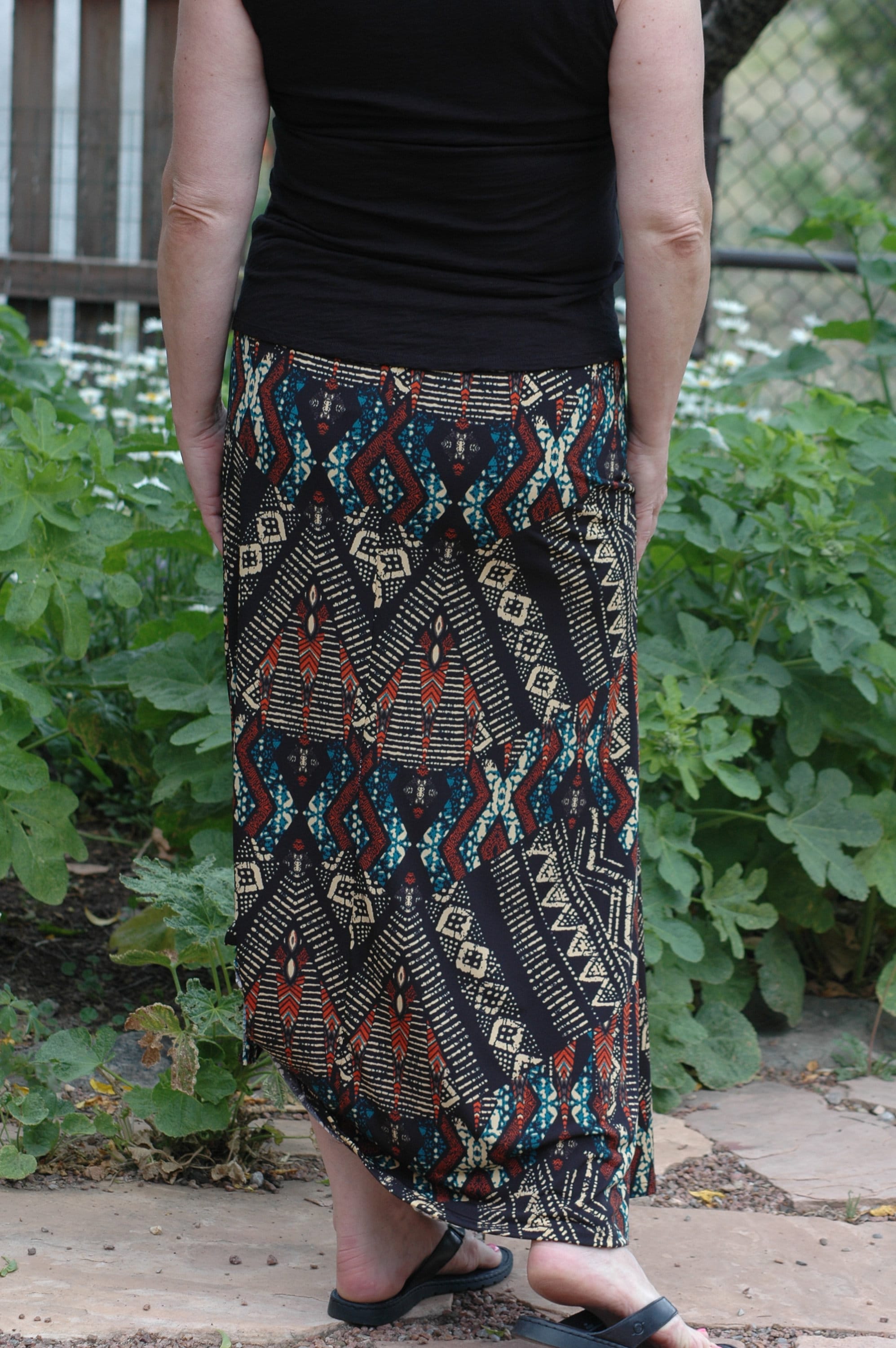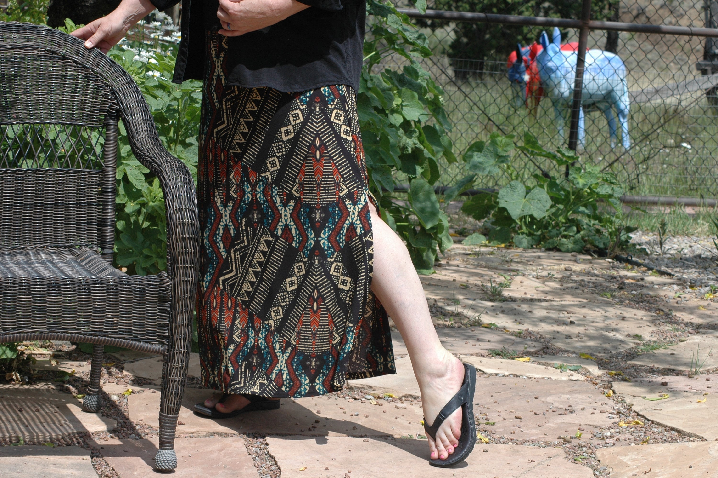 Full length slight A-Line with a nice long slit on left side. Very flattering fit for all body types, very easy and comfortable to wear and easy to pack and not wrinkle. "T" shirts to nice chunky sweaters for summer to winter has so much versatility. I love to travel in mine, just so comfortable when you have be traveling for so many hours, or in the summer when it is hot I find it to be cooler . Dress it up with a jacket , a beaded "T", funky sweater a great pair of sandals and chunky jewels.