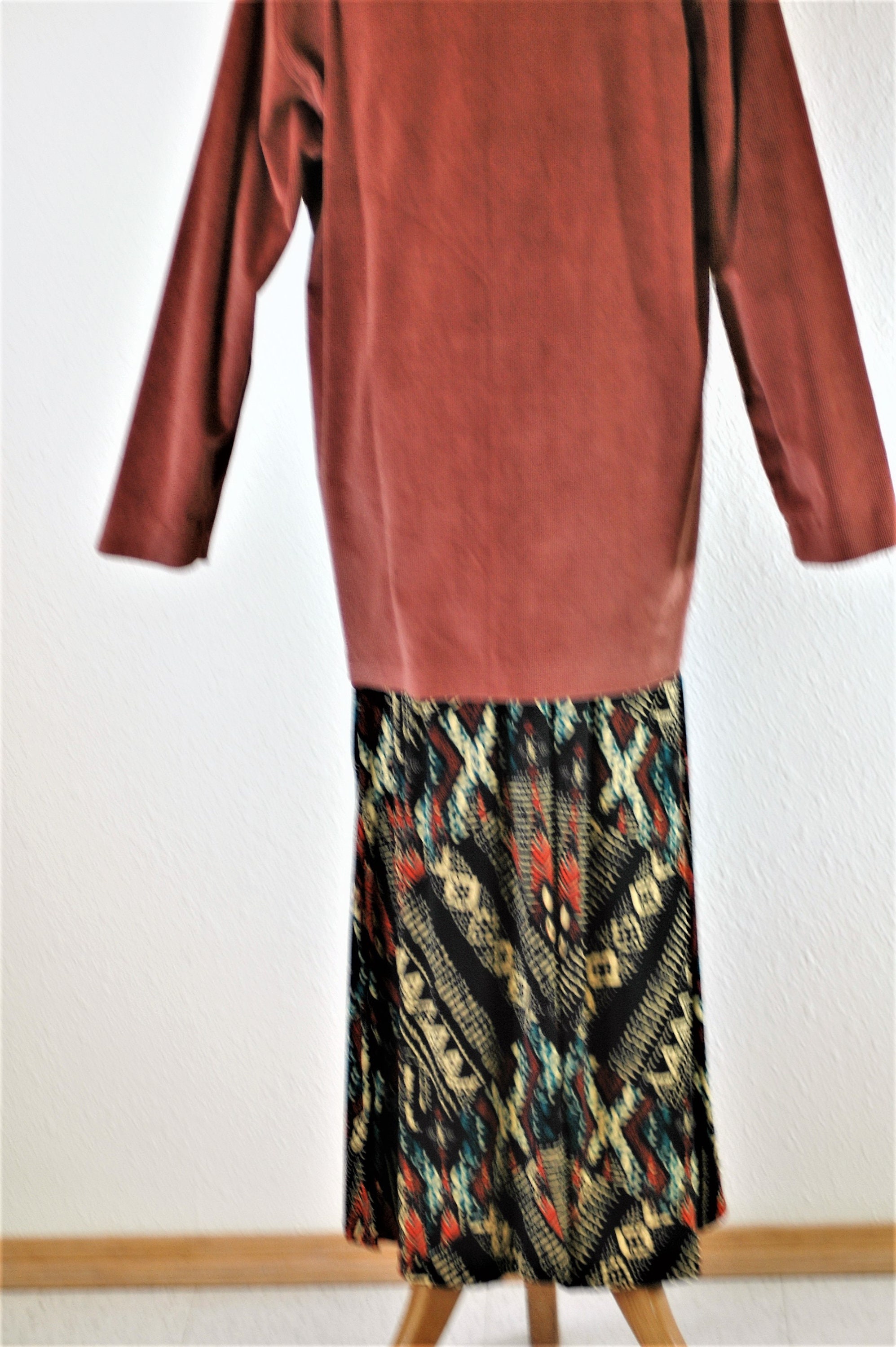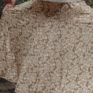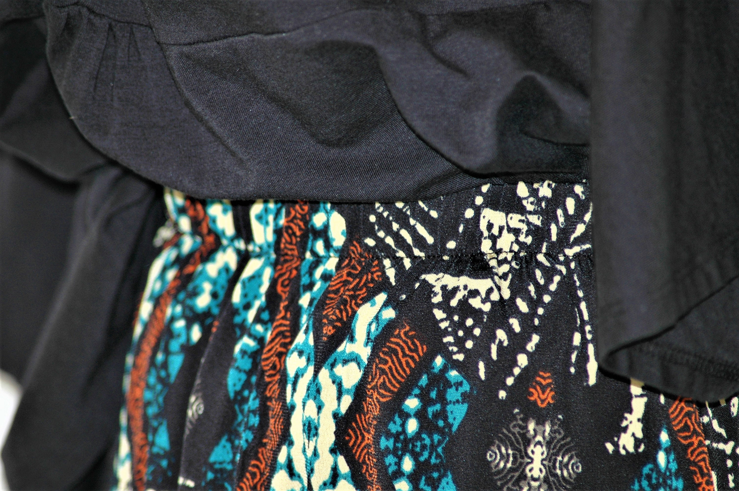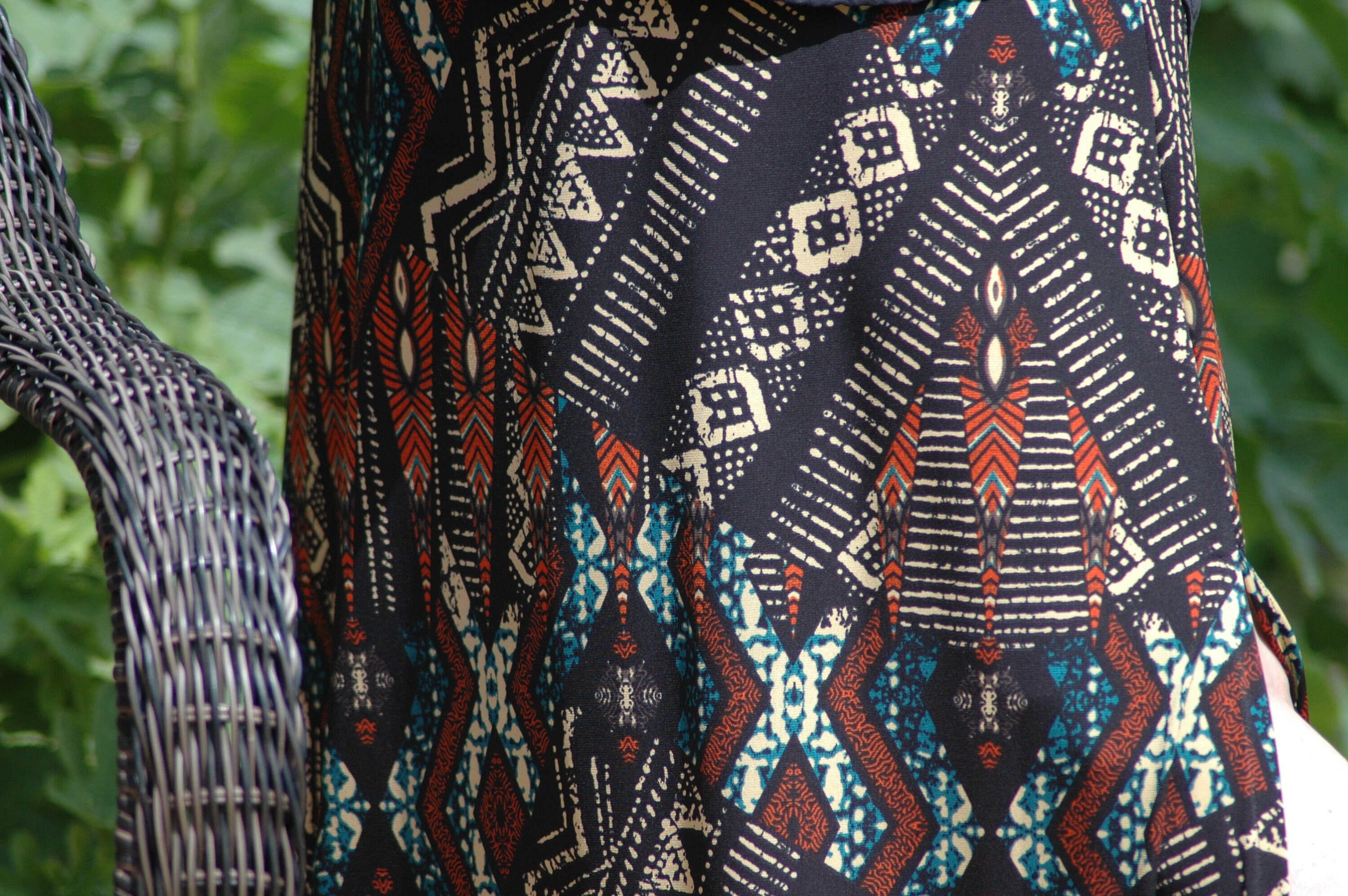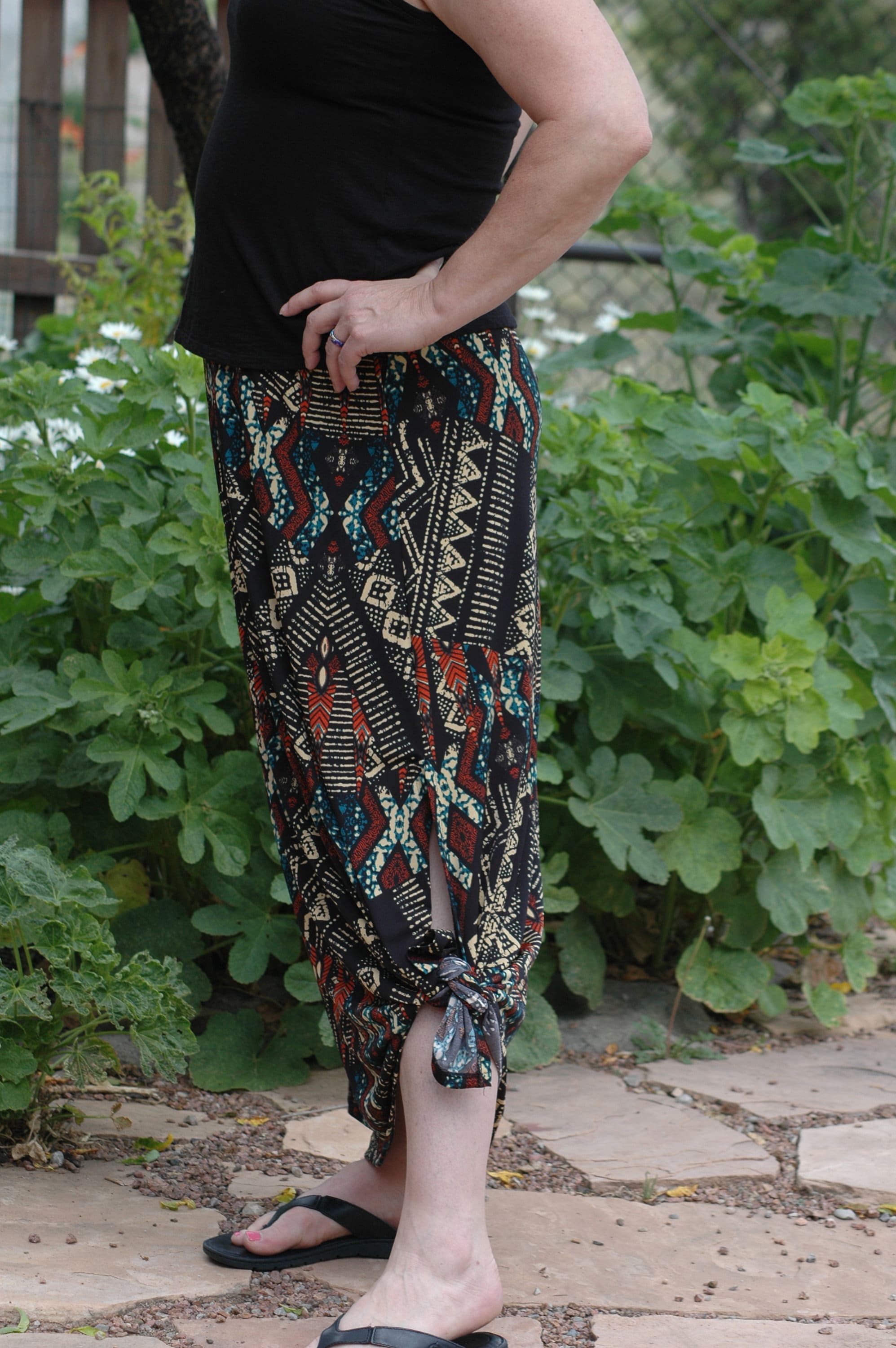 Full length slight A-Line with a nice long slit on left side. Very flattering fit for all body types, very easy and comfortable to wear and easy to pack and not wrinkle. "T" shirts to nice chunky sweaters for summer to winter has so much versatility. I love to travel in mine, just so comfortable when you have be traveling for so many hours, or in the summer when it is hot I find it to be cooler . Dress it up with a jacket , a beaded "T", funky sweater a great pair of sandals and chunky jewels.