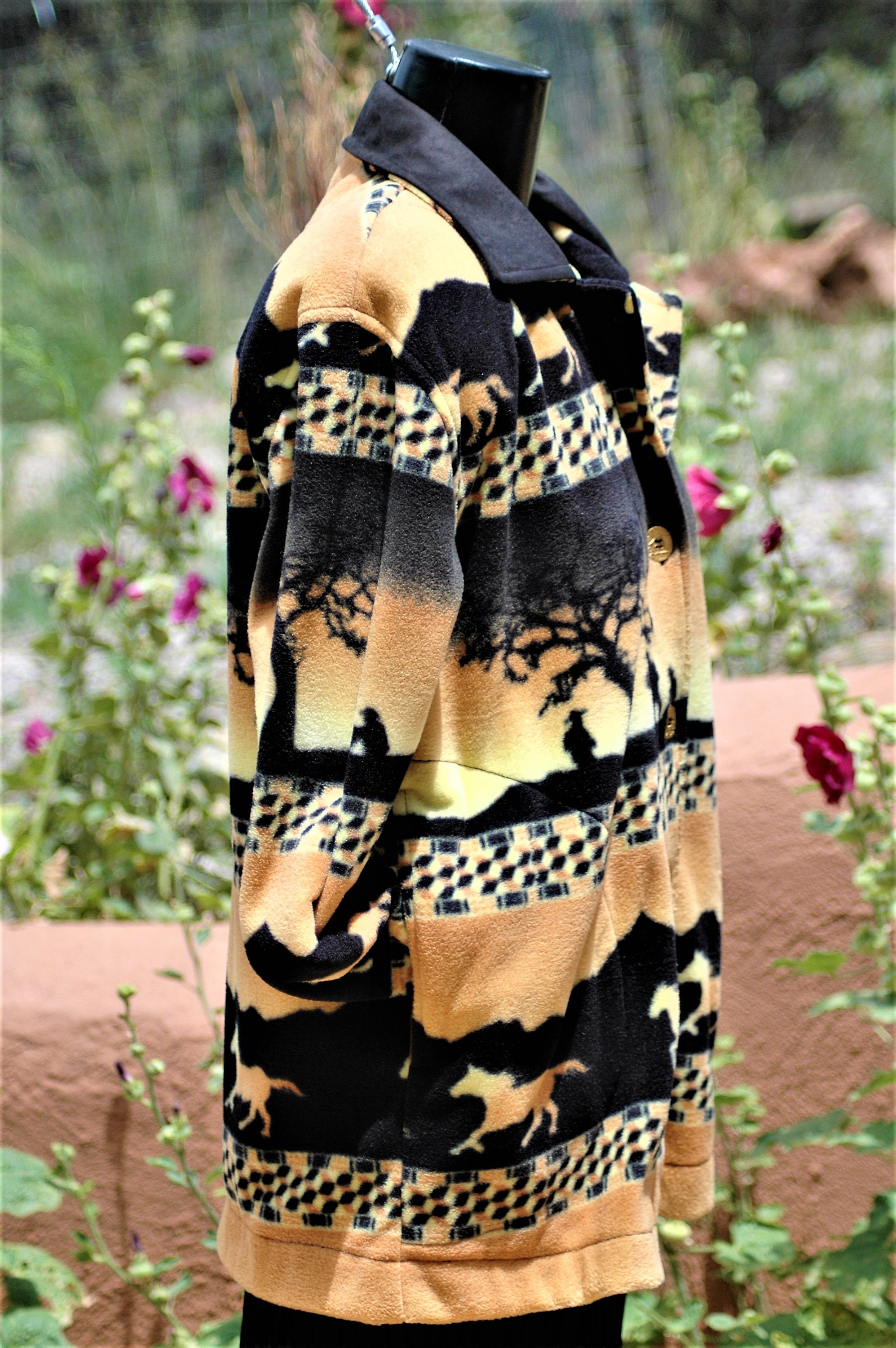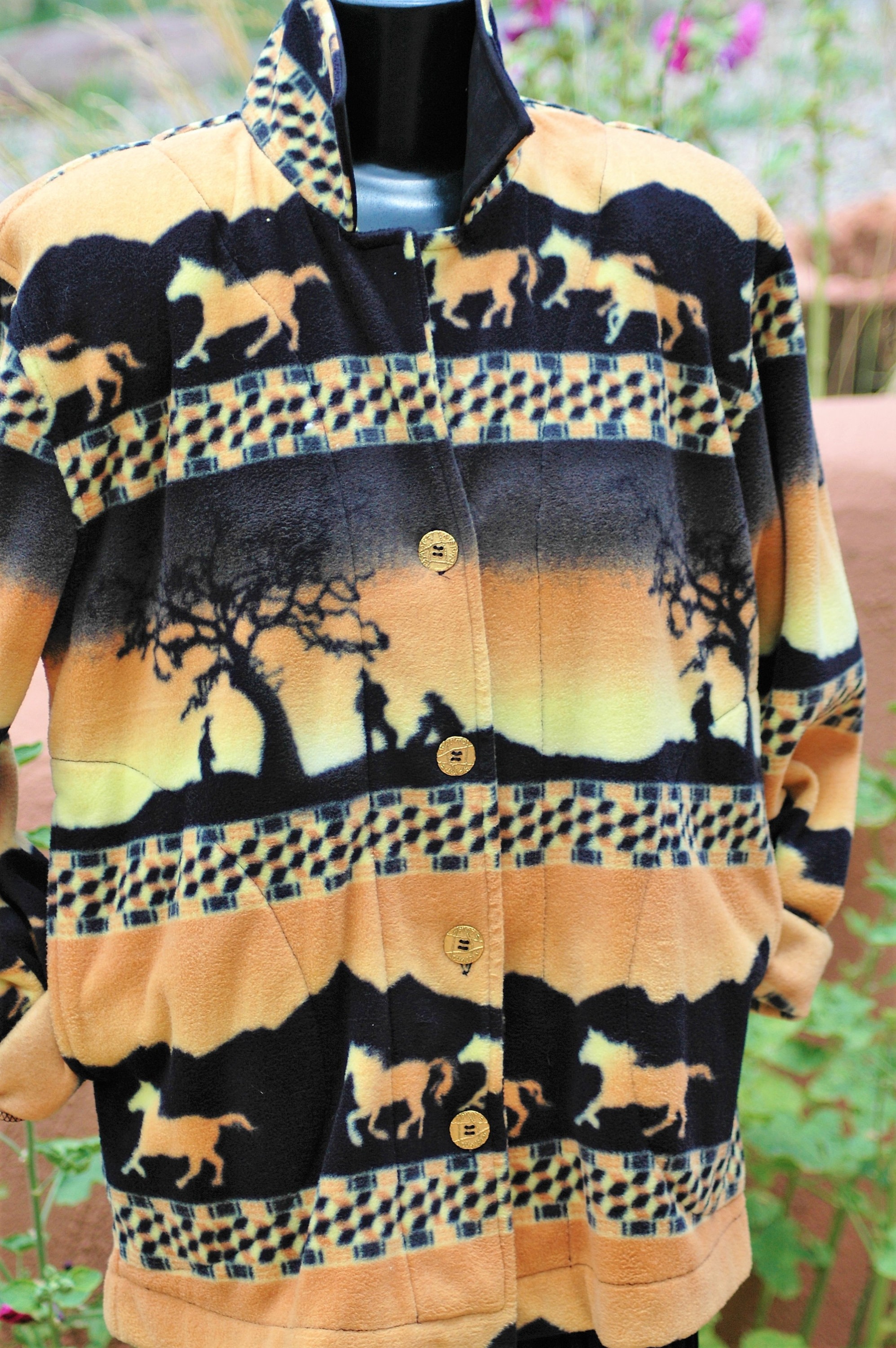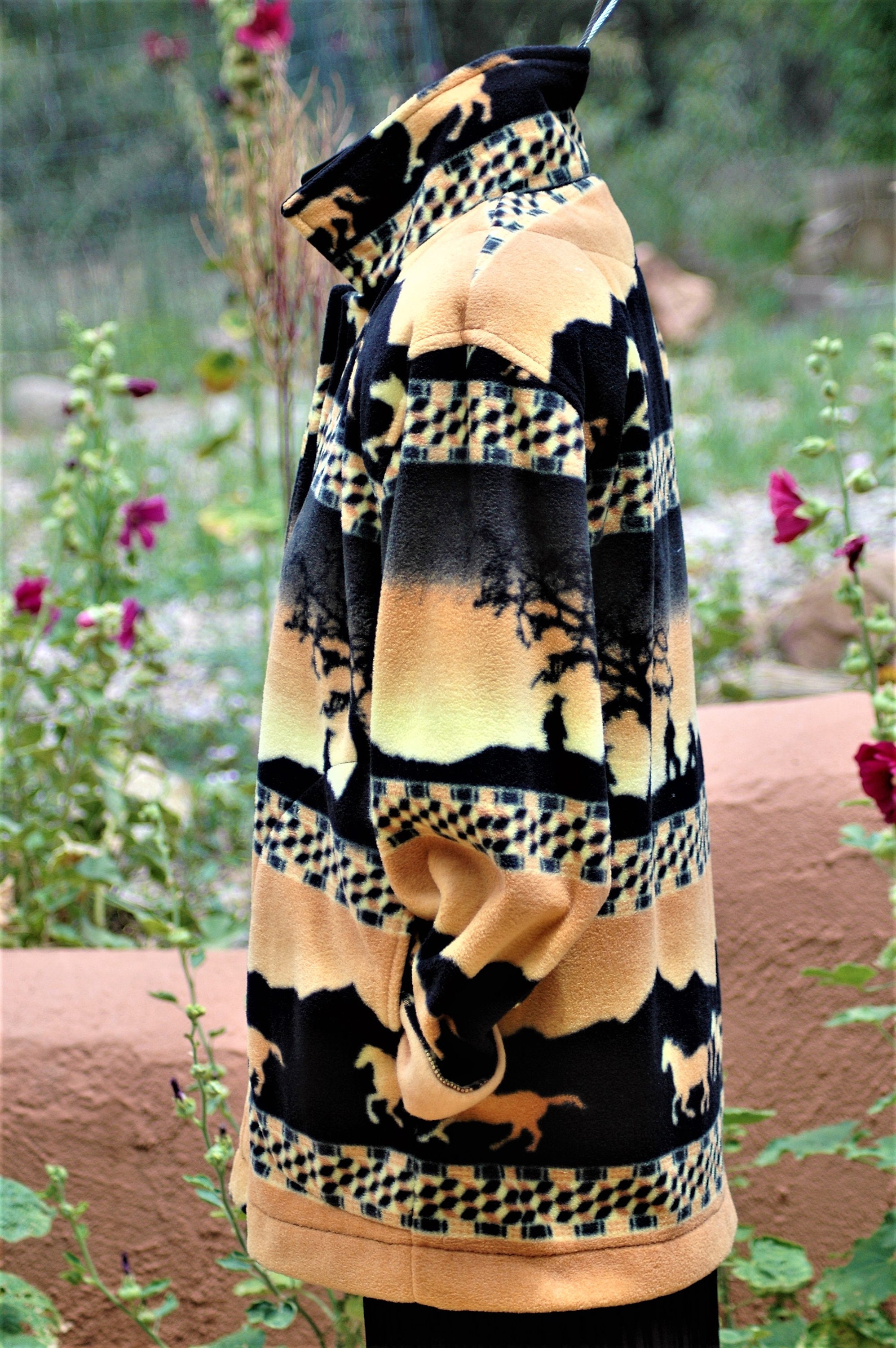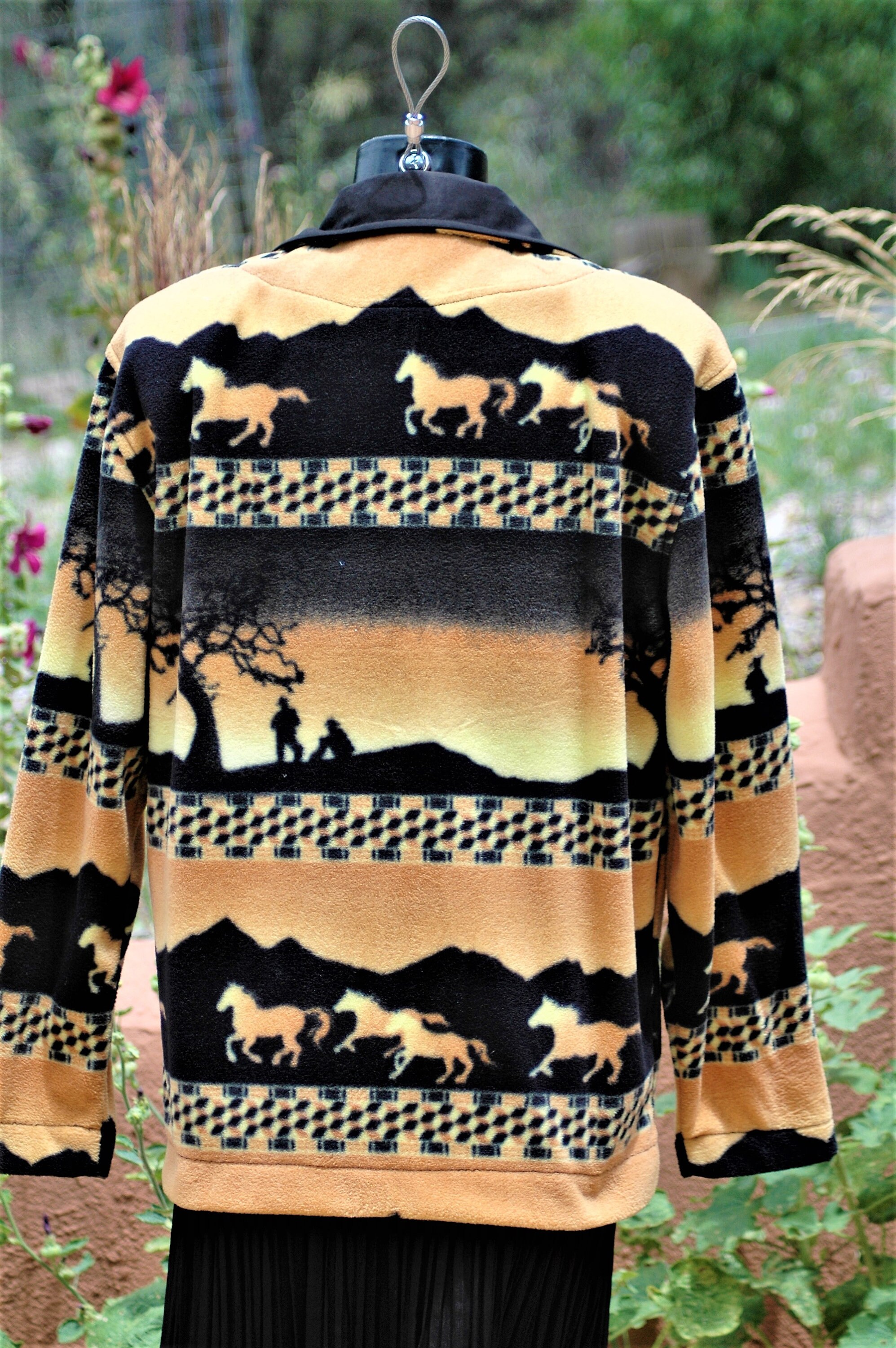 Western cowboy shadow on the range short jacket. Anti-pill velour fleece, light weight on, but soft and warm on. Very versatile little jacket from work to play from horse back to running errands .Great colorations very striking sure to get compliments.