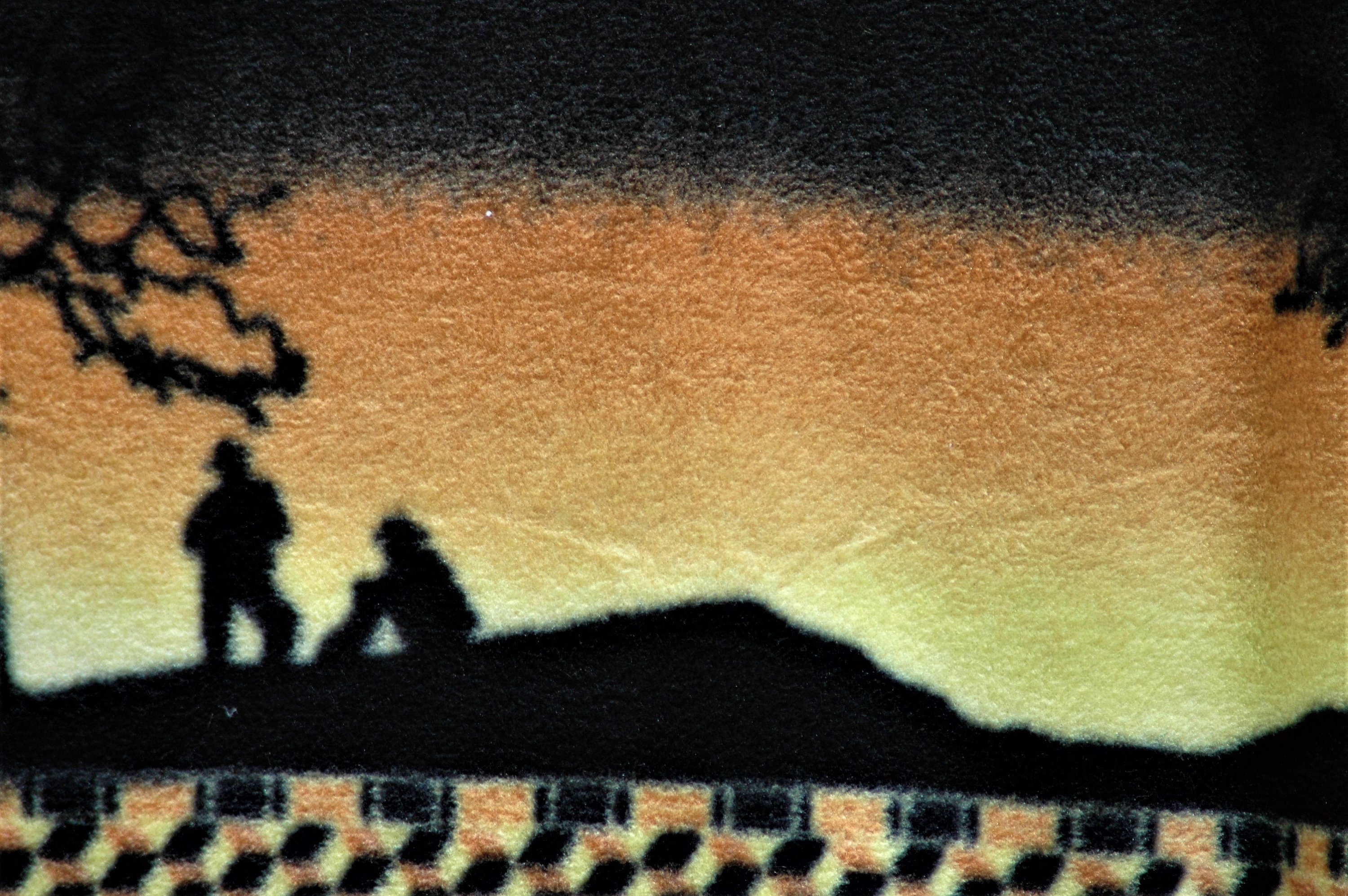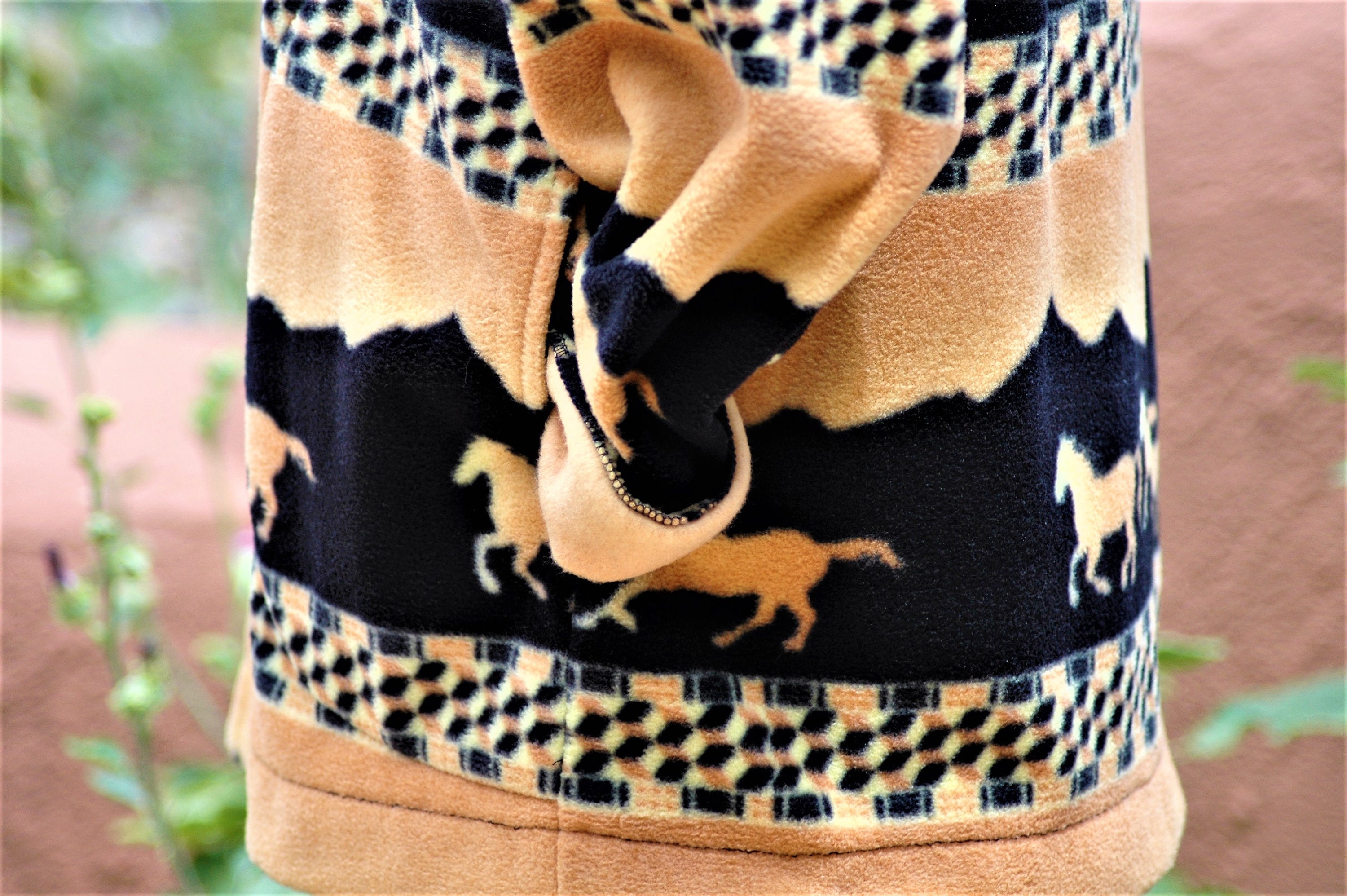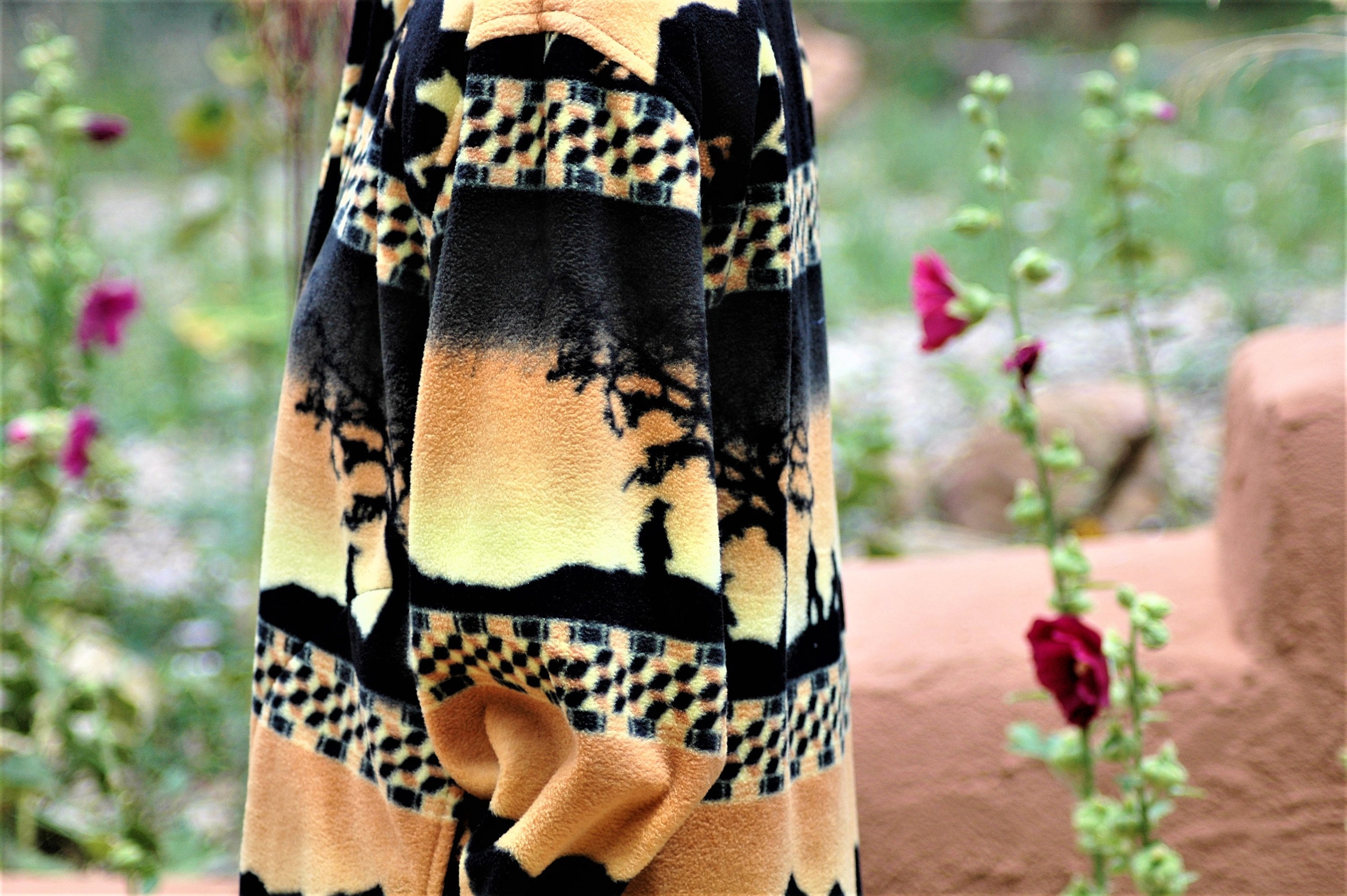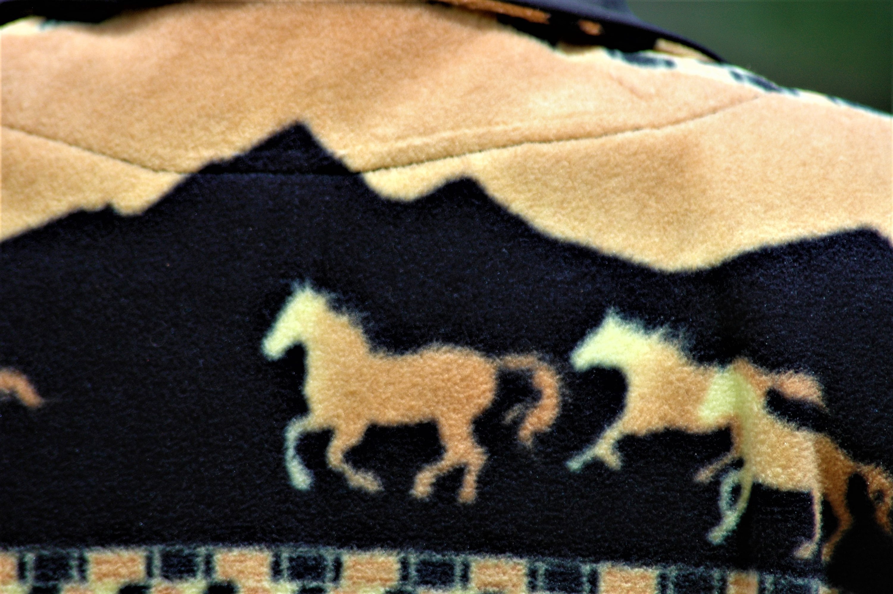 Western cowboy shadow on the range short jacket. Anti-pill velour fleece, light weight on, but soft and warm on. Very versatile little jacket from work to play from horse back to running errands .Great colorations very striking sure to get compliments.